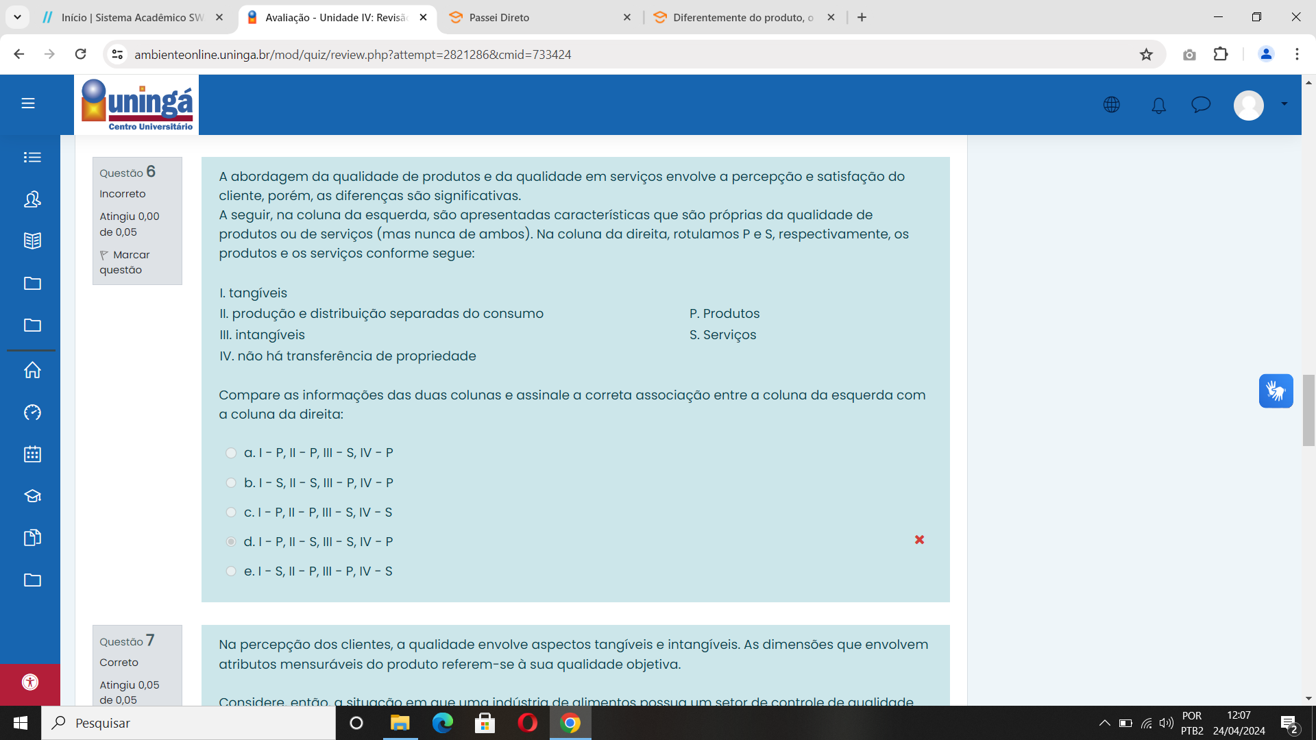 // Início Sistema Acadêmico SW Avaliação Unidade IV: Revisão Passei Direto Diferentemente do produto, + uningá Centro Universitário Questão 6 A abordagem da qualidade de produtos e da qualidade em serviços envolve a percepção e satisfação do Incorreto cliente, porém, as diferenças são significativas. Atingiu 0,00 A seguir, na coluna da esquerda, são apresentadas características que são próprias da qualidade de de 0,05 produtos ou de serviços (mas nunca de ambos). Na coluna do direita, rotulamos P e S, respectivamente, os Marcar produtos e os serviços conforme segue: questão I. tangíveis II. produção e distribuição separadas do consumo P. Produtos III. intangíveis S. Serviços IV. não há transferência de propriedade Compare as informações das duas colunas e a correta associação entre a da esquerda com a coluna da direita: P - P - S S. - S. IV - P x S Questão 7 Na percepção dos clientes, a qualidade envolve aspectos tangíveis e intangíveis. As dimensões que envolvem Correto atributos mensuráveis do produto referem-se à sua qualidade objetiva. Atingiu 0,05 de 0,05 Considere então a situação em que uma indústria de alimentos setor de controle de POR 12:07 Pesquisar PTB2 24/04/2024 2