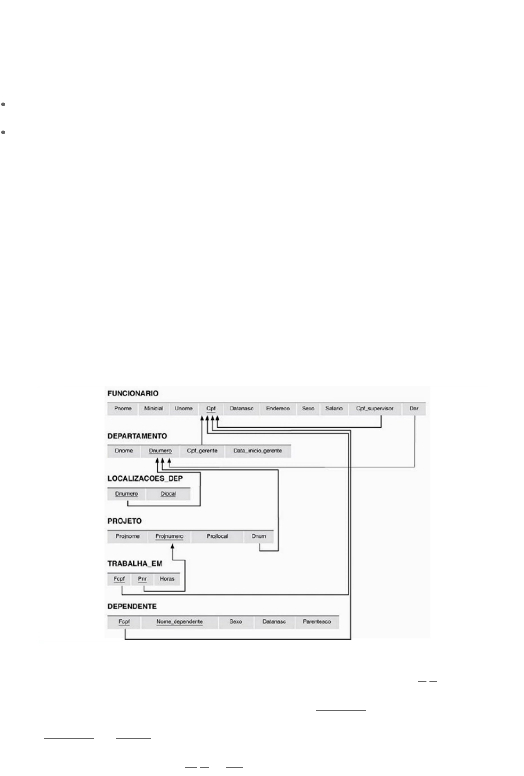 1.20 Operações sobre o Modelo Relacional Operações São categorizadas em: Recuperações: operações de consulta que especificam dados de interesse e uma nova relação é formada como resultado. Atualizações: operações básicas que mudam os estados das relações. Operações: atualização Inserir: inserem novos dados. Excluir: excluem novos dados. Alterar: modificam registros de dados existentes. IMPORTANTE Não devem violar as restrições da integridade especificadas. Esquema de BD relacional Descrição: Esquema em que se tem várias tabelas, com colunas de uma linha só. Na primeira, chamada FUNCIONARIO (em negrito), tem-se [Pnome], [Minicial], [Unome], [Cpf] (chave primária), [Datanasc], [Endereco], [Sexo], [Salario], [Cpf_supervisor] e [Dnr]. Na segunda, chamada DEPARTAMENTO (em negrito) tem-se [Dnome], [Dnumero] (chave primária), [Cpf_gerente] e [Data_inicio_gerente]. Na terceira, chamada LOCALIZACOES_DEP (em negrito), tem-se [Dnumero] e [Dlocal] (chave primária composta). Na quarta, chamada PROJETO, tem- se [Projnome], [Projnumero] (chave primária), [Projlocal] e [Dnum]. Na quinta, chamada TRABALHA_EM, tem-se [Fcpf], [ Pnr] (chave primária composta) e [Horas]. Na sexta e 03/07/2024, 10:48 ABD2023B: 1.20 Operações sobre o Modelo Relacional https://moodle.ifrs.edu.br/mod/page/view.php?id=289038&forceview=1 1/8 última, chamada DEPENDENTE (em negrito), tem-se [Fcpf] (chave primária), [Nome_dependente] (chave primária), [Sexo], [Datanasc] e [Parentesco]. Na primeira tabela, [Cpf] (chave primária) está sendo apontado por quatro flechas, partindo de [Cpf_supervisor] e itens de outras tabelas, são eles: [Cpf_gerente], [Pnr] (chave primária) e [Fcpf] (chave primária). Na quarta tabela, [Projnumero] (chave primária) está sendo apontado por uma flecha, que vem de [Pnr] (chave primária). Na segunda tabela, [Dnumero] (chave primária) está sendo apontado por três flechas que vem de ítens de outras tabelas, são eles: [Dnr], [Dnumero] (chave primária) e [Dnum]. Este esquema faz chaves estrangeiras utilizando setas, sendo que o valor que aponta é a chave primária e o valor que se inicia a seta é a chave estrangeira. FUNCIONARIO Pnome Minicial Unome Cpf Datanasc Endereco Sexo Salario Cpf_supervisor Dn João B Silva 12345678966 09-01- 1965 Rua das Flores, 751, São Paulo, SP M 30.000 33344555587 5 Fernando T Wong 33344555587 08-12- 1955 Rua da Lapa, 34, São Paulo, SP M 40.000 88866555576 5 Alice J Zelaya 99988777767 19-01- 1968 Rua Souza Lima, 35, Curitiba, PR F 25.000 98765432168 4 Jennifer S Souza 98765432168 20-06- 1941 Av. Arthur de Lima, 54, Santo André, SP F 43.000 88866555576 4 Ronaldo K Lima 66688444476 15-09- 1962 Rua Rebouças, 65, Piracicaba, SP M 38.000 33344555587 5 Joice A Leite 45345345376 31-07- 1972 Av. Lucas Obes, 74, São Paulo, SP F 25.000 33344555587 5 André V Pereira 98798798733 29-03- 1969 Rua Timbira, 35, São Paulo, SP M 25.000 98765432168 4 Jorge E Brito 88866555576 10-11- 1937 Rua do Horto, 35, São Paulo, SP M 55.000 NULL 1 Descrição da tabela: 03/07/2024, 10:48 ABD2023B: 1.20 Operações sobre o Modelo Relacional https://moodle.ifrs.edu.br/mod/page/view.php?id=289038&forceview=1 2/8 Cpf está sublinhado e portanto, é uma chave primária. Pnome: João; Minicial: B; Unome: Silva; Cpf: 12345678966; Datanasc: 09-01-1965; Endereço: Rua das Flores, 751, São Paulo, SP; Sexo: M; Salario: 30.000 Cpf_supervisor: 33344555587; Dnr: 5. Pnome: Fernando; Minicial: T; Unome: Wong; Cpf: 33344555587; Datanasc: 08-12-1955; Endereco: Rua da Lapa, 34, São Paulo, Sp; Sexo: M; Salario: 40.000; Cpf_supervisor: 88866555576; Dnr: 5. Pnome: Alice; Minicial: J; Unome: Zelaya; Cpf: 99988777767; Datanasc: 19-01-1968; Endereco: Rua Souza Lima, 35, Curitiba, PR; Sexo: F; Salario: 25.000; Cpf_supervisor: 98765432168; Dnr: 4. Pnome: Jennifer; Minicial: S; Unome: Souza; Cpf: 98765432168; Datanasc: 20-06-1941; Endereco: Av. Arthur de Lima, 54, Santo André, SP; Sexo: F; Salario: 43.000; Cpf_supervisor: 88866555576; Dnr: 4. Pnome: Ronaldo; Minicial: K; Unome: Lima; Cpf: 66688444476; Datanasc: 15-09-1962; Endereco: Rua Rebouças, 65, Piracicaba, SP; Sexo: M; Salario: 38.000; Cpf_supervisor: 33344555587; Dnr: 5. Pnome: Joice; Minicial: A; Unome: Leite; Cpf: 45345345376; Datanasc: 31-07-1972; Endereco: Av. Lucas Obes, 74, São Paulo, SP; Sexo: F; Salario: 25.000; Cpf_supervisor: 33344555587; Dnr: 5. Pnome: André; Minicial: V; Unome: Pereira; Cpf: 98798798733; Datanasc: 29-03-1969; Endereco: Rua Timbira, 35, São Paulo, SP; Sexo: M; Salario: 25.000; Cpf_supervisor: 98765432168; Dnr: 4. Pnome: Jorge; Minicial: E; Unome: Brito; Cpf: 88866555576; Datanasc: 10-11-1937; Endereco: Rua do Horto, 35, São Paulo, SP; Sexo: M; Salario: 55.000; Cpf_supervisor: NULL; Dnr: 1. DEPARTAMENTO Dnome Dnumero Cpf_gerente Data_inicio_gerente Pesquisa 5 33344555587 22-05-1988 Administração 4 98765432168 01-01-1995 Matriz 1 88866555576 19-06-1981 Descrição da tabela: Dnumero está sublinhado e portanto, é uma chave primária. Dnome: Pesquisa; Dnumero: 5; Cpf_gerente: 33344555587; Data_inicio_gerente: 22-05-1988 Dnome: Administração; Dnumero: 4; Cpf_gerente: 98765432168; Data_inicio_gerente: 01-01-1995 Dnome: Matriz; Dnumero: 1; Cpf_gerente: 88866555576; Data_inicio_gerente: 19-06-1981 TRABALHA_EM Fcpf Pnr Horas 12345678966 1 32,5 12345678966 2 7,5 66688444476 3 40,0 45345345376 1 20,0 03/07/2024, 10:48 ABD2023B: 1.20 Operações sobre o Modelo Relacional https://moodle.ifrs.edu.br/mod/page/view.php?id=289038&forceview=1 3/8 Fcpf Pnr Horas 45345345376 2 20,0 33344555587 2 10,0 33344555587 3 10,0 33344555587 10 10,0 33344555587 20 10,0 99988777767 30 30,0 99988777767 10 10,0 98798798733 10 35,0 98798798733 30 5,0 98798798733 30 20,0 98798798733 20 15,0 88866555576 20 NULL Descrição da tabela Fcpf e Pnr estão sublinhados e portanto, compõem uma chave primária composta. Fcpf: 12345678966; Pnr: 1; Horas: 32,5. Fcpf: 12345678966; Pnr: 2; Horas: 7,5. Fcpf: 66688444476; Pnr: 3; Ho