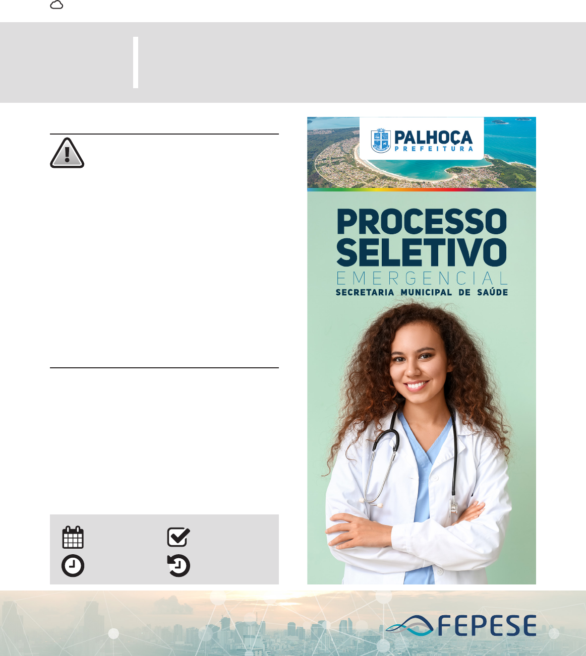 C A D E R N O D E P R O V A Município de Palhoça Concurso Público • Edital 010/PMP/2024 https://2024emergencialsaudepalhoca.fepese.org.br M1 Assistente Administrativo Instruções Confira o número que você obteve no ato da inscrição com o que está indicado no cartão- resposta. * A duração da prova inclui o tempo para o preenchimento do cartão-resposta. Para fazer a prova você usará: � este caderno de prova. � um cartão-resposta que contém o seu nome, número de inscrição e espaço para assinatura. Verifique, no caderno de prova, se: � faltam folhas e a sequência de questões está correta. � há imperfeições gráficas que possam causar dúvidas. Comunique imediatamente ao fiscal qualquer irregularidade! Atenção! � Não é permitido qualquer tipo de consulta durante a realização da prova. � Para cada questão são apresentadas 5 alternativas diferentes de respostas (a, b, c, d, e). Apenas uma delas constitui a resposta correta em relação ao enunciado da questão. � A interpretação das questões é parte integrante da prova, não sendo permitidas perguntas aos fiscais. � Não destaque folhas da prova. Ao terminar a prova, entregue ao fiscal o caderno de prova completo e o cartão-resposta devidamente preenchido e assinado. 16 de junho 14 às 17h30 35 questões 3h30 de duração* . Página 3 Município de Palhoça • Concurso Público • Edital 010/PMP/2024 M1 Assistente Administrativo Língua Portuguesa 10 questões Texto Leia atentamente o texto abaixo. Longevidade: os desafios de viver mais e melhor No começo do século XIX, alguém que passasse dos 35 anos já podia ser considerado uma pessoa de sorte, algo bem distante da realidade que vivemos. Um novo estudo, publicado em janeiro deste ano na renomada revista Plos One, mostra que a longevidade está aumentando em praticamente todos os países. Nas nações com melhor índice, como o Japão, alguns países da Europa e também na América do Norte, a esperança média de vida já ultrapassa os 80 anos e a perspectiva é de que, até 2030, seja de 83 anos para os homens e 86 para as mulheres. No Brasil, ela vol- tou a subir após a pandemia da Covid-19 e chegou, segundo pesquisa do IBGE (Instituto Brasileiro de Geografia e Estatística), em 2022, a uma média de 75,5 anos – 72 para homens e 79 para mulheres. Graças ao avanço da medicina e da tecnologia, esta- mos prolongando nossa presença na Terra, mas é pouco provável que se descubra a poção da juven- tude. Por conseguinte, ao proporcionarmos mais décadas de vida, precisamos pensar na qualidade da saúde, da segurança e de outros fatores importantes para garantir que possamos, além de viver mais, viver melhor. Isso passa pela criação de políticas públicas voltadas aos idosos e atuação eficaz dos governantes e instituições para garantir qualidade de vida a uma fatia da sociedade que cresce exponencialmente. A recente atuação da operação “Repouso Seguro”, que interditou uma casa de repouso que atuava clandesti- namente, sem alvará sanitário, em Florianópolis, é um exemplo de união de esforços. Neste caso, o Procon, a Vigilância Sanitária e os Conselhos Regionais de Fisio- terapia e Terapia Ocupacional, de Enfermagem e de Nutricionistas, se uniram para fiscalizar as condições de atendimento em clínicas geriátricas da Capital. Ações de fiscalização como estas também precisam estar contempladas nos programas de governo, sejam eles municipais, estaduais ou nacionais. A expectativa é que isso aconteça em âmbito federal, pois o atual presidente do Brasil, que tem 78 anos, disse durante uma entrevista que quer uma política especial voltada aos idosos que não têm uma estru- tura de assistência. Se já é consenso que a primeira grande revolução foi ampliar a média de vida, a segunda é aprender a lidar, juntos, com os impactos deste feito. NDmais, Santa Catarina, ano 17. No 5561, Janeiro de 2024. Adaptado. 1. Identifique abaixo as afirmativas verdadeiras ( V ) e as falsas ( F ) de acordo com o texto. ( ) O número de idosos cresceu extraordinaria- mente em todos os países. ( ) Com a média de vida ampliada, precisamos agora lidar com todos os impactos que esta acarreta. ( ) Após a pandemia da Covid-19, a expectativa de vida decresceu no Brasil. Assinale a alternativa que indica a sequência correta, de cima para baixo. a. SQUARE V • V • F b. SQUARE V • F • F c. SQUARE F • V • V d. Check-square F • V • F e. SQUARE F • F • V 2. Complete a frase abaixo de acordo com a ortogra- fia oficial da Língua Portuguesa. Tiago fez uma ao a visita que inadvertidamente na de livros raros da sua estante. Assinale a alternativa que completa corretamente as lacunas do texto. a. Check-square exceção • cumprimentar • mexeu • prateleira b. SQUARE exceção • comprimentar • mecheu • prateleira c. SQUARE excessão • comprimentar • mexeu • pratileira d. SQUARE excessão • cumprimentar • mexeu • pratileira e. SQUARE excessão • cumprimentar • mecheu • prateleira 3. Assinale a alternativa em que todas as palavras foram corretamente acentuadas. a. SQUARE baú • pólo • tireóide b. SQUARE acém • enjôo • resíduo c. Check-square névoa • cafeína • bíceps d. SQUARE açúcares • epopéia • ciúme e. SQUARE nômade • anéis • paranóico Página 4 Município de Palhoça • Concurso Público • Edital 010/PMP/2024 M1 Assistente Administrativo 4. Assinale a alternativa em que o emprego do sinal indicativo de crase está correto. a. Check-square Durante o feriado, voltou à casa de seus pais. b. SQUARE Um pouco de ternura não faz mal à ninguém. c. SQUARE Não ia à qualquer farmácia. Preferia as homeopáticas. d. SQUARE Frente à frente com o perigo, decidiu ser cauteloso! e. SQUARE Aquele é o funcionário à quem entregamos o documento. 5. Assinale a única alternativa em que o sujeito é indeterminado. a. SQUARE Faz duas horas que o trem pas