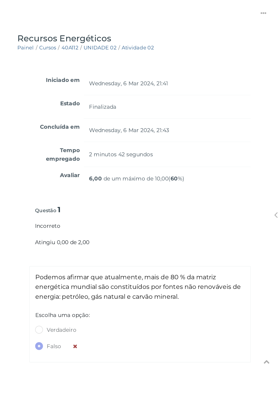 06/03/2024, 21:43 Atividade 02 https://ava.politecnicabr.com.br/mod/quiz/review.php?attempt=6435760 1/5 Painel / Cursos / 40A112 / UNIDADE 02 / Atividade 02 Recursos Energéticos Iniciado em Wednesday, 6 Mar 2024, 21:41 Estado Finalizada Concluída em Wednesday, 6 Mar 2024, 21:43 Tempo empregado 2 minutos 42 segundos Avaliar 6,00 de um máximo de 10,00(60%) Questão 1 Incorreto Atingiu 0,00 de 2,00 Podemos a�rmar que atualmente, mais de 80 % da matriz energética mundial são constituídos por fontes não renováveis de energia: petróleo, gás natural e carvão mineral. Escolha uma opção: Verdadeiro Falso https://ava.politecnicabr.com.br/my/ https://ava.politecnicabr.com.br/my/ https://ava.politecnicabr.com.br/course/index.php https://ava.politecnicabr.com.br/course/view.php?id=1054 https://ava.politecnicabr.com.br/course/view.php?id=1054#section-3 https://ava.politecnicabr.com.br/mod/quiz/view.php?id=35035 https://ava.politecnicabr.com.br/ 06/03/2024, 21:43 Atividade 02 https://ava.politecnicabr.com.br/mod/quiz/review.php?attempt=6435760 2/5 Questão 2 Correto Atingiu 2,00 de 2,00 Novas tecnologias estão em constante pesquisa e desenvolvimento, o que torna o assunto de armazenamento de energia um assunto tão empolgante quanto inesgotável. Considera-se que a forma como a energia é armazenada está mais diretamente ligada à fonte de energia e deve-se ter isso em mente para compreender as aplicações dos métodos de armazenamento. São métodos para manter a energia em um campo elétrico. Nessa categoria encontramos os capacitores e supercapacitores, também conhecidos como capacitores de dupla camada, assim como as bobinas supercondutoras. Escolha uma opção: a. Armazenamentos de energia térmica b. Armazenamentos diretos de energia elétrica c. Armazenamentos de energia mecânica d. Armazenamentos químicos de energia e. Armazenamentos eletroquímicos de energia https://ava.politecnicabr.com.br/mod/resource/view.php?id=35034 https://ava.politecnicabr.com.br/mod/resource/view.php?id=35034 https://ava.politecnicabr.com.br/ 06/03/2024, 21:43 Atividade 02 https://ava.politecnicabr.com.br/mod/quiz/review.php?attempt=6435760 3/5 Questão 3 Correto Atingiu 2,00 de 2,00 A quantidade e a natureza química e física desse material particulado estão estreitamente relacionadas com o tipo de combustível, em especial dos combustíveis sólidos e líquidos. Do ponto de vista de controle ambiental, é também considerado material particulado na taxa de emissão total de material sólido emitido por vapores condensados. Marque a alternativa correta. Escolha uma opção: a. As cinzas são óxidos formados a partir de elementos inorgânicos presentes na composição do combustível e oxidados na chama. b. Cenosferas são partículas resultantes da coquei�cação de gotas do combustível, as quais são emitidas para a atmosfera se não oxidadas na câmara de combustão. c. Coque são óxidos formados a partir de elementos inorgânicos presentes na composição do combustível e oxidados na chama. d. Coque ou cenosferas geradas em processo de combustão é resultante da combustão incompleta de frações orgânicas do combustível, e se constitui exclusivamente de carbono e hidrogênio. https://ava.politecnicabr.com.br/ 06/03/2024, 21:43 Atividade 02 https://ava.politecnicabr.com.br/mod/quiz/review.php?attempt=6435760 4/5 Questão 4 Correto Atingiu 2,00 de 2,00 Podemos a�rmar que a introdução do biodiesel na matriz energética nacional visa à substituição parcial de combustíveis fósseis em motores de combustão interna. Escolha uma opção: Questão 5 Incorreto Atingiu 0,00 de 2,00 Podemos a�rmar que todos os elementos químicos encontrados na natureza apresentam, em nível atômico, um momento de dipolo magnético formado pelo spin dos elétrons e pela circulação destes em torno do núcleo atômico. Escolha uma opção: Verdadeiro Falso Verdadeiro Falso https://ava.politecnicabr.com.br/ 06/03/2024, 21:43 Atividade 02 https://ava.politecnicabr.com.br/mod/quiz/review.php?attempt=6435760 5/5 © 2022 - Escola Politécnica Brasileira Entre em Contato https://www.politecnicabr.com.br 0800 084 2627 0800 084 2627 Links Úteis Dicas da nossa Diretora Acadêmica Planner de Estudos Declaração de Matrícula Orientações do AVA Abertura de Ticket Fale com o Tutor Cronograma de Estudos Manual de Estágio Manual de Competência Siga-nos nas redes sociais https://ava.politecnicabr.com.br/mod/quiz/0 https://ava.politecnicabr.com.br/mod/quiz/0 https://www.politecnicabr.com.br/ https://soundcloud.com/user-501638417/sets/escola-politecnica-brasileira https://soundcloud.com/user-501638417/sets/escola-politecnica-brasileira https://storage.googleapis.com/sirius-pubstore/semestre_plannerdeestudo%20poli.pdf https://storage.googleapis.com/sirius-pubstore/semestre_plannerdeestudo%20poli.pdf https://storage.googleapis.com/sirius-pubstore/declaracao_matricula.pdf https://storage.googleapis.com/sirius-pubstore/declaracao_matricula.pdf https://storage.googleapis.com/sirius-pubstore/orientacoes_ava.pdf https://storage.googleapis.com/sirius-pubstore/orientacoes_ava.pdf https://storage.googleapis.com/sirius-pubstore/abertura_ticket.pdf https://storage.googleapis.com/sirius-pubstore/abertura_ticket.pdf https://storage.googleapis.com/sirius-pubstore/fale_com_tutor.pdf https://storage.googleapis.com/sirius-pubstore/fale_com_tutor.pdf https://storage.googleapis.com/sirius-pubstore/cronograma_estudos.pdf https://storage.googleapis.com/sirius-pubstore/cronograma_estudos.pdf https://storage.googleapis.com/sirius-pubstore/manual_estagio.pdf https://storage.googleapis.com/sirius-pubstore/manual_estagio.pdf https://storage.googleapis.com/sirius-pubstore/manual_competencia.pdf https://storage.googleapis.com/sirius-pubstore/manual_competencia.pdf https://www.facebook.com/politecnicabr https://www.instagram.com/politecnicabr_oficial https://ava.politecnicabr.com.br/