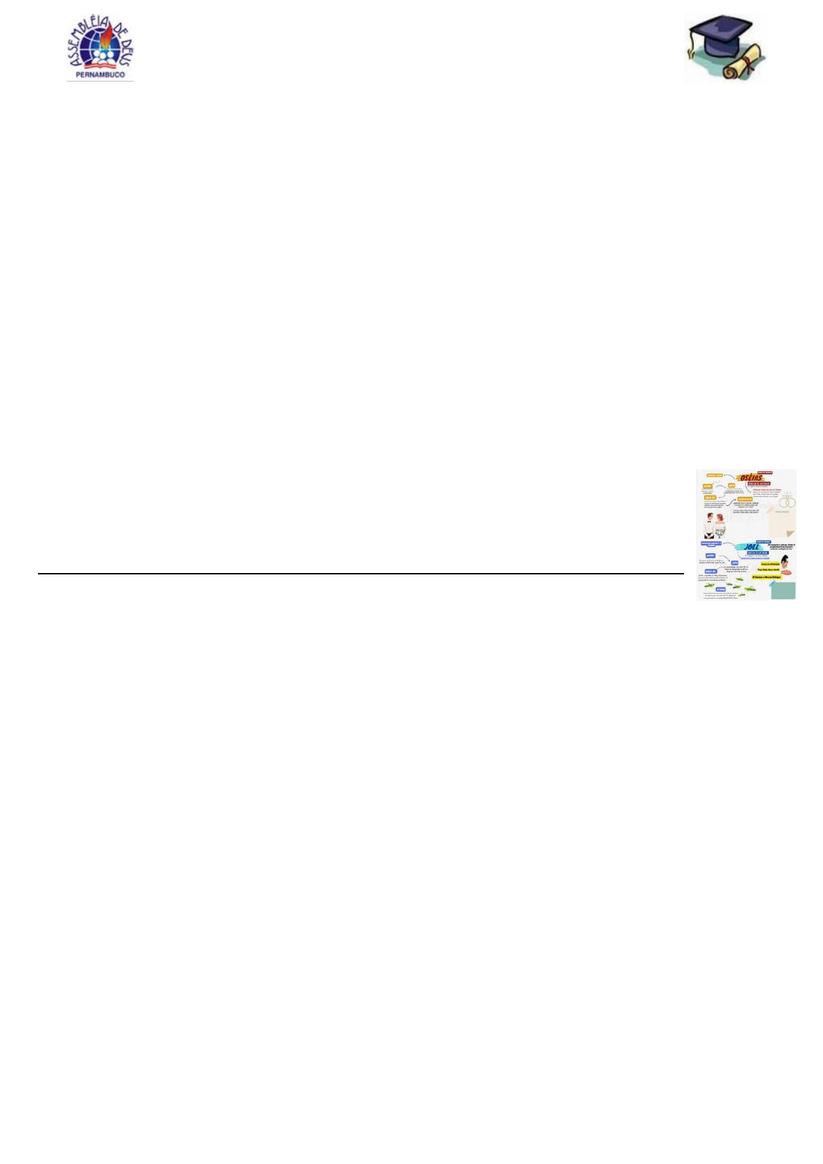 Igreja Evangélica Assembleia de Deus em Pernambuco Superintendência das Escolas Bíblicas Dominicais Departamento Infanto/juvenil Pastor Presidente: Aílton José Alves Av. Cruz Cabugá, 29 – Santo Amaro – Recife-PE / CEP. 50040 – 000 Fone: 3084 1524 / 3084 1543 PROFESSOR 10– CLASSE DE JUVENIS – 2º TRIMESTRE DE 2024 LIÇÃO 06 – CONHECENDO OS PROFETAS MENORES TEXTO BÍBLICO: Amos 3.1-7; Zacarias 1.1-6. INTRODUÇÃO Querido(a) professor(a)! Nesta lição estudaremos um pouco sobre a importância dos doze livros conhecidos como os Profetas Menores. Neles descreveremos um pouco sobre a sua visão panorâmica e quais lições podemos extrair para a nossa vida espiritual e para os dias atuais. Sabemos que Deus tem um propósito para cada um de nós, mas apenas um objetivo nos conduzir a santificação para chegarmos diante de Dele. I – TEXTO ÁUREO “E falarei aos profetas, e multiplicarei a visão; e pelo ministério dos profetas proporei símiles.,” (Oseias 12.10) Deus usou os profetas do Antigo Testamento dando visões através de comparações para que o povo de Israel se arrependesse da maldade dos seus corações. Assim como Ele operou milagres através dos profetas, Deus ainda é o mesmo que usa de misericórdia para que o povo cheque ao arrependimento dos seus pecados, e voltem para a Ele. II – AUXÍLIO PEDAGÓGICO Querido(a) Professor(a): Para vivenciar o Subtópico 3.3 deste subsídio utilize uma Bíblia Estojo para apresentar as imagens temáticas. Sugerimos para este momento na EBD a impressão dos Mapas Mentais com os resumos e imagens sobre cada um dos livros que são denominados de profetas menores conforme link: https://drive.google.com/drive/folders/1CYbMSTDDE6TOxuSn8Taxdd0N9vjqGo_l?usp=drive_link Boa Aula! III – COMENTÁRIO DA LIÇÃO 3.1 – A Importância dos Profetas Menores. E expressão “Profetas Menores” são assim chamados não porque seus ministérios tenham tido menos importância do que os profetas maiores. Essa expressão “profetas menores” foi conhecida por Agostinho, no princípio do século IV d.C., Essa designação, que tem origem no cristianismo, expressa apenas o fato de que aqueles foram profetas que deixaram um menor registro de profecias em seus respectivos livros. Os Profetas Menores: Oseias, Joel, Amós, Obadias, Jonas, Miqueias, Naum, Habacuque, Sofonias, Ageu, Zacarias e Malaquias — viveram em um período de tempo que vai do século VIII a.C. ao século V a.C. As mensagens proferidas pelos profetas em Israel, apesar de o Senhor Jesus já ter vindo ao mundo, continuam sendo atuais, pois traz princípios e advertências voltados para questões sociais, políticas, familiares e espirituais que se aplicam à realidade de crentes de todas as épocas, São mensagens vindas diretamente de Deus, são palavras anunciadas por homens inspirados pelo Espírito Santo (2Pd 1.21), além de conterem revelações escatológicas, sobretudo relacionados ao futuro de Israel, que ainda irão se cumprir, e muitas profecias relativas à Primeira Vinda de Cristo, que já se cumpriram e são atestadas nos Evangelhos (Mt 2.1; Mt 26.56; Lc 24.47; Jo 1.45.Jo.14.1-3).Os livros foram inspirados pelo Espírito Santo (2Pd 1.21) e, portanto, fazem parte da obra que o Espírito Santo realiza em cada salvo para nos apresentar ao Senhor no dia do arrebatamento da Igreja (Jo.14.26; 16.13,14). 3.2 – Introdução dos Profetas Menores. O livro dos Profetas Menores na Bíblia hebraica reúne-se em um só volume chamado de “Livro dos Doze” (“Shenem Assar”), e foram provavelmente agrupados dessa forma por volta de 425 a.C. por Esdras e a chamada Grande Sinagoga, um grupo formado por 120 doutores da Lei. Na versão grega da Septuaginta, eles foram chamados de “Dodecapropheton”, ou seja, “Doze Profetas”. Isto é importante porque o fato de haver citações de alguns destes livros no Novo Testamento é a afirmação de reconhecimento de sua canonicidade integral. Na Vulgata e nas edições subseqüentes, os livros foram divididos pelos seus autores, gerando, então, doze livros separados. Estes Profetas costumam ser divididos em dois grupos: A) - Os profetas pré-exílicos, ou seja, anteriores ao cativeiro da Babilônia: (1) OSEIAS – Em hebraico, “Oshea”, que significa “Jeová é salvação”. (2) JOEL – Em hebraico, “Yo’el”,que significa “Jeová é Deus”. (3) AMÓS – Em hebraico, ’Amos”, que significa “fardo, carga pesada”(ou, também, segundo outros,“forte”). (4) OBADIAS – Em hebraico, “Obadiah” ( עןבדיה), que significa “servo de Jeová”. (5) JONAS – Em hebraico, é “Yonah”, que significa pombo. (6) MIQUEIAS – Em hebraico, “Mikhah”, que significa, “quem é semelhante a Jeová ?”. (7) NAUM – Em hebraico, “Nahum”(נחןם), que significa “consolação (8) HABACUQUE – Em hebraico,“Habaquq”, que significa “abraço ardente”`, “abraço amoroso” ou “lutador”. https://drive.google.com/drive/folders/1CYbMSTDDE6TOxuSn8Taxdd0N9vjqGo_l?usp=drive_link (9) SOFONIAS – Em hebraico, “Tsephan-Yah”, que significa “Jeová esconde”, “Jeová protege”, ou, ainda, “te- souro. B – Os Profetas pós-exílicos, ou seja, posteriores ao cativeiro da Babilônia AGEU – Em hebraico, “Haggai”, que quer dizer “festivo” ou “festividade”, ZACARIAS – Em hebraico, “Zachar-Yah”, que significa “Jeová se lembrou”. MALAQUIAS – Em hebraico “Mala’kh-Yah”, que significa “anjo ou mensageiro de Jeová”, ou ainda, “seu mensageiro”. A maneira como Deus trabalha em favor do seu povo é tão perfeita que através dos nomes dos livros percebemos a harmo- nia que eles tem em comum. Se tivermos sensibilidade e soubermos ouvir o que o Espírito Santo nos ensina através deles, nossa vida será grandemente enriquecida, pois nos trás uma mensagem de justiça e esperança para os dias de hoje. 3.3 – A Estrutura dos livros Os profetas foram chamados