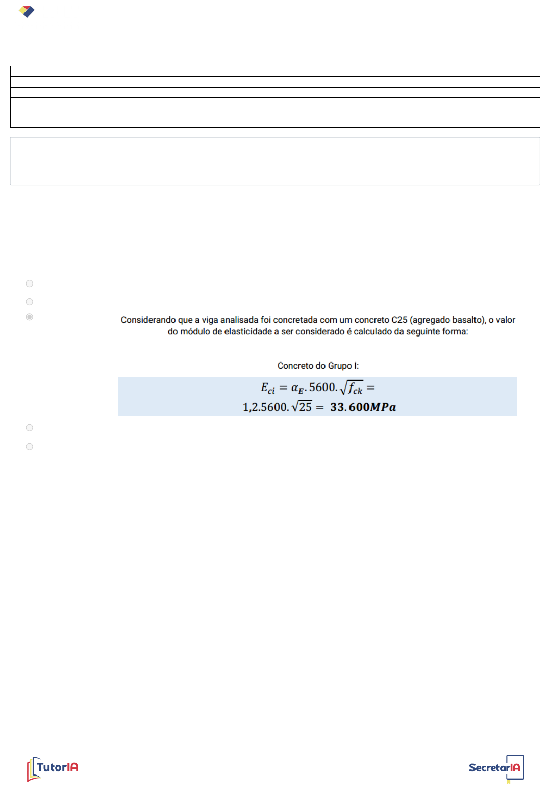 Iniciado em sábado, 29 jun. 2024, 11:53 Estado Finalizada Concluída em sábado, 29 jun. 2024, 12:42 Tempo empregado 48 minutos 53 segundos Avaliar 8,0 de um máximo de 10,0(80%) Questão 1 Correto Atingiu 1,0 de 1,0 Para o cálculo da flecha de uma viga, é necessário saber sobre a rigidez dela, o que significa conhecer a seção transversal e o módulo de elasticidade do material. Considerando que a viga analisada foi concretada com um concreto C25 (agregado basalto), qual o valor do módulo de elasticidade a ser considerado? Escolha uma opção: a. 35.200MPa. b. 19.600MPa. c. 33.600MPa. d. 28.000MPa. e. 25.200MPa. A resposta correta é: 33.600MPa. Concreto Armado - SG JV https://www.certificacaotecnica.com.br/ https://www.certificacaotecnica.com.br/dashboard/index.php?page=264&icon=excelencia https://www.certificacaotecnica.com.br/ https://api.whatsapp.com/send?phone=5511978370544 https://api.whatsapp.com/send?phone=5511978370544 Questão 2 Correto Atingiu 1,0 de 1,0 Questão 3 Correto Atingiu 1,0 de 1,0 A fissuração dos elementos de concreto armado é uma desvantagem que, se não controlada, pode comprometer a durabilidade da estrutura. Com relação à fissuração dos elementos de concreto armado, assinale a alternativa correta. Escolha uma opção: a. e) Os principais efeitos prejudiciais das fissuras do concreto armado estão ligados à estética e à sensação de insegurança aos usuários. b. d) Para se evitar a fissuração do concreto por tensões de tração, seria necessário que fossem aplicadas tensões elevadas de tração na peça e armaduras. c. a) As principais causas do aparecimento de fissuras nos elementos de concreto armado são a expansão e as solicitações normais de tração. d. c) A retração do concreto pode ser evitada ou minimizada com a adoção de algumas medidas de proteção durante a fase de endurecimento do concreto fresco. A cura do concreto, que tem por finalidade evitar que a água da mistura evapore, deve ser realizada para que se mantenha úmida a superfície de concreto nas suas primeiras idades, evitando a fissuração por retração. e. b) Quanto maior a espessura do elemento, maior será a retração e a possibilidade de fissuração. A resposta correta é: c) A retração do concreto pode ser evitada ou minimizada com a adoção de algumas medidas de proteção durante a fase de endurecimento do concreto fresco. Nos estádios I e II, ocorrem proporcionalidades entre as tensões e deformações que facilitam o cálculo das tensões analiticamente. Conforme essa análise, assinale a alternativa correta. Escolha uma opção: a. As formulações para o estádio Ia também são válidas para o estádio Ib. b. O coeficiente αe relaciona o modulo de elasticidade do concreto com a deformação do aço. c. Os momentos de inércia da seção homogeneizada para os estádios I e II são os mesmos, visto que a seção analisada não muda. d. A formulação para os valores das tensões no concreto na borda comprimida e na armadura comprimida e tracionada se diferem apenas pelo momento de inércia da seção homogeneizada. Na formulação é indicado o momento de inércia da seção homogeneizada de cada estádio com seu índice. e. As formulações para tensão no concreto na borda tracionada se diferenciam apenas pelos diferentes momentos de inércia da seção homogeneizada de cada estádio. A resposta correta é: A formulação para os valores das tensões no concreto na borda comprimida e na armadura comprimida e tracionada se diferem apenas pelo momento de inércia da seção homogeneizada. Concreto Armado - SG JV https://www.certificacaotecnica.com.br/ https://www.certificacaotecnica.com.br/dashboard/index.php?page=264&icon=excelencia https://www.certificacaotecnica.com.br/ https://api.whatsapp.com/send?phone=5511978370544 https://api.whatsapp.com/send?phone=5511978370544 Questão 4 Correto Atingiu 1,0 de 1,0 Questão 5 Correto Atingiu 1,0 de 1,0 Conforme as simbologias referentes à geometria e outras medidas de dimensões dos elementos, assinale a resposta correta. Escolha uma opção: a. ”b” e “bw” se referem à largura da seção transversal do elemento. Normalmente, quando essa largura é constante, utiliza-se o símbolo “b”, mas nada impede que o símbolo “bw” seja utilizado. A diferença é que “bw” refere-se à menor largura em toda a altura da seção transversal. Quando a largura for constante, esses símbolos se equivalem. b. ”d’” é conhecido como a altura útil do elemento. c. ”d” é a distância entre o centro de gravidade da armadura comprimida até a fibra mais comprimida do concreto. d. “h” é a largura da seção transversal de um elemento. e. ”c” é a distância da linha neutra até a fibra mais comprimida do concreto. A resposta correta é: ”b” e “bw” se referem à largura da seção transversal do elemento. Normalmente, quando essa largura é constante, utiliza-se o símbolo “b”, mas nada impede que o símbolo “bw” seja utilizado. Com relação às vantagens na utilização do concreto armado, assinale a alternativa correta. Escolha uma opção: a. b) Pelo fato de as estruturas de concreto serem monolíticas, elas apresentam facilidade em serem moldadas. b. e) Peças de concreto armado possuem grande massa e rigidez, por isso são bastante resistentes ao fogo. c. d) Apesar de a durabilidade do concreto ser muito boa, o custo de manutenção de estruturas em concreto armado é alto. d. a) O concreto armado, por ser moldável, permite que sejam feitas reformas e demolições com facilidade. e. c) Os processos de construção de estruturas de concreto armado são conhecidos e a sua execução não exige uma mão de obra com elevado nível de qualificação. Os conhecimentos acerca da execução de estruturas de concreto armado são muito conhecidas e difundidas, além de possuírem facilidade e rapidez para que sejam construídas. A resposta correta é: c) Os processos 