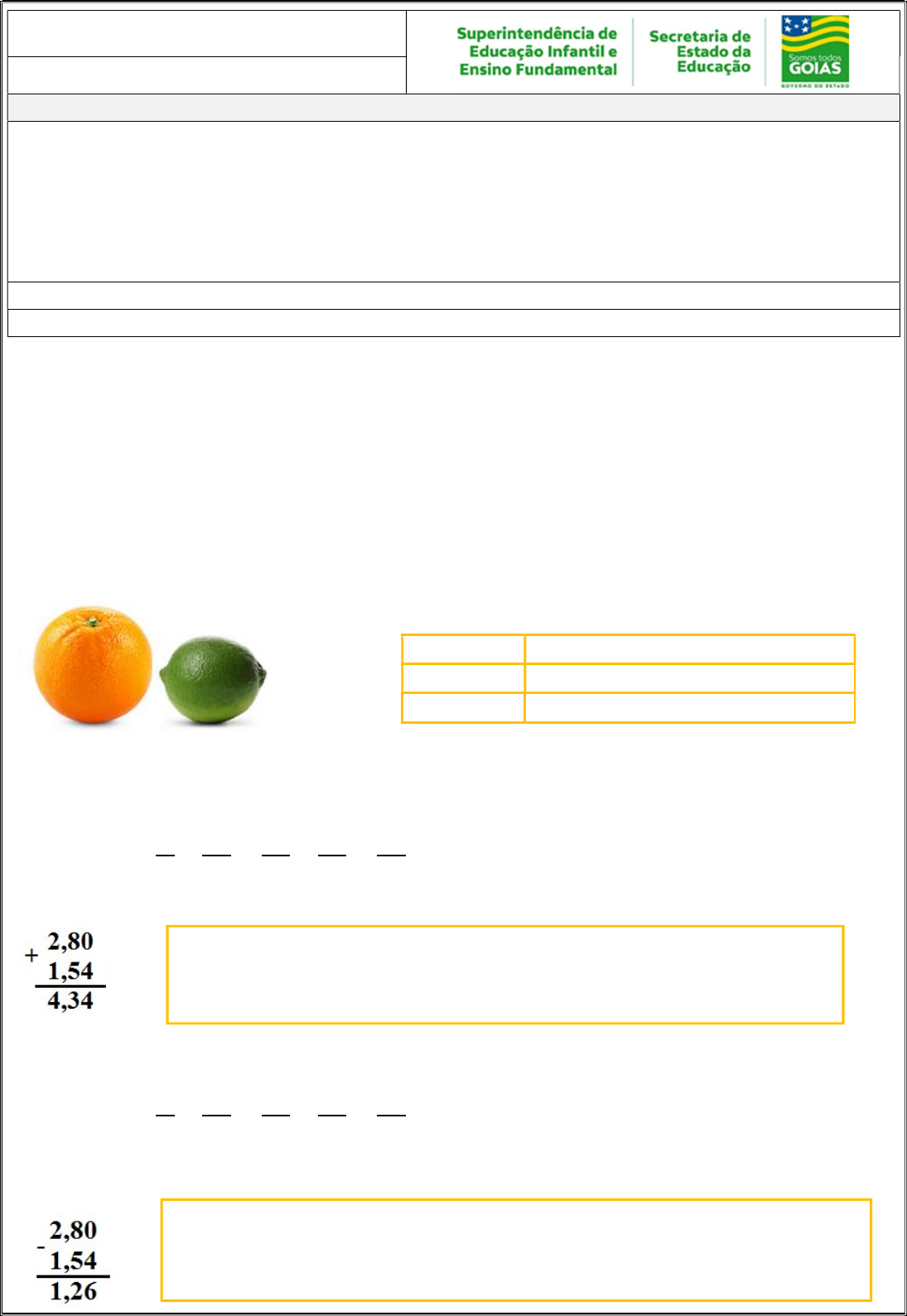 Tema/ objeto de conhecimento: Problemas: adição e subtração de números naturais e números racionais cuja representação decimal é finita. Problemas: multiplicação e divisão de números racionais cuja representação decimal é finita por números naturais: Adição e subtração envolvendo números naturais e racionais cuja representação decimal é finita. Multiplicação e divisão envolvendo números naturais e números racionais cuja representação decimal é finita Adição e subtração de números decimais Vamos acompanhar uma situação que envolve adição e subtração de números decimais. A tabela a seguir mostra as compras que Marta fez para a sua casa. Fonte: https://br.freepik.com/Acesso em 23/09/2020 Qual o total de frutas, em quilogramas, que Marta comprou? 1º modo: 2,8 + 1,54 = + = + = = 4,34 kg 2º modo: Quantos quilogramas de laranjas Marta comprou a mais do que de limões? 1º modo: 2,8 − 1,54 = − = − = = 1,26 kg 2º modo: 5º ANO MATEMÁTICA 5ª QUINZENA – 3º CICLO Habilidades Essenciais: (EF05MA07-B) Ler, interpretar, resolver, analisar e elaborar problemas de adição e subtração com números racionais na representação decimal finita, utilizando estratégias diversas, como cálculo por estimativa, cálculo mental e algoritmos. Exemplo: 0,25 + 0,50; (EF05MA08-B) Ler, interpretar, resolver, analisar e elaborar problemas de multiplicação e divisão com números racionais, cuja representação decimal é finita, com multiplicador natural e divisor natural diferente de zero, utilizando estratégias diversas, como cálculo por estimativa, cálculo mental e algoritmos. NOME: UNIDADE ESCOLAR: Fruta Quantidade (em quilograma) Laranja 2,8 Limão 1,54 Observe que trocamos 1 décimo por 10 centésimos. Dos 8 décimos, sobraram 7. Assim, 7 décimos menos 5 décimos é igual a 2 décimos e 10 centésimos menos 4 centésimos é igual a 6 centésimos. Observe que 8 décimos mais 5 décimos são 13 décimos. Como 10 décimos formam uma unidade, nós fazemos a troca. Assim, 13 décimos = 1 unidade + 3 décimos. Multiplicação de números decimais Se Marta comprou 2,8 quilogramas de laranja pagando R$ 4,00 o quilograma, quanto Marta gastou com as laranjas? 1º modo: 4 ∙ 2,8 = 4 ∙ = = 11,20 reais (R$ 11,20) 2º modo: Divisão de números naturais com quociente decimal Fonte: https://br.freepik.com/Acesso em 23/09/2020 Marta dividiu uma corda de 34 metros de comprimento em 5 partes iguais. Qual a medida de cada parte? 1º modo: Primeiro fazemos a divisão: Transformando os números da divisão em fração, obtemos o número decimal correspondente: = 6 = 6 + = 6 + 0,8 = 6,8 metros Outra forma de obter o decimal é dar continuidade à divisão: Atividades 1. A tabela a seguir é de dupla entrada, que você preenche adicionando os números das linhas e das colunas. Complete-a. + 0,25 0,5 0,75 1 1,25 0,1 0,25 0,5 0,75 1 1,25 Quando a divisão não é exata, transformamos o resto em décimos, multiplicando seu valor absoluto por 10, e continuamos a divisão, colocando uma vírgula no seu quociente. 2. De uma rua de 84,35 metros, já foram asfaltados 52,12 metros. Quantos metros restam sem asfalto? Fonte: https://br.freepik.com/Acesso em 23/09/2020 3. Veja, no quadro, as ofertas do dia de um supermercado: Se você comprar uma unidade de cada produto, calcule o valor que economizará. __________________________________________________________________________ __________________________________________________________________________ __________________________________________________________________________ 4. O preço de uma caixinha de som, com sistema bluetooth, é de R$ 435,00. Calcule o valor que você pagará por essa caixinha se conseguir um desconto de R$ 63,75. Fonte: https://br.freepik.com/Acesso em 23/09/2020 5. No esquema a seguir está indicada a distância de A até B e a distância de B até C, em centímetros. Calcule a distância de A até C. Figura criada pelo autor 6. A altura de uma casa era de 4,78 metros. Foi construído um 2º andar e a altura da casa passou a ser de 8,4 metros. De quantos metros foi o aumento da altura da casa? Fonte: https://br.freepik.com/Acesso em 23/09/2020 - Leite em pó integral: de R$ 2,70 por R$ 2,20 - Iogurte natural batido: de R$ 2,50 por R$ 2,09 - Queijo Minas frescal: de R$ 3,80 por R$ 3,59 7. Bruno percorreu, de moto, 32,4 quilômetros. Leonardo percorreu uma vez e meia essa distância. Quantos quilômetros Leonardo percorreu? Fonte: https://br.freepik.com/Acesso em 23/09/2020 8. Em 1º de março de 2005, um dólar valia R$ 2,66. Se nessa época você comprasse 75 dólares, quantos reais você gastaria? Fonte: https://br.freepik.com/Acesso em 23/09/2020 9. Um automóvel gastou 4 litros de combustível para percorrer 30 quilômetros. Quantos quilômetros esse automóvel percorreu com 1 litro de combustível, ou seja, qual o seu consumo em quilômetros por litro? Fonte: https://br.freepik.com/Acesso em 23/09/2020 10. Certo número de caixas foi colocado em uma balança. Cada caixa pesa 1,5 quilograma. Supondo que a balança marcou 24 quilogramas, quantas caixas foram colocadas nela? (Dica: Multiplique os dois termos da operação por 10)