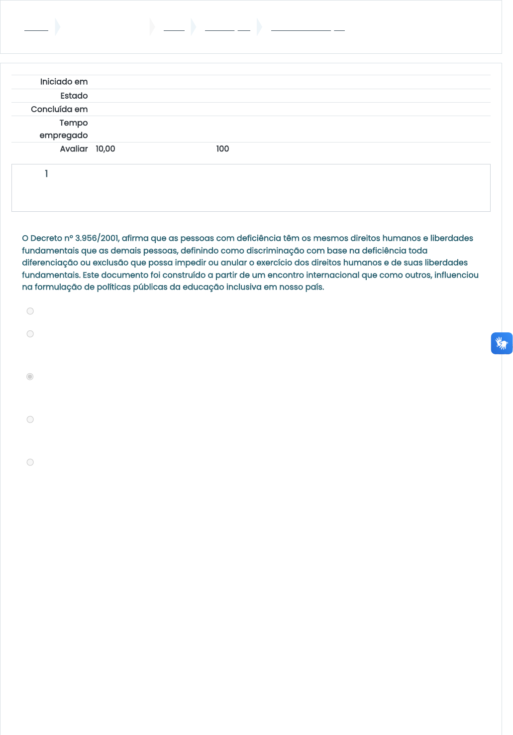 Painel Minhas Disciplinas D639 AVALIAÇÃO Realizar Avaliação Iniciado em quarta, 3 Jul 2024, 15:12 Estado Finalizada Concluída em quarta, 3 Jul 2024, 15:24 Tempo empregado 12 minutos Avaliar 10,00 de um máximo de 10,00(100%) Questão 1 Correto Atingiu 1,00 de 1,00 O Decreto nº 3.956/2001, afirma que as pessoas com deficiência têm os mesmos direitos humanos e liberdades fundamentais que as demais pessoas, definindo como discriminação com base na deficiência toda diferenciação ou exclusão que possa impedir ou anular o exercício dos direitos humanos e de suas liberdades fundamentais. Este documento foi construído a partir de um encontro internacional que como outros, influenciou na formulação de políticas públicas da educação inclusiva em nosso país. a. Declaração de Costa Rica b. Política Nacional de Educação Especial c. Convenção Interamericana  d. Constituição de 1988 e. Convenção da Berlim Sua resposta está correta. https://cesap.edu.br/ava/my/ https://cesap.edu.br/ava/course/view.php?id=620 https://cesap.edu.br/ava/course/view.php?id=620#section-5 https://cesap.edu.br/ava/mod/quiz/view.php?id=8431 Questão 2 Correto Atingiu 1,00 de 1,00 Questão 3 Correto Atingiu 1,00 de 1,00 De acordo com as diretrizes da Política Nacional de Educação Especial na Perspectiva da Educação Inclusiva sobre o atendimento educacional especializado: a. As atividades propostas durante o atendimento educacional especializado funcionam da mesma forma que as realizadas na sala de aula, podendo substituí-las. b. O atendimento educacional especializado tem como função identificar, elaborar e organizar recursos pedagógicos e de acessibilidade que eliminem as barreiras para a plena participação dos alunos considerando suas necessidades específicas.  c. O acesso à educação para as pessoas com deficiência inicia-se no ensino d. Os programas de enriquecimento curricular, ensino de linguagens e códigos específicos de comunicação e sinalização e tecnologia assistiva devem ser oferecidos somente nas escolas regulares. Sua resposta está correta. Quando nos referimos aos sujeitos com necessidades educacionais especiais, estamos nos referindo aos sujeitos público-alvo da Educação Especial, ou seja, as pessoas com deficiência, as pessoas com transtornos globais do desenvolvimento e as pessoas com altas habilidades/superdotação? a. As pessoas consideradas com necessidades educacionais especiais são aquelas que têm laudo médico b. As pessoas público-alvo da Educação Especial, as pessoas com dificuldades de aprendizagem e as pessoas consideradas indisciplinas têm necessidades educacionais especiais c. Todas as pessoas são consideradas pessoas com necessidades educacionais especiais d. Não, as pessoas com dificuldades de aprendizagem também são consideradas pessoas com necessidades educacionais especiais.  e. Sim, somente as pessoas público-alvo da Educação Especial têm necessidades educacionais especiais Sua resposta está correta. Questão 4 Correto Atingiu 1,00 de 1,00 Questão 5 Correto Atingiu 1,00 de 1,00 O termo "educação inclusiva" faz parte das diretrizes educacionais do Brasil e de vários outros países do mundo. É um processo que ainda gera uma preocupação a respeito da compreensão ampla de seu significado. Um modo de compreender corretamente o que o termo propõe, para que a prática da educação inclusiva obtenha sucesso, consiste em: a. Voltar-se para o bem-estar e sucesso educacional de todos no ambiente do ensino regular.  b. Afrouxar o currículo acadêmico para que todos os alunos sintam-se igualmente capazes. c. Compreender que educação inclusiva é o mesmo que educação especial. d. Focar apenas nas adaptações físicas das escolas regulares. e. Manter o enfoque no aluno com necessidades educacionais especiais. Sua resposta está correta. Sobre a Educação Especial, é INCORRETO afirmar que: a. Durante muito tempo, a educação especial foi oferecida em instituições especializadas, escolas especiais e classes especiais, em substituição ao ensino comum.  b. O projeto pedagógico da escola deve articular a educação comum e a educação especial, buscando atender às necessidades dos educandos. c. Desde a sua origem, a educação especial se caracteriza por uma perspectiva inclusiva, em que se consideram as necessidades educacionais específicas da criança. d. O trabalho colaborativo entre os professores da sala de aula comum e o da sala de recursos multifuncionais busca promover condições de aprendizagem da criança com deficiência. e. Nenhuma das alternativas Sua resposta está correta. Questão 6 Correto Atingiu 1,00 de 1,00 Questão 7 Correto Atingiu 1,00 de 1,00 Segundo a Política Nacional de Educação Especial na Perspectiva da Educação Inclusiva, qual é o profissional que tem como principal função identificar, elaborar e organizar recursos pedagógicos e de acessibilidade com o intuito de colaborar no processo de inclusão? a. O professor do Atendimento Educacional Especializado (AEE).  b. O psicólogo. c. O mediador escolar d. O professor regente da turma e. O coordenador pedagógico da escola. Sua resposta está correta. Em relação a deficiência visual é INCORRETO afirmar que: a. São recursos e exemplos de tecnologias assistivas para o cego: sorobã, cubarítimo, e o reglete e punção. b. A ferramenta de escrita e leitura mais apropriada para a pessoa cega é o método Braille c. Dentro do conceito educacional, a pessoa com baixa visão é aquela que possui resíduos visuais em grau que permitam ler textos impressos à tinta, desde que se empreguem recursos didáticos e equipamentos especiais, excluindo as deficiências facilmente corrigidas pelo uso adequado de lentes. d. Miopia, astigmatismo e hipermetropia são considerados deficientes visuais de baixa visão.  e. Nenhuma das alternativas Sua resposta está correta. Questão 8 Correto Atingiu 1,00 de 1,00 Leia atentamente o trecho abaixo: