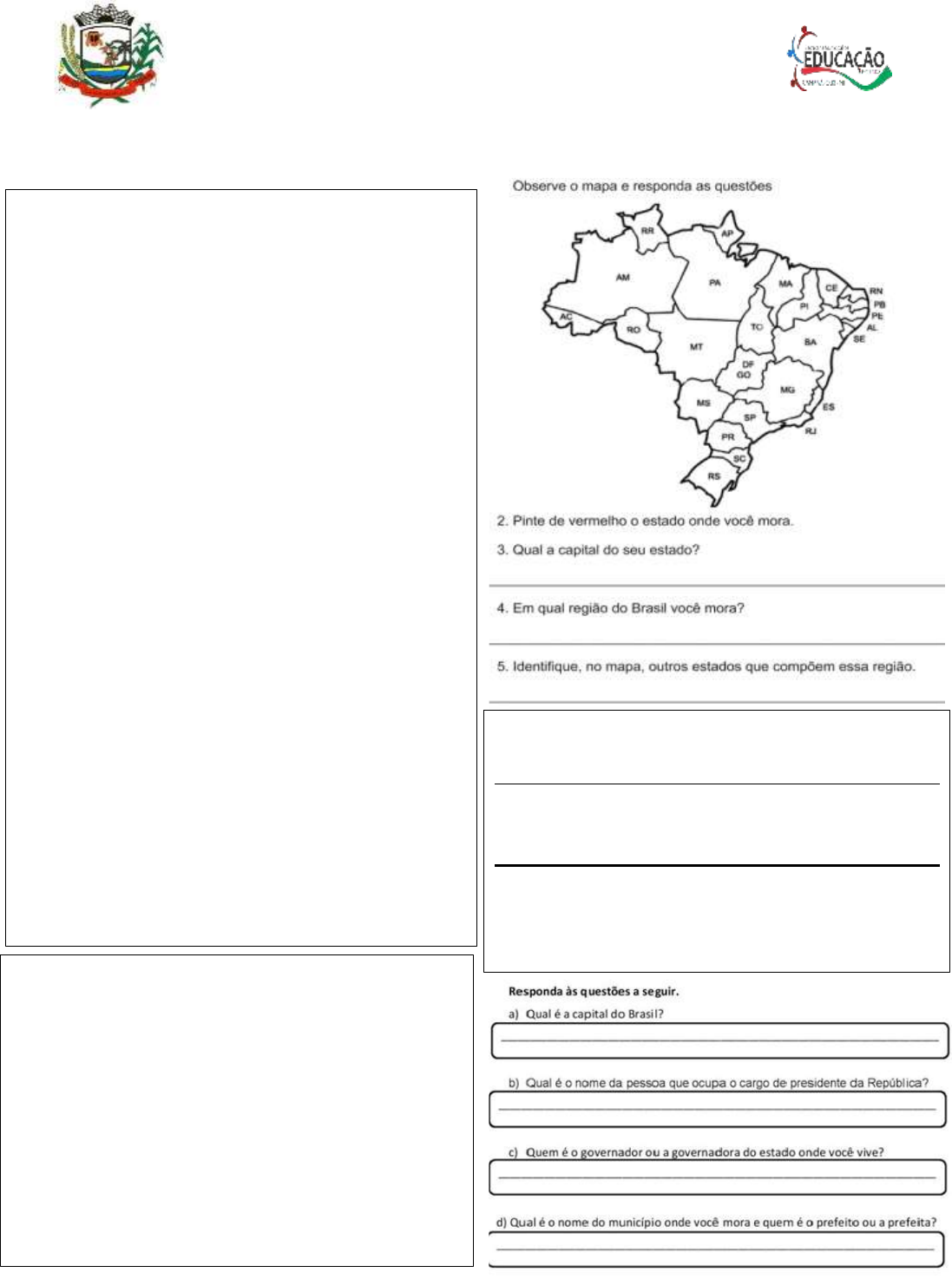 PREFEITURA MUNICIPAL DE CAMPINÁPOLIS-MT SECRETARIA MUNICIPAL DE EDUCAÇÃO E CULTURA ALUNO: __________________________________ DATA: / /2020 ESCOLA MUNICIPAL INDIGENA________________________________ Atividade em Cumprimento a Resolução 001/2020/CME de 20/05/2020 Campinápolis-MT, e da Resolução Normativa 002/2020 do CEE/MT. E o Parecer CNE/CP 05/2020- 28/04/2020. Atividades de Geografia 8º ano Estados Brasileiros O Brasil é dividido em 5 regiões: Região Norte, Nordeste, Centro-Oeste, Sudeste e Sul. Composto por 26 estados e um Distrito federal, sua população é estimada em 217,4 milhões de habitantes. Cada estado é composto por municípios. Região Norte: Amazonas (AM) capital Manaus, Roraima (RR) capital Boa Vista, Acre (AC) capital Rio Branco, Rondônia (RR) capital Porto Velho, Pará (PA) capital Belém, Amapá (AP) capital Macapá e Tocantins (TO) capital Palmas. Região Nordeste: Maranhão (MA) capital São Luís, Piauí (PI) capital Teresina, Ceará (CE) capital Fortaleza, Rio Grande do Norte (RN) capital Natal, Paraíba (PB) capital João Pessoa, Pernambuco (PE) capital Recife, Alagoas (AL) capital Maceió, Sergipe (SE) capital Aracajú e Bahia (BA) capital Salvador. Região Sudeste: Minas Gerais (MG) capital Belo Horizonte, Espírito Santo (ES) capital Vitória, São Paulo (SP) capital São Paulo e Rio de Janeiro (RJ) capital Rio de Janeiro. Região Centro-Oeste: Mato Grosso (MT) capital Cuiabá, Mato Grosso do Sul (MS) capital Campo Grande, Goiás (GO) capital Goiânia e Distrito Federal (DF) capital Brasília. e também Capital do Brasil. Região Sul: Paraná (PR) capital Curitiba, Santa Catarina (SC) capital Florianópolis e Rio Grande do Sul (RS) capital Porto Alegre. Escreva 03 estados da região Nordeste Escreva 03 estados da região Sul: Escreva 03 estados da região Norte: _____________________________________________ Campinápolis é um município brasileiro do estado de Mato Grosso. Localiza-se a uma latitude 14º32'35" sul e a uma longitude 52º47'39" oeste, estando a uma altitude de 450 metros. Sua população estimada em 2017 foi estimada em 15 386 habitantes. Possui uma área de 5.967 km². Foi emancipada em 13 de maio de 1988. Área: 5.967 km² População total (estimativa IBGE/2017): 15 385 habitantes. Prefeito(a): Jeovan Faria (PSB, 2017 – 2020) Municípios vizinhos: Nova Xavantina, Água Boa, Novo São Joaquim, Paranatinga, Gaúcha do Norte e Santo Antônio do Leste. www.google.exerciciosdegeografia https://www.google.com.br/search?q=campin%C3%A1polis+%C3%A1rea&stick=H4sIAAAAAAAAAOPgE-LSz9U3sCwqMcoo0JLKTrbSz8lPTizJzM-DM6wSi1ITF7EKJyfmFmTmHV5YkJ-TWaxweCFQFAD4EtuJQAAAAA&sa=X&ved=2ahUKEwjp9bPCq7PpAhXqJrkGHZgVACcQ6BMoADAPegQIDRAC https://www.google.com.br/search?q=campin%C3%A1polis+popula%C3%A7%C3%A3o+total+estimativa+ibge/2017&sa=X&ved=2ahUKEwjp9bPCq7PpAhXqJrkGHZgVACcQ6BMoADAQegQIDhAC https://www.google.com.br/search?q=campin%C3%A1polis+prefeitoa&sa=X&ved=2ahUKEwjp9bPCq7PpAhXqJrkGHZgVACcQ6BMoADARegQIDxAC https://www.google.com.br/search?q=PSB&stick=H4sIAAAAAAAAAONgVuLUz9U3MDWtMClfxMocEOwEAPPjKyYTAAAA&sa=X&ved=2ahUKEwjp9bPCq7PpAhXqJrkGHZgVACcQmxMoATARegQIDxAD https://www.google.com.br/search?q=campin%C3%A1polis+munic%C3%ADpios+lim%C3%ADtrofes&sa=X&ved=2ahUKEwjp9bPCq7PpAhXqJrkGHZgVACcQ6BMoADASegQIEBAC https://www.google.com.br/search?q=Nova+Xavantina&stick=H4sIAAAAAAAAAONgVuLSz9U3sCwqMTMoXMTK55dflqgQkViWmFeSmZcIAP-1Pl4fAAAA&sa=X&ved=2ahUKEwjp9bPCq7PpAhXqJrkGHZgVACcQmxMoATASegQIEBAD https://www.google.com.br/search?q=%C3%81gua+Boa&stick=H4sIAAAAAAAAAONgVuLSz9U3ME42K0srX8TKebgxvTRRwSk_EQBkWB34GgAAAA&sa=X&ved=2ahUKEwjp9bPCq7PpAhXqJrkGHZgVACcQmxMoAjASegQIEBAE https://www.google.com.br/search?q=Novo+S%C3%A3o+Joaquim&stick=H4sIAAAAAAAAAONgVuLSz9U3sCwqMc8rWsQq6Jdflq8QfHhxvoJXfmJhaWYuAB0ID_4iAAAA&sa=X&ved=2ahUKEwjp9bPCq7PpAhXqJrkGHZgVACcQmxMoAzASegQIEBAF https://www.google.com.br/search?q=Novo+S%C3%A3o+Joaquim&stick=H4sIAAAAAAAAAONgVuLSz9U3sCwqMc8rWsQq6Jdflq8QfHhxvoJXfmJhaWYuAB0ID_4iAAAA&sa=X&ved=2ahUKEwjp9bPCq7PpAhXqJrkGHZgVACcQmxMoAzASegQIEBAF https://www.google.com.br/search?q=Paranatinga&stick=H4sIAAAAAAAAAONgVuLSz9U3sCwqMTM0XMTKHZBYlJiXWJKZl54IAH8Lai4cAAAA&sa=X&ved=2ahUKEwjp9bPCq7PpAhXqJrkGHZgVACcQmxMoBDASegQIEBAG https://www.google.com.br/search?q=Ga%C3%BAcha+do+Norte&stick=H4sIAAAAAAAAAONgVuLSz9U3sCyqNDDPWsQq4J54eFdyRqJCSr6CX35RSSoARvRxCyEAAAA&sa=X&ved=2ahUKEwjp9bPCq7PpAhXqJrkGHZgVACcQmxMoBTASegQIEBAH PREFEITURA MUNICIPAL DE CAMPINÁPOLIS-MT SECRETARIA MUNICIPAL DE EDUCAÇÃO E CULTURA ALUNO: __________________________________ DATA: / /2020 ESCOLA MUNICIPAL INDIGENA________________________________ Atividade em Cumprimento a Resolução 001/2020/CME de 20/05/2020 Campinápolis-MT, e da Resolução Normativa 002/2020 do CEE/MT. E o Parecer CNE/CP 05/2020- 28/04/2020. Regiões do Brasil www.google.exerciciosdegeografia www.google.exerciciosdegeografia Analisando o mapa dos biomas responda as questões: Quantos são os biomas brasileiros? Quais são os biomas brasileiros? Qual é o maior bioma brasileiro? Qual o menor bioma brasileiro? Qual bioma fica na região nordeste do Brasil? Qual bioma fica na região norte do Brasil Quais são as regiões do Brasil? Qual total de Km2 do bioma Amazônia? Qual o total preservado do bioma Amazônia? Qual o segundo maior bioma brasileiro? Qual o total de Km2 do bioma Cerrado? Qual o total preservado do bioma Cerrado? O bioma Pantanal fica em quais estados da região Centro-Oeste? PREFEITURA MUNICIPAL DE CAMPINÁPOLIS-MT SECRETARIA MUNICIPAL DE EDUCAÇÃO E CULTURA ALUNO: __________________________________ DATA: / /2020 ESCOLA MUNICIPAL INDIGENA________________________________ Atividade em Cumprimento a Resolução 001/2020/CME de 20/05/2020 Campinápolis-MT, e da Resolução Normativa 002/2020 do CEE/MT. E o Parecer CNE/CP 05/2020- 28/04/2020. Escreva todos os nomes dos estados brasileiros com a sigla e suas capitais Exemplo: Amazonas – AM – Manaus PREFEITURA MUNICIPAL DE CAMPINÁPOLIS-MT SECRETARIA MUNICIPAL DE ED