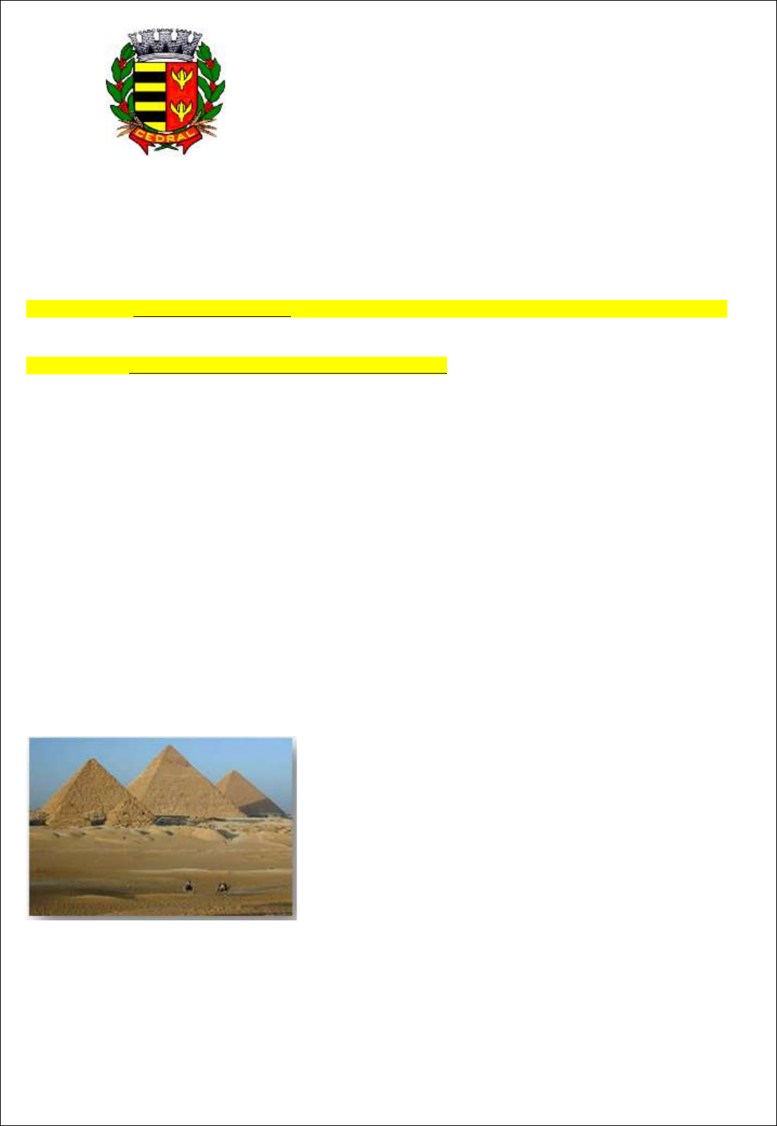 PREFEITURA MUNICIPAL DE CEDRAL COORDENADORIA MUNICIPAL DE EDUCAÇÃO EMEF “Profª Lucia Novais Brandão” Rua Felício Botino, 529, Centro, Cedral – SP Telefone: (17)3266-1003 DISCIPLINA: História PERÍODO: 10 a 14 de maio SÉRIE/ANO: 6º ANO ORIENTAÇÃO AOS ALUNOS: Querido aluno, colocar a data de hoje em seu caderno e seguir as orientações das atividades abaixo. CONTEÚDO E ATIVIDADE Atividade 01 – Leia os textos Complementar do Egito Antigo. Antigo Império O Antigo Império teve início quando Menés se tornou o primeiro faraó. Entre 3200 a.C. e 2300 a.C, ele estabeleceu a supremacia sobre os 42 nomos e implantou a capital em Tínis, no Alto Egito. Nesse período, os faraós governavam com poder absoluto. Eles eram considerados deuses vivos, detinham poder sobre todas as pessoas e eram donos de todas as terras. O período foi marcado pelo apogeu da civilização egípcia, na qual realizaram expedições para exploração mineral nas minas do Sinai e Mar Vermelho. Além disso, fundaram acampamentos estratégicos e uma frota marítima, adquirindo ouro, cobre, turquesa, madeira de cedro, mirra, malaquita e eletro. Durante esse período houve avanços nos campos da arquitetura, arte e tecnologia. O Antigo Império ficou conhecido como a época das grandes pirâmides, pois foi quando foram erguidas as pirâmides de Gizé, entre 2700 e 2600 a.C., pelos faraós Quéops, Quéfrem e Miquerinos. Depois de anos de supremacia o poder dos faraós foi se desgastando. Por volta de 2300 a.C., o Egito passou por uma crise social provocada por conflitos e disputas internas. Com a diminuição do poder do faraó, governantes regionais chamados nomarcas começaram a desafiar a autoridade faraônica. Pirâmides de Gizé Médio Império O Médio Império foi marcado pela recuperação do poder dos faraós que estava enfraquecido devido a ação dos nomarcas. Por volta do ano 2000 a.C., os príncipes tebanos derrotaram os nomarcas e transferiram a capital egípcia para Tebas. Assim, eles conseguiram restabelecer a paz interna e reorganizar o exército. Nesse período houve a conquista de regiões ricas em cobre e ouro como a Palestina e a Núbia. Entre 1800 e 1700 a.C. houve uma invasão no território egípcio, na qual povos vindos da Ásia usaram armas de ferro e de cavalos nos combates, tomaram o poder e permaneceram dominando o Egito até 1580 a.C. Novo Império O Novo Império teve início com a expulsão dos hicsos pelos príncipes de tebas e a restauração do poder dos faraós em 1580 a.C. O período foi marcado pela tentativa de reforma religiosa, promovida por Amenófis IV. Com o objetivo político de diminuir o poder sacerdotal que ameaçava o poder do faraó, ele unificou todos os deuses, que foi simbolizado pelo disco solar – Aton. Após a morte de Amenófis IV, o império foi assumido por Tutankamon e, em seguida, por Ramsés II e Tutmósis III, que foram os últimos grandes faraós do Novo Império. Tutmósis III retomou a política imperialista, entrou em guerra com os hititas e assinou a paz com os assírios. Com morte do último grande faraó, a civilização egípcia entrou em decadência e houve uma série de invasões no Egito. Primeiro pelos assírios, em seguida pelos persas, depois pelos macedônicos e, por fim, romanos. Trabalho na sociedade egípcia Pintura do comércio egípcio. Os comerciantes tinham grande importância para o desenvolvimento da economia egípcia ao promoverem a circulação de riquezas entre seu povo e as demais civilizações vizinhas. Graças à sua ação, era possível o acesso a uma série de produtos, como a madeira, utilizada na construção de embarcações e sarcófagos; o cobre e o estanho, metais úteis na fabricação de armamentos militares; e ervas, geralmente empregadas na medicina e nos processos de mumificação. Compondo uma parcela menos privilegiada da sociedade egípcia, temos os soldados, camponeses e artesãos. Os soldados viviam dos produtos recebidos em troca dos serviços por eles prestados e, em alguns momentos da história egípcia, eram recrutados entre povos estrangeiros. Os camponeses trabalhavam como servos nas terras do Estado e recebiam pouco pela função que exerciam. Da mesma forma, os artesãos tinham uma vida bastante simples e trabalhavam nas construções e oficinas existentes no país. Não exercendo grande importância, os escravos formavam uma classe reduzida no interior da sociedade egípcia. Em geral, estes escravos eram obtidos por meio das conquistas militares. Curiosamente, esses não viviam uma condição social radicalmente subalterna com relação aos seus donos. Mais tolerantes aos estrangeiros que outros povos, os egípcios tinham o costume de zelar pela condição de vida dos escravos postos sob o seu domínio. Morte e mumificação no Egito Antigo Os egípcios constituíram uma sociedade extremamente religiosa. Essa religiosidade determinou práticas culturais e sociais entre os egípcios – uma delas era a crença na imortalidade. Para os egípcios, a morte seria passageira e a vida retornaria para o corpo, porém o retorno à vida aconteceria somente se o corpo do moribundo fosse conservado. Estágio final do processo de mumificação. Se a alma (Rá) não voltasse para o corpo (Ká), significava que o corpo não tinha sido conservado. Parte, daí, a importância da mumificação dos corpos, do embalsamento e da conservação, para evitar a decomposição. Para isso, existiam técnicas avançadas de mumificação para os nobres e técnicas mais simples para os pobres. As avançadas técnicas de mumificação desenvolvidas no Egito Antigo somente existiram em razão da desenvolvida medicina. Os médicos egípcios faziam cirurgias, cuidavam de fraturas, conheciam a anatomia humana. Além da técnica de preservar os corpos através da mumificação, os egípcios precisavam desenvolver um método de proteger os corpos contra saqueadores, daí a construção de enormes túmulos. Os túmulos gar