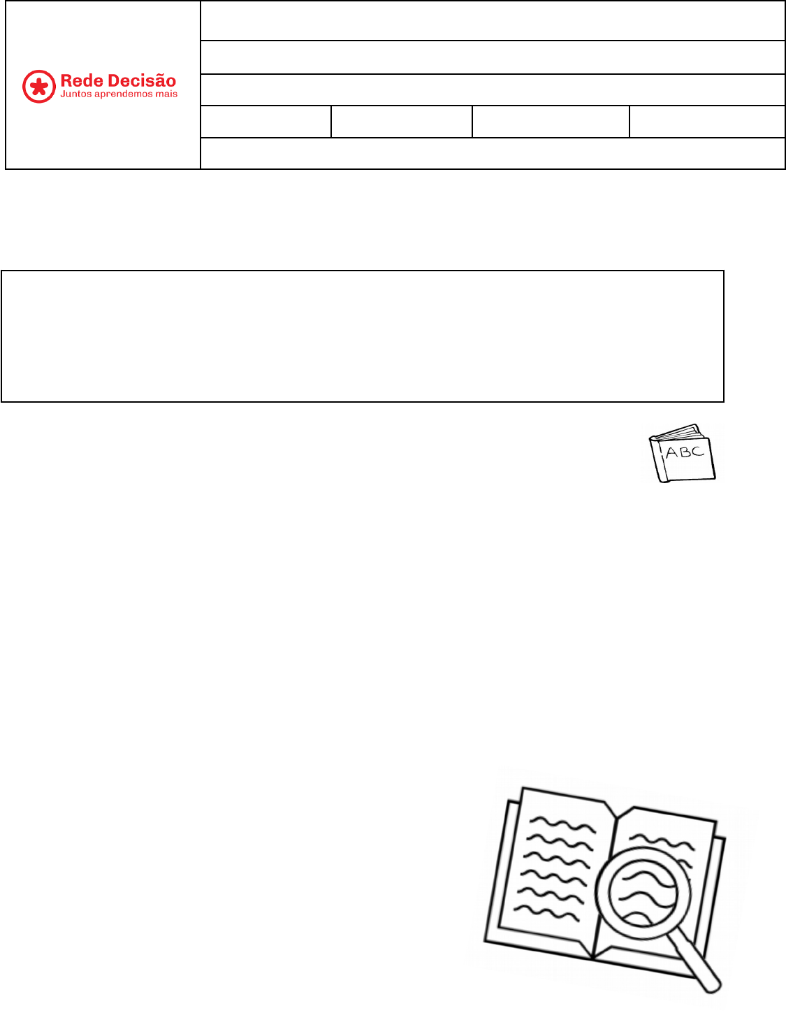 REDE DECISÃO Atividade de Língua Portuguesa ALUNO(A) Nº: SÉRIE: TURMA: TURNO: PROFESSORA- Lição de casa de Português 1) Leia o verbete: Suculento (su.cu.len.to) adj. 1. Que contém muito suco: fruta suculenta. 2. Que é nutritivo; alimentício: comida suculenta. 3. Diz-se de alimento que apresenta boa aparência e desperta o apetite: prato suculento – suculência s.f. Dicionário escolar da língua portuguesa/Academia Brasileira de Letras. 2 ed. São Paulo: Companhia Editora Nacional, 2008, p. 1206. a) Por que a palavra na entrada do verbete está no masculino e não no feminino? _________________________________________________________________________________________________________________________________________________________________________________________________________________________________________________________________ b) O que significa a abreviatura adj.? ____________________________________________________________________________________________________________________________________________________________________________ 2) Marque V para as alternativas verdadeiras e F para as falsas, de acordo com o que você aprendeu sobre o uso do dicionário. ( ) Registra o significado das palavras. ( ) Informa sobre os acontecimentos do mundo. ( ) Auxilia a ortografia. ( )Traz o resumo de vida das personagens da nossa História 4) Leia a frase: “Mas, agora, sou mais dos cremes e dos doces que são menos doces.” a) As palavras “doces” têm o mesmo significado nas duas vezes em que é empregada nessa frase? Justifique. ____________________________________________________________________________________________________________________________________________________________________________________________________________________________________ b) Em qual desses empregos “doces” é adjetivo? E substantivo? ____________________________________________________________________________________________________________________________________________________________________________________________________________________________________ 5) No trecho: “De repente me lembrei de uma coisa terrível: eu não tinha posto o meu nome no papel! E se ela achasse que era outro menino que gostava dela?”, as palavras destacadas são, respectivamente: a) ( ) artigo indefinido, adjetivo, artigo definido, substantivo, verbo. b) ( ) adjetivo, artigo definido, substantivo, verbo, verbo, adjetivo. c) ( ) artigo definido, adjetivo, artigo indefinido, substantivo, verbo. d) ( ) artigo indefinido, advérbio, artigo definido, substantivo, verbo. 6)Leia o texto. O trecho que contém um verbo indicando ação futura é: a) ( ) “... e logo com obstinação, quis novamente dormir.” b) ( ) “Com precaução, acendi um fósforo.” c) ( ) “Restava-me, portanto, menos de duas horas...” d) ( ) “... o trem chegaria às cinco.” 7) Os termos destacados nos trechos, a seguir, são pronomes. Classifique-os, utilizando a legenda. ( A ) pronome demonstrativo ( B ) pronome possessivo ( C ) pronome pessoal ( ) Os passageiros zombavam do meu embaraço. ( ) Aquela senhora me fazia perguntas aos berros. ( ) Depois pediu que eu me sentasse ao seu lado ( ) Tive que realizar essa operação em sua farta cintura. 8) Cartum: O tempo a) Que situação está sendo representada no cartum? ____________________________________________________________________________________________________________________________________________________________________________ b) Que situações reais, provavelmente, o autor quis criticar por meio da que criou? ____________________________________________________________________________________________________________________________________________________________________________ image6.png image5.png image2.png image1.png image3.png image4.png