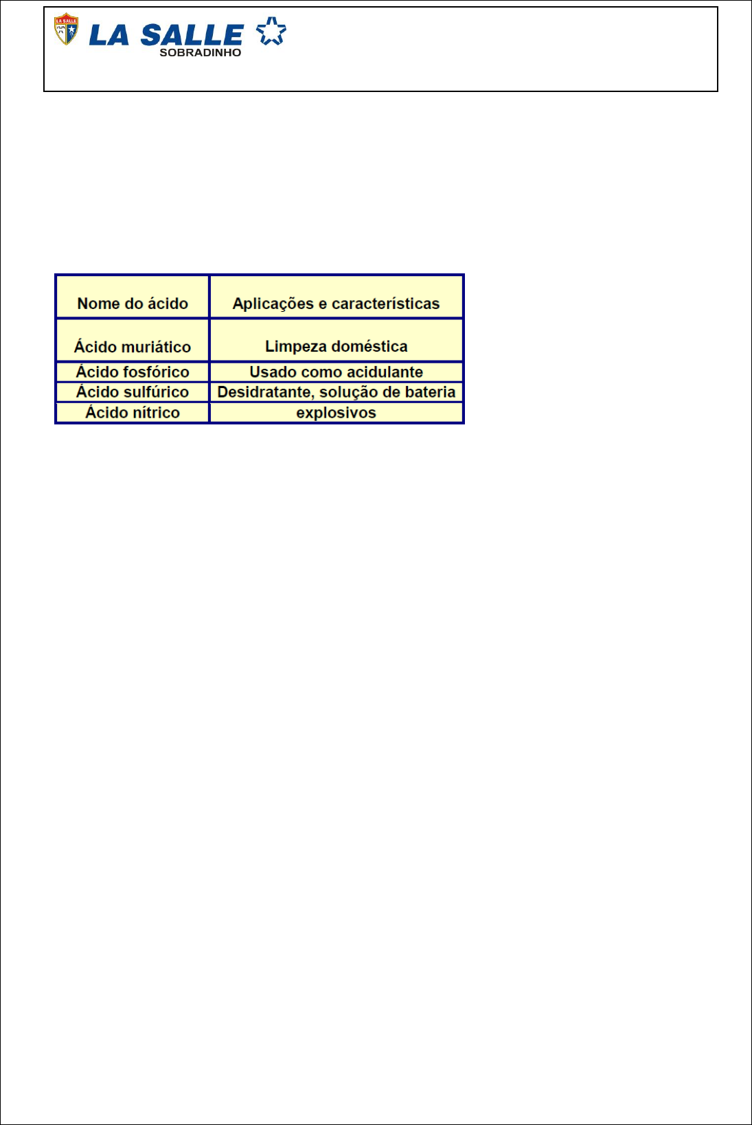 1) Identifique a alternativa que apresenta somente diácidos: a) H2S, H2SO4, H3PO4, H3PO3. b) HCN, H2S, H3PO4, H3PO3. c) H2S, H2SO4, H2CO3, H3PO3. d) HCl, H2S, H2SO4, H3PO3. e) H2SO4, H2SO3, HNO3, H3PO2. 2) A tabela apresenta algumas características e aplicações de alguns ácidos: As fórmulas dos ácidos da tabela são, respectivamente: a) HCl, H3PO4, H2SO4, HNO3. b) HClO, H3PO3, H2SO4, HNO2. c) HCl, H3PO3, H2SO4, HNO2. d) HClO2, H4P2O7, H2SO3, HNO2. e) HClO, H3PO4, H2SO3, HNO3. 3) Sabor adstringente é o que percebemos quando comemos uma banana verde (não-madura). Que substância a seguir teria sabor adstringente? a) C12H22O11. b) H3PO4. c) CH3COOH. d) NaCl. e) Al(OH)3. 4) O gás contido em um cilindro metálico, após a abertura da válvula do cilindro, foi borbulhado em água contendo o indicador fenolftaleína. Obteve-se solução acentuadamente avermelhada. O gás em questão poderá ser: a) amônia. b) dióxido de carbono. c) dióxido de enxofre. d) cloreto de hidrogênio. e) nitrogênio. 5) Num recipiente contendo uma substância A, foram adicionadas gotas de fenolftaleína, dando uma coloração rósea. Adicionando-se uma substância B em A, a solução apresenta-se incolor. Com base nessas informações podemos afirmar que: a) A e B são ácidos. b) A e B são sais. c) A e B são bases. d) A é um ácido e B é uma base. e) A é uma base e B é um ácido. 6) Na reação de neutralização total do ácido sulfídrico com o hidróxido de potássio, há formação de sal e água. A fórmula e o nome correto deste sal são, respectivamente: a) K2SO4 e sulfato de potássio. b) K2SO3 e sulfito de potássio. c) KS e sulfeto de potássio. d) K2S e sulfato de potássio. e) K2S e sulfeto de potássio. Lista de Exercícios - Funções Inorgânicas -9º Ano Prof. Andrei Kaiser 7) Os íons Hg2+ e Cl – compõem o cloreto de mercúrio, sal empregado na preparação de fungicidas e inseticidas, cuja fórmula é: a) HgCl. b) HgCl2. c) HgCl3. d) Hg2Cl. e) Hg2Cl3. 8) Algumas substâncias, como as apresentadas na tabela a seguir, fazem parte do nosso cotidiano, tendo as mais diversas aplicações. A sequência que apresenta, respectivamente, a fórmula química das substâncias 1, 2, 3 e 4 encontra-se na alternativa... a) NH3CO3 – BaSO4 – KNO2 – NaF. b) (NH4)2CO3 – BaSO3 – KNO3 – NaFO3. c) NH3CO3 – BaS – KNO4 – NaF. d) (NH4)2CO3 – BaSO4 – KNO3 – NaF. e) NH2CO2 – Ba2S3 – K3N – NaFO4. 9) A cal viva é um material muito usado por pedreiros, pintores e agricultores, representada pela fórmula CaO. Verifique que função está representada. a) Sal. b) Hidreto metálico. c) Óxido. d) Ácido. e) Base. Cristal ou vidro? O vidro cristal e o vidro comum têm uma estrutura molecular de desenho praticamente idêntico: a diferença está nos elementos químicos que compõem essa estrutura, afirmar Oscar Peitl Filho, professor de engenharia de materiais da Universidade Federal de São Carlos.Também conhecido como vidro de cal-soda ou soda-cal, o vidro comum é feito de areia (sílica), soda (óxido de sódio), cal (óxido de cálcio) e óxido de alumínio. Já na composição do vidro cristal entra apenas a sílica e o óxido de chumbo, substância que dá mais brilho e maior peso ao produto. 10) Observando o texto acima, podemos afirmar que: a) o óxido de sódio tem fórmula NaO. b) o óxido de cálcio é um óxido ácido ou anidrido. c) a fórmula do óxido de alumínio é Al2O3. d) todos os óxidos presentes no vidro comum ou vidro cristal são óxidos ácidos. e) o óxido de chumbo é um óxido molecular. 11) A chuva ácida é um tipo de poluição causada por contaminantes gerados em processos industriais que, na atmosfera, reagem com o vapor d’água. Dentre os contaminantes produzidos em uma região industrial, coletaram-se os óxidos SO3, CO, Na2O e MgO. Nessa região, a chuva ácida pode ser acarretada pelo seguinte óxido: a) SO3 b) CO c) Na2O d) MgO e) CaO.