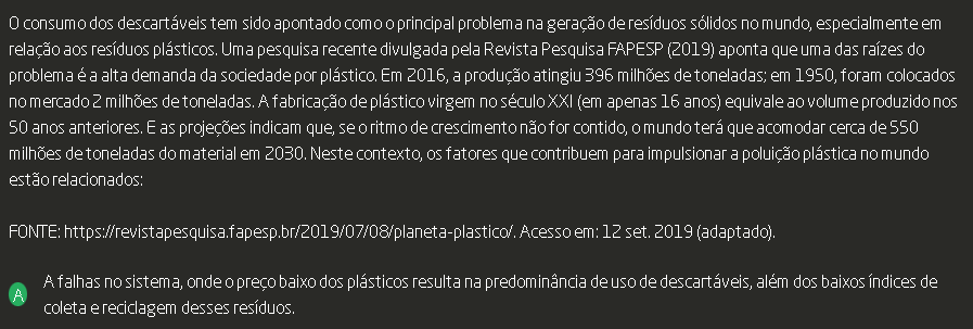 0 consumo dos descartáveis tem sido apontado como principal problema na geração de resíduos sólidos no mundo, especialmente em relação aos resíduos plásticos. Uma pesquisa recente divulgada pela Revista Pesquisa FAPESP (2019) aponta que uma das raízes do problema é a alta demanda da sociedade por plástico. Em 2016, a produção atingiu 396 milhões de toneladas; em 1950, foram colocados no mercado 2 milhões de toneladas. A fabricação de plástico virgem no século XXI (em apenas 16 anos) equivale ao volum e produzido nos anos anteriores. E as projeções indicam que, se O ritmo de crescimento não for contido, mundo terá que acomodar cerca de SSO milhões de toneladas do material em 2030. Neste contexto, fatores que contribuem para impulsionar a poluição plástica no mundo estão relacionados: em: 12 set. 2019 (adaptado). A falhas no sistema, onde preço baixo dos plásticos resulta na predominância de uso de descartáveis, além dos baixos índices de A coleta e recidagem desses