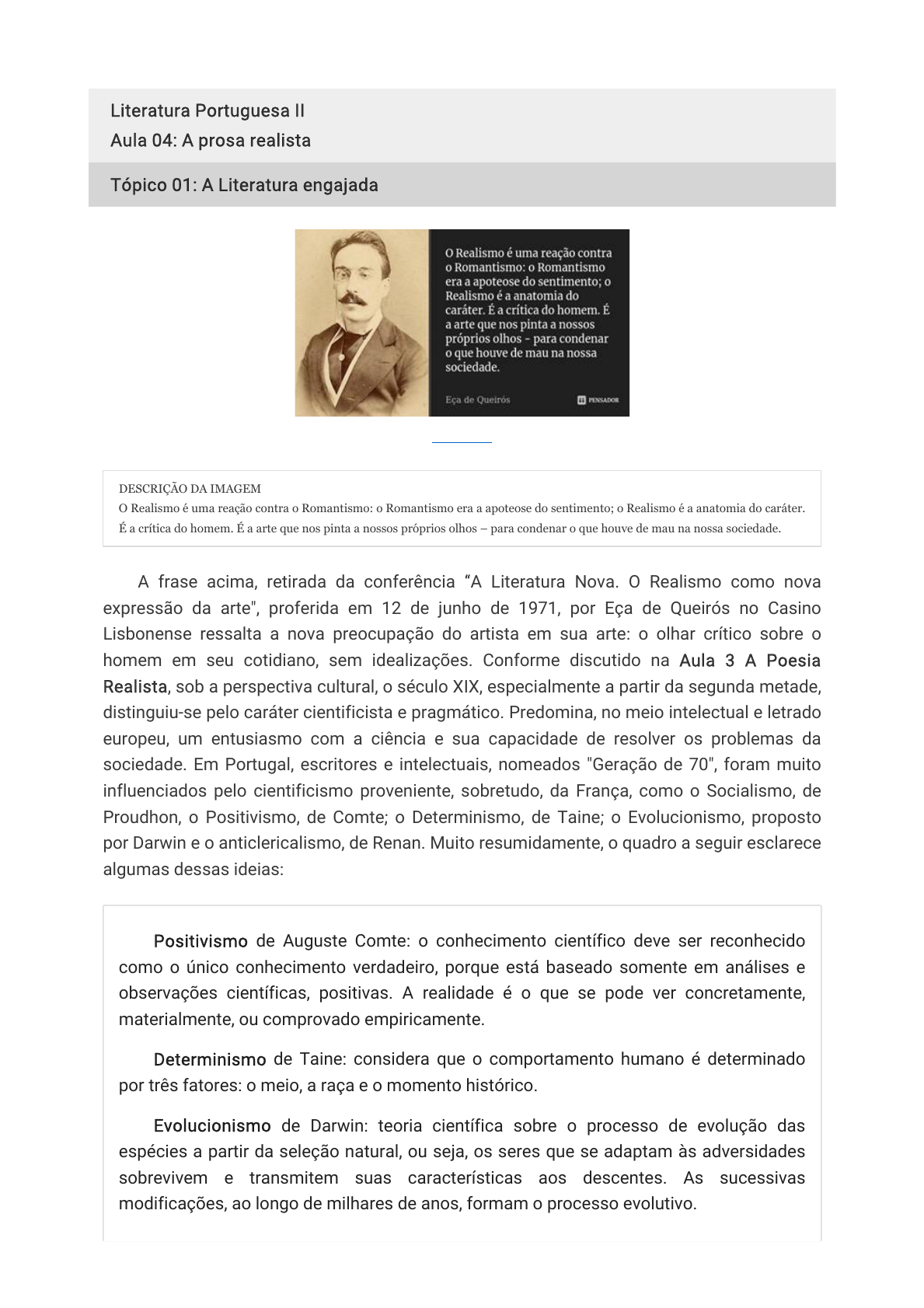 Literatura Portuguesa II Aula 04: A prosa realista Tópico 01: A Literatura engajada Fonte [1] DESCRIÇÃO DA IMAGEM O Realismo é uma reação contra o Romantismo: o Romantismo era a apoteose do sentimento; o Realismo é a anatomia do caráter. É a crítica do homem. É a arte que nos pinta a nossos próprios olhos – para condenar o que houve de mau na nossa sociedade. A frase acima, retirada da conferência “A Literatura Nova. O Realismo como nova expressão da arte", proferida em 12 de junho de 1971, por Eça de Queirós no Casino Lisbonense ressalta a nova preocupação do artista em sua arte: o olhar crítico sobre o homem em seu cotidiano, sem idealizações. Conforme discutido na Aula 3 A Poesia Realista, sob a perspectiva cultural, o século XIX, especialmente a partir da segunda metade, distinguiu-se pelo caráter cientificista e pragmático. Predomina, no meio intelectual e letrado europeu, um entusiasmo com a ciência e sua capacidade de resolver os problemas da sociedade. Em Portugal, escritores e intelectuais, nomeados "Geração de 70", foram muito influenciados pelo cientificismo proveniente, sobretudo, da França, como o Socialismo, de Proudhon, o Positivismo, de Comte; o Determinismo, de Taine; o Evolucionismo, proposto por Darwin e o anticlericalismo, de Renan. Muito resumidamente, o quadro a seguir esclarece algumas dessas ideias: Positivismo de Auguste Comte: o conhecimento científico deve ser reconhecido como o único conhecimento verdadeiro, porque está baseado somente em análises e observações científicas, positivas. A realidade é o que se pode ver concretamente, materialmente, ou comprovado empiricamente. Determinismo de Taine: considera que o comportamento humano é determinado por três fatores: o meio, a raça e o momento histórico. Evolucionismo de Darwin: teoria científica sobre o processo de evolução das espécies a partir da seleção natural, ou seja, os seres que se adaptam às adversidades sobrevivem e transmitem suas características aos descentes. As sucessivas modificações, ao longo de milhares de anos, formam o processo evolutivo. 132 impresso_parciais.pdf LiteraturaPortuguesaII_aula_04.pdf