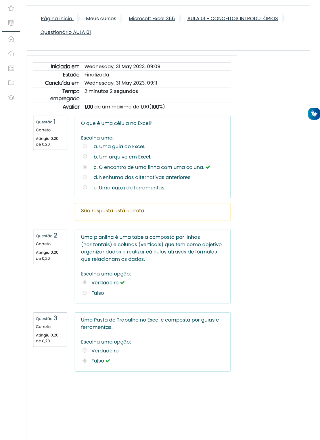 01/06/2023, 22:08 Questionário AULA 02 https://emaspead.prefeitura.sp.gov.br/mod/quiz/review.php?attempt=249749&cmid=4414 1/2 Página inicial Meus cursos Microsoft Excel 365 AULA 02 - ATALHOS Questionário AULA 02 Questão 1 Correto Atingiu 0,20 de 0,20 Questão 2 Correto Atingiu 0,20 de 0,20 Iniciado em Thursday, 1 Jun 2023, 22:02 Estado Finalizada Concluída em Thursday, 1 Jun 2023, 22:04 Tempo empregado 2 minutos 3 segundos Avaliar 1,00 de um máximo de 1,00(100%) Qual atalho serve para chegar na última linha preenchida da tabela sem precisar passar célula por célula? Escolha uma: a. Ctrl + seta para baixo b. Nenhuma das alternativas c. Ctrl + seta para a direita d. Ctrl + seta para a esquerda e. Ctrl + seta para cima Sua resposta está correta. Como mudar de planilha no Excel 365? Escolha uma: a. Nenhuma das alternativas b. Ctrl + Pg Dn (PageDown) c. Ctrl + Pg Up (PageUp) d. Todas as alternativas e. Clicando nas planilhas na parte inferior da tela. Sua resposta está correta. https://emaspead.prefeitura.sp.gov.br/ https://emaspead.prefeitura.sp.gov.br/course/view.php?id=90 https://emaspead.prefeitura.sp.gov.br/course/view.php?id=90#section-5 https://emaspead.prefeitura.sp.gov.br/mod/quiz/view.php?id=4414 https://emaspead.prefeitura.sp.gov.br/admin/tool/lp/coursecompetencies.php?courseid=90 https://emaspead.prefeitura.sp.gov.br/grade/report/index.php?id=90 https://emaspead.prefeitura.sp.gov.br/ https://emaspead.prefeitura.sp.gov.br/my/ https://emaspead.prefeitura.sp.gov.br/calendar/view.php?view=month&course=90 javascript:void(0); javascript:void(0); 01/06/2023, 22:08 Questionário AULA 02 https://emaspead.prefeitura.sp.gov.br/mod/quiz/review.php?attempt=249749&cmid=4414 2/2 Questão 3 Correto Atingiu 0,20 de 0,20 Questão 4 Correto Atingiu 0,20 de 0,20 Questão 5 Correto Atingiu 0,20 de 0,20 Para que serve o preenchimento relâmpago no Excel 365? Escolha uma: a. Nenhuma das alternativas b. Para criar uma tabela dinâmica c. Para mudar a formatação das células d. Para replicar uma lógica aplicada em um conjunto de células e. Para selecionar várias células de uma vez Sua resposta está correta. Como selecionar todas as células de uma coluna no Excel 365? Escolha uma: a. Nenhuma das alternativas b. Ctrl + C c. Ctrl + barra de espaço d. Ctrl + Shift + Seta na direção desejada e. Ctrl + T Sua resposta está correta. Qual a finalidade dos atalhos no Excel 365? Escolha uma: a. Deixar o Excel mais bonito. b. Aumentar o tamanho das células. c. Deixar o Excel mais organizado. d. Facilitar o trabalho e ganhar tempo. e. Nenhuma das alternativas acima. Sua resposta está correta. Manter contato Escola Municipal de Administração Pública de São Paulo - EMASP https://emaspead.prefeitura.sp.gov.br emaspead@prefeitura.sp.gov.br Resumo de retenção de dados Obter o aplicativo para dispositivos móveis https://emaspead.prefeitura.sp.gov.br/ mailto:emaspead@prefeitura.sp.gov.br https://pt-br.facebook.com/emasppmsp https://emaspead.prefeitura.sp.gov.br/admin/tool/dataprivacy/summary.php https://download.moodle.org/mobile?version=2018120301&lang=pt_br&iosappid=633359593&androidappid=com.moodle.moodlemobile https://emaspead.prefeitura.sp.gov.br/admin/tool/lp/coursecompetencies.php?courseid=90 https://emaspead.prefeitura.sp.gov.br/grade/report/index.php?id=90 https://emaspead.prefeitura.sp.gov.br/ https://emaspead.prefeitura.sp.gov.br/my/ https://emaspead.prefeitura.sp.gov.br/calendar/view.php?view=month&course=90 javascript:void(0); javascript:void(0); AULA 03 AULA 04 AULA 05 MÓDULO 6 AULA 07 06/06/2023, 20:05 Questionário AULA 08 https://emaspead.prefeitura.sp.gov.br/mod/quiz/review.php?attempt=255454&cmid=4462 1/5 Página inicial Meus cursos Microsoft Excel 365 AULA 08 - FUNÇÕES Questionário AULA 08 Questão 1 Correto Atingiu 0,10 de 0,10 Questão 2 Correto Atingiu 0,10 de 0,10 Iniciado em Tuesday, 6 Jun 2023, 19:59 Estado Finalizada Concluída em Tuesday, 6 Jun 2023, 20:05 Tempo empregado 6 minutos 2 segundos Avaliar 1,00 de um máximo de 1,00(100%) Qual é o argumento que não é obrigatório na função PROCV do Excel? Escolha uma: a. Matriz tabela. b. Todos os argumentos são obrigatórios. c. Núm índice. d. Procurar intervalo. e. Valor procurado. Sua resposta está correta. A resposta correta é: Procurar intervalo.. Qual é a estrutura da função PROCV do Excel? Escolha uma: a. Teste lógico, resultado verdadeiro e resultado falso. b. Intervalo de células, condição e resultado. c. Valor procurado, matriz tabela, núm índice e procurar intervalo. d. Valor procurado, matriz tabela e núm índice. e. Nenhuma das alternativas acima. Sua resposta está correta. A resposta correta é: Valor procurado, matriz tabela, núm índice e procurar intervalo.. https://emaspead.prefeitura.sp.gov.br/ https://emaspead.prefeitura.sp.gov.br/course/view.php?id=90 https://emaspead.prefeitura.sp.gov.br/course/view.php?id=90#section-11 https://emaspead.prefeitura.sp.gov.br/mod/quiz/view.php?id=4462 https://emaspead.prefeitura.sp.gov.br/admin/tool/lp/coursecompetencies.php?courseid=90 https://emaspead.prefeitura.sp.gov.br/grade/report/index.php?id=90 https://emaspead.prefeitura.sp.gov.br/ https://emaspead.prefeitura.sp.gov.br/my/ https://emaspead.prefeitura.sp.gov.br/calendar/view.php?view=month&course=90 javascript:void(0); javascript:void(0); 06/06/2023, 20:05 Questionário AULA 08 https://emaspead.prefeitura.sp.gov.br/mod/quiz/review.php?attempt=255454&cmid=4462 2/5 Questão 3 Correto Atingiu 0,10 de 0,10 Questão 4 Correto Atingiu 0,10 de 0,10 Questão 5 Correto Atingiu 0,10 de 0,10 Como podemos adicionar mais de um critério na função CONT.SES? Escolha uma: a. Utilizando vírgulas entre os critérios. b. Utilizando aspas duplas entre os critérios. c. Utilizando dois pontos entre os critérios. d. Utilizando ponto e vírgula entre os critérios. e. Nenhuma das alternativas acima. Sua resposta está correta. A resposta correta é: Utilizando ponto e vírgula entre os critérios.. Qual 