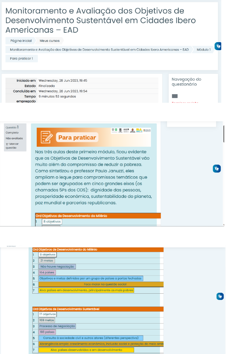 Monitoramento e Avaliação dos Objetivos de Desenvolvimento Sustentável em Cidades Ibero Americanas – EAD MÓDULO 1 - PARA PRATICAR Página inicial Meus cursos Monitoramento e Avaliação dos Objetivos de Desenvolvimento Sustentável em Cidades Ibero Americanas – EAD Módulo 1 Avaliação obrigatória - Módulo 1 Questão 1 Completo Não avaliada Iniciado em Wednesday, 28 Jun 2023, 21:59 Estado Finalizada Concluída em Wednesday, 28 Jun 2023, 22:07 Tempo empregado 7 minutos 17 segundos Avaliar 2,00 de um máximo de 2,00(100%) Qual (ou quais) das palavras, siglas ou expressões da tabela você SABE O QUE SIGNIFICA(M)? (Marque quantas alternativas quiser e considerar válidas). * essa questão não vale ponto * Escolha uma ou mais: a. Vulnerabilidade ambiental b. Desenvolvimento sustentável e Sustentabilidade c. Pegada de carbono d. Consumo consciente/sustentável/responsável e Economia Circular e. Resiliência ambiental f. Aquecimento global e Mudança climática g. Agricultura de Baixo Carbono (ABC) e Agroecologia h. Gases de Efeito Estufa (GEE) i. Conservacionismo j. Ecossistema e Biodiversidade Sua resposta está correta. Os ODS não são compromissos jurídicos, mas compromissos políticos. Segundo a ONU, os países são responsáveis pelo acompanhamento e pela revisão, em nível nacional e local, dos avanços na implementação dos ODS. Para isso, a adesão dos municípios é de extrema importância e para poder participar deste processo, tão importante é fundamental entender os termos usados nesta Agenda, deste modo pode -se fortalecer o apoio da adesão nos níveis subnacionais. https://emaspead.prefeitura.sp.gov.br/ https://emaspead.prefeitura.sp.gov.br/course/view.php?id=55 https://emaspead.prefeitura.sp.gov.br/course/view.php?id=55#section-1 https://emaspead.prefeitura.sp.gov.br/mod/quiz/view.php?id=1918 https://emaspead.prefeitura.sp.gov.br/admin/tool/lp/coursecompetencies.php?courseid=55 https://emaspead.prefeitura.sp.gov.br/grade/report/index.php?id=55 https://emaspead.prefeitura.sp.gov.br/ https://emaspead.prefeitura.sp.gov.br/my/ https://emaspead.prefeitura.sp.gov.br/calendar/view.php?view=month&course=55 javascript:void(0); javascript:void(0); Questão 2 Correto Atingiu 0,40 de 0,40 A Agenda 2030 é fruto de uma série de pactuações internacionais anteriores. Dentre elas, destaca-se a Agenda 21, pactuada em 1992 no Brasil, Rio de Janeiro. Sobre essa pactuação, assinale a alternativa que contenha seus 3 princípios norteadores. Escolha uma: a. Crescimento Econômico, inclusão social e proteção do Meio Ambiente. Essa assertiva está correta, pois se enquadra no contexto de desenvolvimento e implementação dos Objetivos do Milênio pela O.N.U que tinham como premissa objetivos que englobasse problemas em amplas escalas como as desigualdades econômicas, sociais e proteção ambiental b. Inclusão digital e social, crescimento econômico e proteção do Meio Ambiente c. Erradicar a analfabetização, acabar com a corrupção e aumentar o Produto Interno Bruto (PIB). d. Inclusão digital, participação social e proteção do Meio Ambiente. e. Proteger o meio ambiente, erradicar a analfabetização e aumentar o Produto Interno Bruto (PIB). Sua resposta está correta. A Agenda 2030 conta com uma série de antecedentes importantes, que foram construindo as bases para a pactuação internacional de 2015. A Agenda 21 está entre os principais antecedentes. Ligada a um contexto desenvolvimentista global, é principalmente a partir dela que crescimento econômico, inclusão social e proteção do meio ambiente assumem papel de destaque. https://emaspead.prefeitura.sp.gov.br/admin/tool/lp/coursecompetencies.php?courseid=55 https://emaspead.prefeitura.sp.gov.br/grade/report/index.php?id=55 https://emaspead.prefeitura.sp.gov.br/ https://emaspead.prefeitura.sp.gov.br/my/ https://emaspead.prefeitura.sp.gov.br/calendar/view.php?view=month&course=55 javascript:void(0); javascript:void(0); Questão 3 Correto Atingiu 0,40 de 0,40 Com base nos conhecimentos adquiridos na Unidade 1, escolha a alternativa que define, corretamente, o Desenvolvimento Sustentável. Escolha uma: a. O Desenvolvimento Sustentável é aquele que prioriza a proteção do meio ambiente sobre o crescimento econômico e a inclusão social. b. O Desenvolvimento Sustentável é aquele que procura satisfazer as necessidades da geração atual, sem comprometer a capacidade das futuras gerações de satisfazerem as suas próprias necessidades. Esta questão está correta, visto que, conforme a definição prevista no Relatório Brundtland, o Desenvolvimento Sustentável é aquele que procura satisfazer as necessidades da geração atual sem comprometer a capacidade das gerações futuras de satisfazerem as suas próprias necessidades. Saiba isso e outras questões relevantes sobre o Desenvolvimento Sustentável acessando "As Perguntas Mais Frequentes sobre os Objetivos de Desenvolvimento Sustentável (ODS)”. Produzido pelo PNUD, o Programa das Nações Unidas para o Desenvolvimento, o órgão da ONU responsável pelos ODS. c. O Desenvolvimento Sustentável é aquele que concilia proteção do meio ambiente com a inclusão social, mas não se preocupa com o crescimento econômico. d. O Desenvolvimento Sustentável é aquele que concilia proteção do meio ambiente com o crescimento econômico, mas não se preocupa com a inclusão social. e. O Desenvolvimento Sustentável é aquele que procura satisfazer as necessidades da geração atual, sem se preocupar com a capacidade das futuras gerações de satisfazerem as suas próprias necessidades. Sua resposta está correta. Conforme definição prevista no Relatório Brundtland, o Desenvolvimento Sustentável é aquele que procura satisfazer as necessidades da geração atual sem comprometer a capacidade das gerações futuras de satisfazerem as suas próprias necessidades. Saiba isso e outras questões relevantes sobre o Desenvolvimento Sustentável acessando As