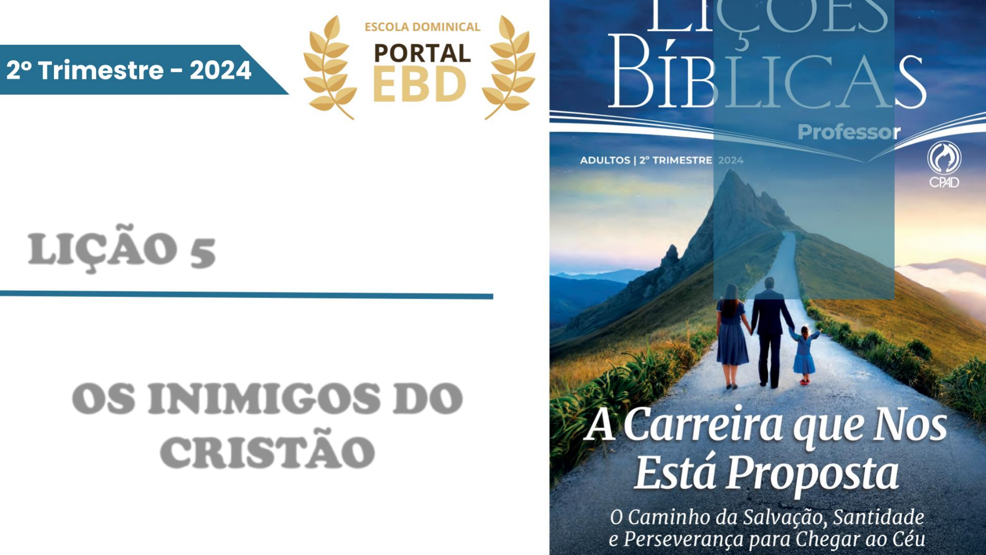 OS INIMIGOS DO CRISTÃO LIÇÃO 5 ONa continuidade do estudo da vida cristã como “o Caminho”, veremos hoje quais são os inimigos do cristão. OO cristão tem três inimigos: o diabo, o mundo e a carne. www.portalebd.org.br Slide 2 OO caminho da salvação exige emprego de força (Lc.16:16), pois se trata de uma caminhada que contraria o curso deste mundo (Ef.2:2). OUma outra forma de vermos a vida cristã é como uma constante luta contra o maligno. Estamos num sistema dominado pelo mal, o “império da morte” (Hb.2:14), e não é da vontade de Cristo que sejamos tirados dele, mas, sim, que sejamos libertos do mal (Jo.17:15). www.portalebd.org.br Slide 3 O A caminhada para a Jerusalém celestial é repleta de percalços, oposições e contradições, como nos mostram duas figuras do Antigo Testamento que têm esta aplicação espiritual: a jornada da geração do êxodo no deserto rumo a Canaã como também a jornada dos que voltaram do exílio sob o comando de Esdras. O Os israelitas, no deserto, enfrentaram inimigos externos, como os amalequitas (Ex.17:8-16), a quem venceram, e os amalequitas e cananeus, onde sofreram derrota (Nm.14:44,45). www.portalebd.org.br Slide 4 OMas, também, enfrentaram inimigos internos, seja o vulgo que se misturou com o povo de Israel na saída do Egito e que levou o povo a cometer pecados (Ex.12:38; Nm.11:4-10); sejam os israelitas que se rebelaram contra o Senhor, como os dez espias (Nm.14:36,37); Datã, Corá e Abirão (Nm.16). ONos dias de Esdras, tiveram os israelitas também de enfrentar inimigos externos (Ed.8:31). www.portalebd.org.br Slide 5 O Iniciemos pelo inimigo externo, ou seja, o diabo, que é auxiliado pelos seus anjos, os demônios, que são a terça parte dos seres angelicais criados por Deus e que seguiram Satanás em sua rebelião (Ap.12:3,4). O Estando unidos a Cristo, nada mais temos com o diabo, pois nada do diabo está em Jesus (Jo.14:30) e, desta maneira, surge, então, uma insuperável separação entre nós e o diabo, que se torna, assim, o nosso adversário (é este o significado, aliás, da palavra “Satanás”) (I Pe.5:8), o nosso acusador (que é o significado da palavra “diabo”) (Ap.12:10). www.portalebd.org.br Slide 6 OO diabo é apresentado em Ap.12:7 como sendo “o grande dragão, a antiga serpente, chamada o diabo e Satanás, que engana todo o mundo”. OAo falar que se trata de um “grande dragão”, o texto bíblico já mostra que se trata de uma fera, ou seja, um ser que não poupa qualquer outro ser, que tem um instinto destruidor, daí porque o Senhor Jesus o denominá-lo de “homicida desde o princípio” (Jo.8:44). www.portalebd.org.br Slide 7 O Já vemos, por isso, que não há como trafegarmos no caminho da salvação sem ter a fúria do diabo contra nós. OMas, além de ser chamado de “dragão”, ele também é dito ser “o grande dragão”. Esta expressão mostra que é ele “o príncipe deste mundo” (Jo.12:31; 14:30; 16:11), o chefe de todos os anjos que pecaram, um ser poderoso e que, por ser anjo, é superior aos homens (Sl.8:5). www.portalebd.org.br Slide 8 OSeu papel é acusar todos aqueles que se encontram trafegando pelo caminho da salvação, buscando, com isso, minar a comunhão que existe entre Deus e os Seus servos. OA condição de acusador por parte do diabo é mais um indicativo de que não é possível a trégua com o diabo, como alguns são iludidos a pensar. www.portalebd.org.br Slide 9 OO diabo sempre se opõe aos servos do Senhor, pois ele se levanta contra tudo que diz respeito a Deus. OEle se opõe ao Senhor e, portanto, opor-se-á a todos os que forem feitos filhos de Deus por terem crido em o nome de Jesus (Jo.1:12). www.portalebd.org.br Slide 10 OAo crermos em Cristo, deixamos de ser filhos do diabo para passarmos a ser filhos de Deus e, desta maneira, não mais satisfazemos os desejos de Satanás (Jo.8:44). OSempre estamos a desagradar-lhe e há uma constante e total oposição entre nós e ele. Jesus veio estabelecer a inimizade entre o homem e o diabo (Gn.3:15). www.portalebd.org.br Slide 11 O Tudo o que se disse com relação ao diabo, também se aplica aos seus anjos, que são os demônios, compondo este grupo o que o apóstolo Paulo denominou de “principados, potestades, príncipes das trevas deste século, hostes espirituais da maldade nos lugares celestiais” (Ef.6:12). O Vivemos numa verdadeira batalha espiritual, pois estes seres sempre estão a nos atacar, a nos perturbar, estando em ação contínua e cada vez mais crescente, já que sabem que está muito próxima a execução de suas sentenças condenatórias. www.portalebd.org.br Slide 12 O Precisamos estar devidamente preparados para este embate, revestindo-nos da armadura de Deus (Ef.6:11- 18), dotando-nos de armas poderosas em Deus para destruição das fortalezas (II Co.10:4). O Nesta luta contra o diabo e seus anjos devemos ser revestidos de poder, para que, cheios do Espírito Santo, sejam usados na expulsão de demônios e na cura de enfermidades (parte delas provocadas por demônios), como também vivermos e pregarmos uma vida de santidade e de luta contra a idolatria, que nada mais é que culto a demônios (I Co.10:14-21). www.portalebd.org.br Slide 13 ODepois de termos visto o inimigo externo, que é o diabo e seus anjos, vamos tratar, ainda, de um inimigo externo, mas um inimigo externo “próximo”: o mundo. OO mundo é um sistema contrário a Deus, liderado por Satanás, uma organização rebelde contra o Senhor, que busca ter uma vida independente do senhorio divino, em que prevalece a maldade e o pecado. www.portalebd.org.br Slide 14 O Este sistema é liderado pelo diabo, que, por isso mesmo, é chamado pelo Senhor Jesus de “princípio deste mundo” (Jo.12:31; 14:30; 16:11), formado por todos os seres, demônios e homens, que rejeitam obedecer a Deus e que pretendem ter uma vida independente, querendo dizer a si mesmos o que é o bem e o que é o mal. O Este “mundo” est