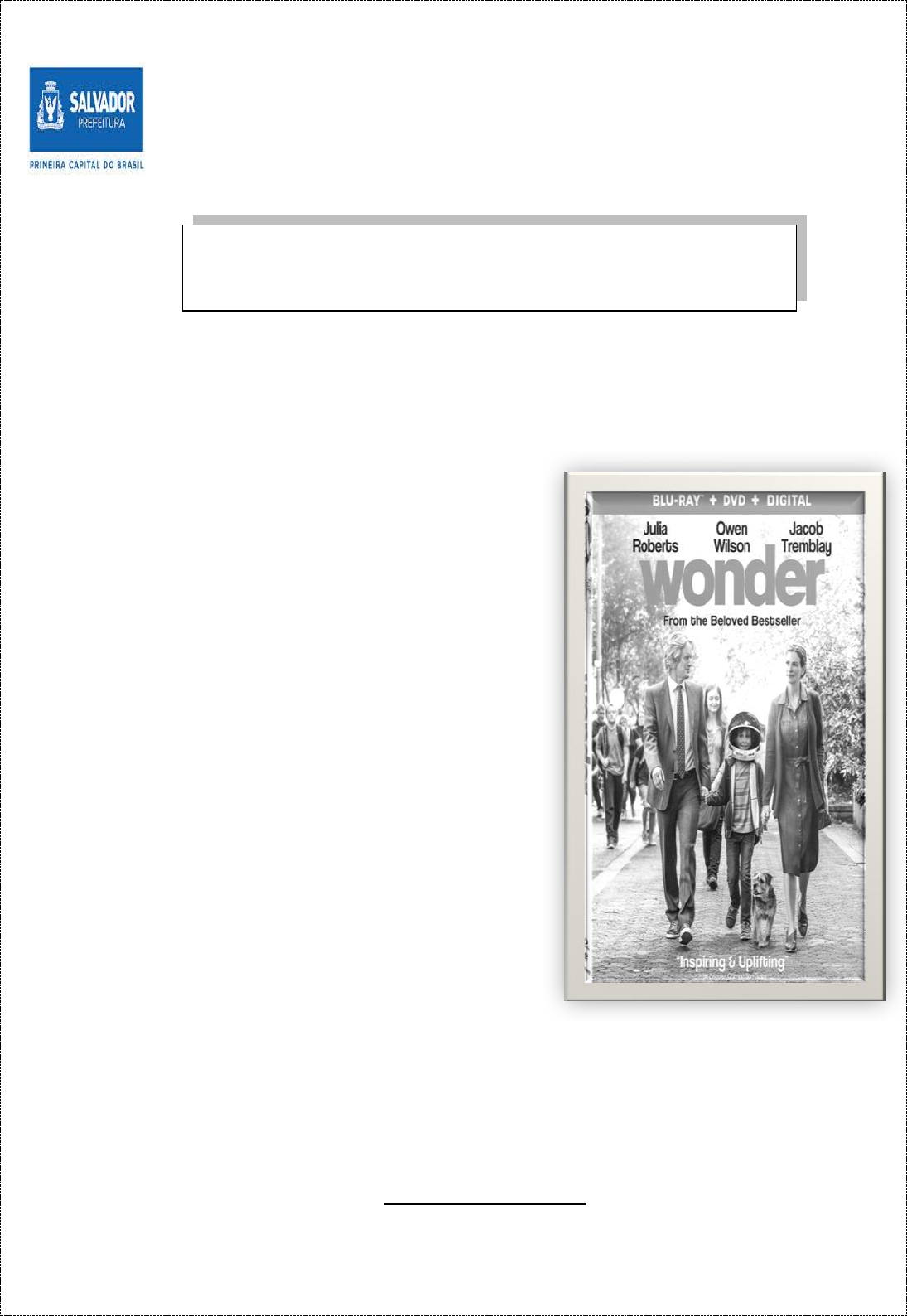 PREFEITURA MUNICIPAL DO SALVADOR – PMS SECRETARIA MUNICIPAL DE EDUCAÇÃO – SMED Escola:_________________________________________________ Data:_______/_____/________ Série: 6º e 7º ANO SEGMENTO ENSINO FUNDAMENTAL II- DISCIPLINA: LÍNGUA PORTUGUESA– ANO: 2020 PROJETO BULLYING Assista o filme “Extraordinário” e depois responda as questões. O filme “Extraordinário” consegue abordar temas delicados com leveza Com cenas leves e, até mesmo, cômicas, a história consegue tratar de temas complexos, sem entrar em uma atmosfera melodramática. Com a impecável atuação de Jacob Tremblay (Auggie), Julia Roberts (mãe), Owen Wilson (pai) e Isabela Vidovic (irmã), o filme diverte e emociona adultos e pequenos, abordando temas como superação, bullying, preconceito e família. O filme possibilita o diálogo sobre bullying O tema central que guia o enredo do filme Extraordinário, é o bullying sofrido por Auggie quando ele passa a frequentar a escola e a conviver com outras crianças. No entanto, a história não retrata isso de forma pesada, possibilitando uma reflexão sobre o tema, até mesmo, entre os próprios agressores. Essa é uma ótima oportunidade de introduzir o assunto e conversar com seu pequeno sobre preconceito e ensiná-lo a respeitar as diferenças. http://leiturinha.com.br/blog/precisamos-falar-sobre-bullying/ http://leiturinha.com.br/blog/respeitar-as-diferencas/ Trabalhando com o filme Extraordinário Após assistir o filme “Extraordinário” responda todas as questões abaixo! 1-Identifique as personagens principais do filme. ______________________________________________________________________ ______________________________________________________________________ 2- August Pulmman entrou na escola com 10 anos. Por que isso aconteceu? ______________________________________________________________________ ______________________________________________________________________ 3- Qual a razão de Auggie dizer que gostaria que todos os dias fossem Halloween? ______________________________________________________________________ ______________________________________________________________________ 4- Qual a parte do filme que você mais gostou? ______________________________________________________________________ ______________________________________________________________________ ______________________________________________________________________ 5- O que você sabe sobre Bullying? ______________________________________________________________________ ______________________________________________________________________ ______________________________________________________________________ 6- Você já sofreu ou viu alguém sofrer preconceito ou bullying na escola? Conte como foi, não precisa citar nomes, só contar o ocorrido. ______________________________________________________________________ ______________________________________________________________________ ______________________________________________________________________ ______________________________________________________________________ ______________________________________________________________________ 7- Que lição você aprendeu com o filme? ______________________________________________________________________ ______________________________________________________________________ ______________________________________________________________________ ______________________________________________________________________ 8- O que você diria a uma pessoa que comete bullying? ______________________________________________________________________ ______________________________________________________________________ ______________________________________________________________________ ______________________________________________________________________ Devemos aprender a respeitar as diferenças!