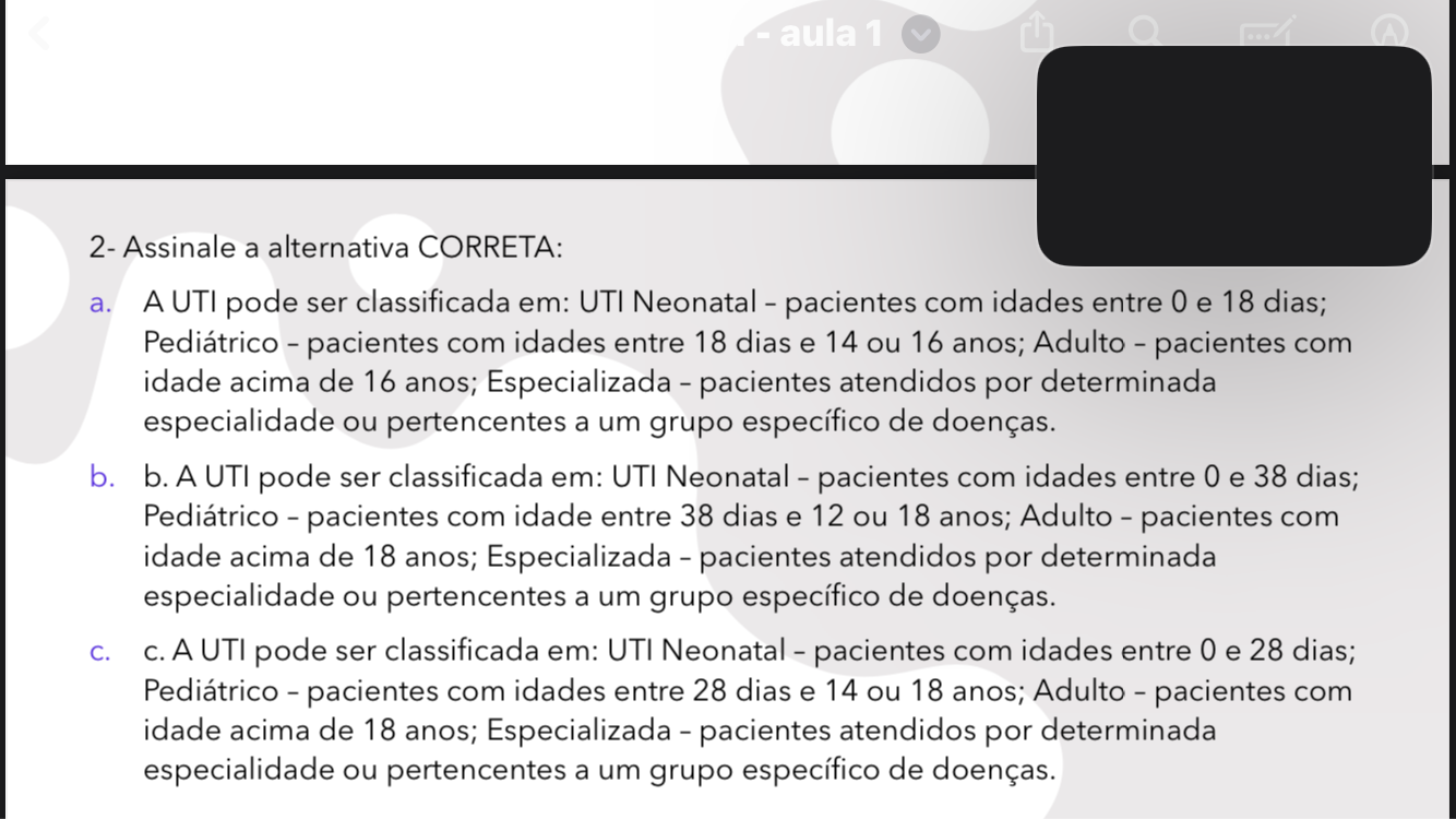 aula 1 2- Assinale a alternativa CORRETA: a. A UTI pode ser classificada em: UTI Neonatal - pacientes com idades entre 0 e 18 dias; Pediátrico - pacientes com idades entre 18 dias e 14 ou 16 anos; Adulto - pacientes com idade acima de 16 anos; Especializada - pacientes atendidos por determinada especialidade ou pertencentes a um grupo específico de doenças. b. b. A UTI pode ser classificada em: UTI Neonatal - pacientes com idades entre 0 e 38 dias; Pediátrico - pacientes com idade entre 38 dias e 12 ou 18 anos; Adulto - pacientes com idade acima de 18 anos; Especializada - pacientes atendidos por determinada especialidade ou pertencentes a um grupo específico de doenças. C. C. A UTI pode ser classificada em: UTI Neonatal - pacientes com idades entre 0 e 28 dias; Pediátrico - pacientes com idades entre 28 dias e 14 ou 18 anos; Adulto - pacientes com idade acima de 18 anos; Especializada - pacientes atendidos por determinada especialidade ou pertencentes a um grupo específico de doenças.