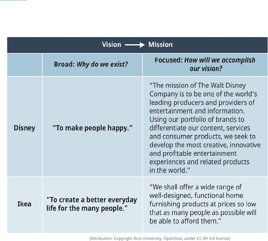 starting a business in order to be their own boss, they must also have an idea about what their business will do. Overall, entrepreneurs start businesses for a variety of reasons. A vision statement is an expression of what a business’s founders want that business to accomplish. The vision statement is usually very broad, and it does not even have to mention a product or service. The vision statement does not describe the strategy a firm will use to follow its vision—it is simply a sentence or two that states why the business exists. While a firm’s vision statement is a general statement about its values, a firm’s mission statement is more specific. The mission statement takes the why of a vision statement and gives a broad description of how the firm will try to make its vision a reality. A mission statement is still not exactly a strategy, but it focuses on describing the products a firm plans to offer or the target markets it plans to serve. Exhibit 9.4 gives examples of vision and mission statements for the Walt Disney Company and for Ikea. Notice that in both cases, the vision statement is very broad and is not something a business could use as a strategy because there’s simply not enough information to exhibit out what kind of business they might be. The mission statements, on the other hand, describe the products and services each company plans to offer and the customers each company plans to serve in order to fulfill their vision. Exhibit 9.4 Vision and Mission Statements (Attribution: Copyright Rice University, OpenStax, under CC-BY 4.0 license) An interesting thing to note about vision and mission statements is that many companies confuse them, calling a very broad statement their mission. For example, Microsoft says that its mission is “to help people around the world realize their full potential.”4 By the description above, this would be a good vision statement. However, Microsoft’s official vision statement is to “empower people through great software anytime, anyplace, and on any device.”5 Although the second statement is also quite broad, it does say how Microsoft wants to achieve the first statement, which makes it a better mission statement than vision statement. 282 Chapter 9 The Strategic Management Process: Achieving and Sustaining Competitive Advantage This OpenStax book is available for free at http://cnx.org/content/col28330/1.8 Why are vision and mission statements important to a firm’s strategy for developing a competitive advantage? To put it simply, you can’t make a plan or strategy unless you know what you want to accomplish. Vision and mission statements together are the first building blocks in defining why a firm exists and in developing a plan to accomplish what the firm wants to accomplish. 9.3 The Role of Strategic Analysis in Formulating a Strategy 3. Why is strategic analysis important to strategy formulation? In the previous chapter, you read about the various levels of analysis that a manager carries out in order to understand their firm’s competitive environment. A strategic analysis of a firm’s external environment (the world, competitors) and internal environment (firm capabilities and resources) gives its managers a clear picture of what they have to work with and also what needs to be addressed when developing a plan for the firm’s success. Analysis comes early in the strategic process because the information a manager gets from the analysis informs the decision-making that follows. The information is so critical that entrepreneurs writing business plans (before the business even exists) do this analysis to understand if their business idea is feasible, and to understand how to position their business relative to existing competitors or potential customers in order to maximize their odds of success. Exhibit 9.5 outlines just a few of the questions that strategic analysis tools can help answer. Exhibit 9.5 Some Questions That Strategic Analysis Should Answer As an example of how the strategic tools help inform decisions, look back at the Walt Disney mission and vision in Exhibit 9.4. Imagine if you were Mr. Walt Disney today, and you wanted to start a company with a vision of making people happy in the 21st century. What products or services would you plan to offer? A PESTEL analysis would tell you that technology is an important part of entertainment and that sociocultural trends include people’s preference for on-demand entertainment, to be convenient and compatible with their busy schedules. Disney’s mission statement is broad enough about products and services to include a wide C O N C E P T C H E C K 1. What does a mission statement explain about a firm that a vision statement does not? 2. What are the similarities and differences between vision and mission? Chapter 9 The Strategic Management Process: Achieving and Sustaining Competitive Advantage 283 variety of offerings (they are thinking about the future too!), but if you were starting this company today, where would you start? Would you make movies for movie theaters, or develop a way to offer video entertainment online? Would you make console video games or phone apps? Who would your competition be, and what do they offer? How could you offer something better or cheaper? Managers learn about the conditions that their business will have to operate in by doing strategic analysis, and understanding those conditions is required in order to develop the plans and actions that will lead to success. 9.4 Strategic Objectives and Levels of Strategy 4. What are strategic objectives, levels of strategy, and a grand strategy? How are they related? Once a strategic analysis has been completed, the next step in the strategy process is to establish strategic objectives. At this point, the manager has decided why the company exists and how it will try to fulfill its mission. Strategic analysis has provided information about customer preferences, competitors, and the fir