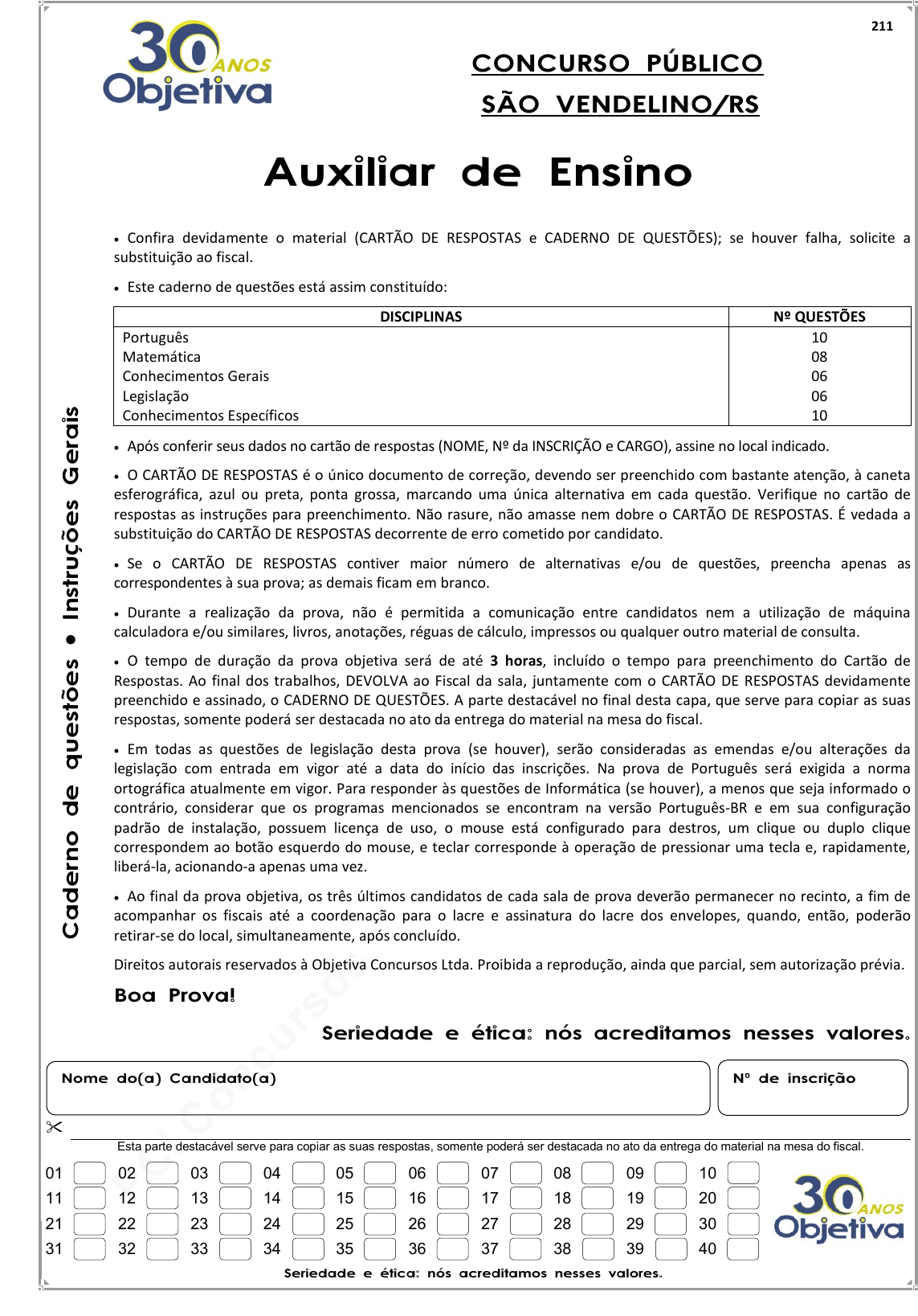 pcimarkpci MDAwMDowMDAwOjAwMDA6MDAwMDowMDAwOmZmZmY6Yzg2YzpiMjc4:VGh1LCAwNCBKdWwgMjAyNCAxNjozODoyNyAtMDMwMA== www.pciconcursos.com.br C a d e rn o d e q u e st õ e s • In st ru çõ e s G e ra is 211 CONCURSO PÚBLICO SÃO VENDELINO/RS Auxiliar de Ensino • Confira devidamente o material (CARTÃO DE RESPOSTAS e CADERNO DE QUESTÕES); se houver falha, solicite a substituição ao fiscal. • Este caderno de questões está assim constituído: DISCIPLINAS Nº QUESTÕES Português Matemática Conhecimentos Gerais Legislação Conhecimentos Específicos 10 08 06 06 10 • Após conferir seus dados no cartão de respostas (NOME, Nº da INSCRIÇÃO e CARGO), assine no local indicado. • O CARTÃO DE RESPOSTAS é o único documento de correção, devendo ser preenchido com bastante atenção, à caneta esferográfica, azul ou preta, ponta grossa, marcando uma única alternativa em cada questão. Verifique no cartão de respostas as instruções para preenchimento. Não rasure, não amasse nem dobre o CARTÃO DE RESPOSTAS. É vedada a substituição do CARTÃO DE RESPOSTAS decorrente de erro cometido por candidato. • Se o CARTÃO DE RESPOSTAS contiver maior número de alternativas e/ou de questões, preencha apenas as correspondentes à sua prova; as demais ficam em branco. • Durante a realização da prova, não é permitida a comunicação entre candidatos nem a utilização de máquina calculadora e/ou similares, livros, anotações, réguas de cálculo, impressos ou qualquer outro material de consulta. • O tempo de duração da prova objetiva será de até 3 horas, incluído o tempo para preenchimento do Cartão de Respostas. Ao final dos trabalhos, DEVOLVA ao Fiscal da sala, juntamente com o CARTÃO DE RESPOSTAS devidamente preenchido e assinado, o CADERNO DE QUESTÕES. A parte destacável no final desta capa, que serve para copiar as suas respostas, somente poderá ser destacada no ato da entrega do material na mesa do fiscal. • Em todas as questões de legislação desta prova (se houver), serão consideradas as emendas e/ou alterações da legislação com entrada em vigor até a data do início das inscrições. Na prova de Português será exigida a norma ortográfica atualmente em vigor. Para responder às questões de Informática (se houver), a menos que seja informado o contrário, considerar que os programas mencionados se encontram na versão Português-BR e em sua configuração padrão de instalação, possuem licença de uso, o mouse está configurado para destros, um clique ou duplo clique correspondem ao botão esquerdo do mouse, e teclar corresponde à operação de pressionar uma tecla e, rapidamente, liberá-la, acionando-a apenas uma vez. • Ao final da prova objetiva, os três últimos candidatos de cada sala de prova deverão permanecer no recinto, a fim de acompanhar os fiscais até a coordenação para o lacre e assinatura do lacre dos envelopes, quando, então, poderão retirar-se do local, simultaneamente, após concluído. Direitos autorais reservados à Objetiva Concursos Ltda. Proibida a reprodução, ainda que parcial, sem autorização prévia. Boa Prova! Seriedade e ética: nós acreditamos nesses valores. Esta parte destacável serve para copiar as suas respostas, somente poderá ser destacada no ato da entrega do material na mesa do fiscal. 01 02 03 04 05 06 07 08 09 10 11 12 13 14 15 16 17 18 19 20 21 22 23 24 25 26 27 28 29 30 31 32 33 34 35 36 37 38 39 40 Seriedade e ética: nós acreditamos nesses valores. Nome do(a) Candidato(a) Nº de inscrição pcimarkpci MDAwMDowMDAwOjAwMDA6MDAwMDowMDAwOmZmZmY6Yzg2YzpiMjc4:VGh1LCAwNCBKdWwgMjAyNCAxNjozODoyNyAtMDMwMA== www.pciconcursos.com.br 1 www.objetivas.com.br PORTUGUÊS Como planejar sua aposentadoria sem deixar de aproveitar a vida hoje Imagine uma queda de braço. Duas pessoas com cotovelos apoiados sobre a mesa, punhos firmes, mãos dadas e dedos entrelaçados. Uma dessas pessoas é você com seus 30 e poucos anos. A outra é você também, mas numa versão do futuro, com 65. Se o seu eu do futuro levar a melhor, o dinheiro é investido agora, e você só começa a gastá-lo depois dos 65. As regras são justas, mas há um porém. Seu eu de hoje sempre tende a vencer, já que nós, ___________, somos imediatistas. Queremos uma vida mais divertida o quanto antes. E é para isso que você trabalha, não? Só que há um dilema. Se a versão 30 vencer todas as partidas, a conta bancária estará baleada quando você chegar aos 65. Em condições normais de temperatura e pressão, você terá só o parco benefício do INSS para viver. Vai pagar o feijão com arroz e olhe lá. Provavelmente suas contas não vão fechar – e serão longuíssimos anos assim. Depois que cruzam os 65, os brasileiros vivem mais 20 anos, em média. Caso você não seja um feliz herdeiro, seu eu do futuro vai precisar da ajuda do seu eu de hoje. Ele será seu herdeiro. Para que isso aconteça de fato, só tem um jeito: de vez em quando você precisa deixar o seu eu de mais de 60 anos ganhar a queda de braço. Não sempre, mas ao menos o suficiente para garantir a ele uma vida equivalente à que você tem hoje. É justo. E também chato. Gastar dinheiro é bom, uma cortesia da dopamina, o _____________ do prazer liberado quando você tira o dinheiro ou o cartão do bolso. Poupar, por outro lado, é uma privação. Abrir mão da euforia de gastar vira um esforço hercúleo para um resultado difícil de vislumbrar. Fica fácil entender por que a maioria quer fugir dessa conversa – a começar por esta repórter. E há ainda um agravante. Sempre tem alguém disposto a transformar o “poupar para a velhice” em “contrate um plano de previdência privada”, desses caros, cheios de pegadinhas. O que todo mundo precisa, na real, é de uma estratégia simples e que funcione. Esqueça os profetas do apocalipse, ainda dá tempo. (Fonte: VC S/A - adaptado.) 1) Assinalar a alternativa que preenche as lacunas do texto CORRETAMENTE: