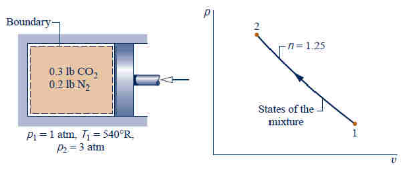 CAPÍTULO 12 – MISTURA DE GASES IDEAIS E APLICAÇÕES À PSICROMETRIA EXEMPLO 12.1 – RESOLVIDO PG. 563) A análise molar de produtos gasosos de combustão de determinado combustível é CO2, 0,08; H2O, 0,11; O2, 0,07; N2; 0,74. a) Determina a massa molecular aparente da mistura. b) Determine a composição em termos de frações mássicas (análise gravimétrica). EXEMPLO 12.2 – RESOLVIDO PG. 564) Uma mistura de gases tem a seguinte composição de frações mássicas: H2; 0,10, N2; 0,60; CO2, 0,30. Determine: a) a composição química em termos de frações molares e b) a massa molecular aparente da mistura. EXEMPLO 12.3 – RESOLVIDO PG. 570) Uma mistura de 0,14 kg de dióxido de carbono e 0,16 kg de nitrogênio é comprimida de 11 =p atm, 3001 =T K para 32 =p atm em um processo politrópico no qual .25,1=n Determine: a) a temperatura final, em K, b) o trabalho, em kJ, c) a transferência de calor, em kJ, e d) a variação de entropia da mistura, em kJ/K. EXEMPLO 12.4 – RESOLVIDO PG. 572) Uma mistura de gases que consiste em CO2 e O2 com frações molares, respectivamente, de 0,8 e 0,2 expande-se isoentropicamente e em regime permanente através de um bocal de 700 K, 5 atm, 3 m/s para uma saída de pressão a 1 atm. Determine: a) a temperatura na saída do bocal, em K, b) a variações da entropia da mistura de CO2 e O2 entre a entrada e a saída, em kJ/kmol.K, e c) a velocidade de saída da mistura de gases, em m/s. EXEMPLO 12.34 – PROPOSTO PG. 610) Um tanque rígido e isolado possui dois compartimentos. Inicialmente, um deles contém 0,5 kmol de dióxido de carbono (CO2) a 27 oC, 2 bar e o outro contém 1 kmol de oxigênio (O2) a 147 oC, 5 bar. É permitida a mistura entre os gases enquanto 500 kJ de energia são adicionados por trabalho elétrico. Determine: a) a temperatura final, em K, b) a pressão final, em bar e c) a variação de entropia, em kJ/K. EXEMPLO 12.6 – RESOLVIDO PG. 576) Em regime permanente, 100 m3/min de ar seco a 32 oC e 1 bar (105 Pa) são misturados adiabaticamente com um fluxo de oxigênio (O2) a 127 oC e 1 bar (105 Pa) para produzir um fluxo misturado a 47 oC e 1 bar (105 Pa). Os efeitos das energias cinética e potencial podem ser desprezados. Determine: a) as vazões mássicas de ar seco e do oxigênio, em kg/s, b) as frações molares do ar seco e do oxigênio na mistura de saída, e c) a taxa de geração de entropia, em kW/K. EXEMPLO 12.38 – PROPOSTO PG. 610) Ar a 77oC, 1 bar e uma vazão molar de 0,1 kmol/s entra em uma câmara de mistura isolada operando em regime permanente e mistura-se com vapor d’água entrando a 277 oC, 1 bar e com uma vazão molar de 0,3 kmol/s. A mistura sai da câmara de mistura a 1 bar. Variações de energia cinética e potencial podem ser desprezadas. Determine: a) a temperatura de saída da mistura, em K e b) a taxa de geração de entropia, em kW/K. EXEMPLO 12.7 – RESOLVIDO PG. 582) Uma amostra de ar úmido (0,454 kg), inicialmente a 21,1 oC, 101,4 kPa e 70% de umidade relativa, é resfriada a 4,44 oC enquanto se mantém a pressão constante. Determine: a) a razão de mistura inicial, b) a temperatura do ponto de orvalho, em oC, e c) a quantidade de vapor d’água que se condensa, em kg. EXEMPLO 12.8 e 12.9 – RESOLVIDOS PG. 584 E PG. 585) Uma mistura de ar-vapor d’água está contida em um reservatório de pressão fechado e rígido, com um volume de 35 m3 a 1,5 bar, 120 oC e %.10=φ A mistura é resfriada a volume constante até que sua temperatura seja reduzida para 22 oC. Determine: a) A temperatura do ponto de orvalho correspondente ao estado inicial, oC, b) a temperatura na qual a condensação realmente começa, oC, e c) a quantidade de vapor d’água condensada, em kg, e d) a transferência de calor durante o processo, em kJ.