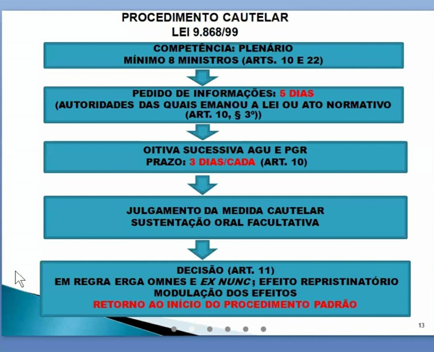 Depois disso vai para o procedimento padrão, com todos aqueles instrumentos que já vimos. O que reforma a tese que as decisões monocráticas em controle de constitucionalidade são uma distorção. O outro procedimento é o sumário. Onde o Ministro não vislumbra a possibilidade de uma cautelar e ai o ministro relator atribui, no despacho de recebimento da inicial, ele já da essa saneada no processo. Indicando qual dos ter ritos serão adotados. O relator na forma do art. 12 ele pode atribuir esse procedimento sumário, ai ao invés de ir pro procedimento cautelar e depois para o padrão, sendo a matéria muito relevante e especial significado, ele triniu esse procedimento sumário. Onde o pedido de informações se dá em 10 dias. A oitiva da AGU e da PGR se dá em 5 dias para cada. Assim ocorre o julgamento. Quando o ministro leva para o procedimento sumário, ele considera que não é necessário o que dispõe o art. 9, e já vai para o julgamento definitivo. A direção que o processo vai tomar depende do Ministro relator, porque ele no despacho saneador que dá o norte. OBS. O ministro plantonista pode analisar a medida cautelar no recesso. Mas muita atenção, essas decisões liminares monocráticas diminui a legitimidade da corte. Então apenas em caso de plantão, o Ministro plantonista pode analisar essa medida. OBS.1. Em qualquer decisão, cautelar ou definitiva, ADIN, ADPF, ADC, é exigida a presença mínima de 8 ministro (art. 22). OBS.2. Não cabe desistência ou intervenção de terceiros (art. 5º e 7º) – Mas o amicus curie não é exatamente um terceiro clássico, mas tem feição de intervenção de terceiro DECISÕES DO CONTROLE – especificamente da ADIN O Quórum é aquele já elencado acima, de 8 ministros, e a constitucionalidade só será declarada com o voto de 6 ministros, que é a maioria absoluta. Lembrando que segundo o parágrafo único do art. 23, ocorre a suspensão da sessão, quando “Se não for alcançada a maioria necessária à declaração de constitucionalidade ou de inconstitucionalidade, estando ausentes Ministros em número que possa influir no julgamento, este será suspenso a fim de aguardar-se o comparecimento dos Ministros ausentes, até que se atinja o número necessário para prolação da decisão num ou noutro sentido.” A declaração de constitucionalidade e de inconstitucionalidade, possuem natureza dúplice, o próprio julgamento do supremo quando julga a procedência de uma ADI, significa que o objeto é inconstitucional, neste caso, a as demandas constitucionais são fungíveis (ADI, ADC, ADO, APDF), mas a ADI e a ADC são irmãs gêmeas. E a decisão do supremo é uma decisão irrecorrível, ressalvados os embargos de declaração. EFEITOS DA DECISÃO FINAL DO SUPREMO NUMA ADIN e ADC (se aplicando a qualquer ação) Eficácia erga omnes e efeito vinculante. Então todos os órgãos do judiciário e executivo estão vinculados – lembrando que não vincula o poder legislativo, porque ele pode aprovar aquela norma novamente, com mais ou menos a mesma matéria, corrigindo o que o supremo tenha apontado na sua decisão. E outro detalhe é o (art. 52, X) a respeito da mutação constitucional da competência do senado – esse exemplo cabe aqui porque a constituição é uma norma viva, porque aqui, a depender da quadra histórica, uma norma constitucional depois pode não ser mais, ou vice versa. Então não tem como a decisão do supremo vincular o legislador. Outro ponto importante é o alcance da vinculação, a decisão apesar de ter efeito vinculante, frisa-se que esse efeito é apenas do dispositivo, o Supremo não aplica a teoria dos motivos determinantes (com bastante criticado pela doutrina) – essa teoria diz que os fundamentos jurídicos usados pela suprema corte no controle concentrado também vincula o judiciário e o executivo, então as razões utilizadas também vinculam. Ressalva-se que tem um precedente do Ministro Gilmar que ele utiliza a teoria dos motivos determinantes. (Transcendência: Rcl 11.473 AgR, rel. min. Roberto Barroso, j. 17-3-2017, 1ª T, DJE de 29-3-2017 X Rlc 4.335, voto de rel. min. Gilmar Mendes, j. 20-3-2014, P, DJE de 22-10-2014 (lei municipal). Esse julgado é isolado, porque não se admite a teoria dos motivos determinantes. A natureza declaração de inconstitucionalidade em regra tem efeito ex tunc, ela só declara a inconstitucionalidade, porque a lei já nasceu inconstitucional desde sua origem (ab initio), esse efeito só será afastado na hipótese do art. 27 da Lei 9869/99, que