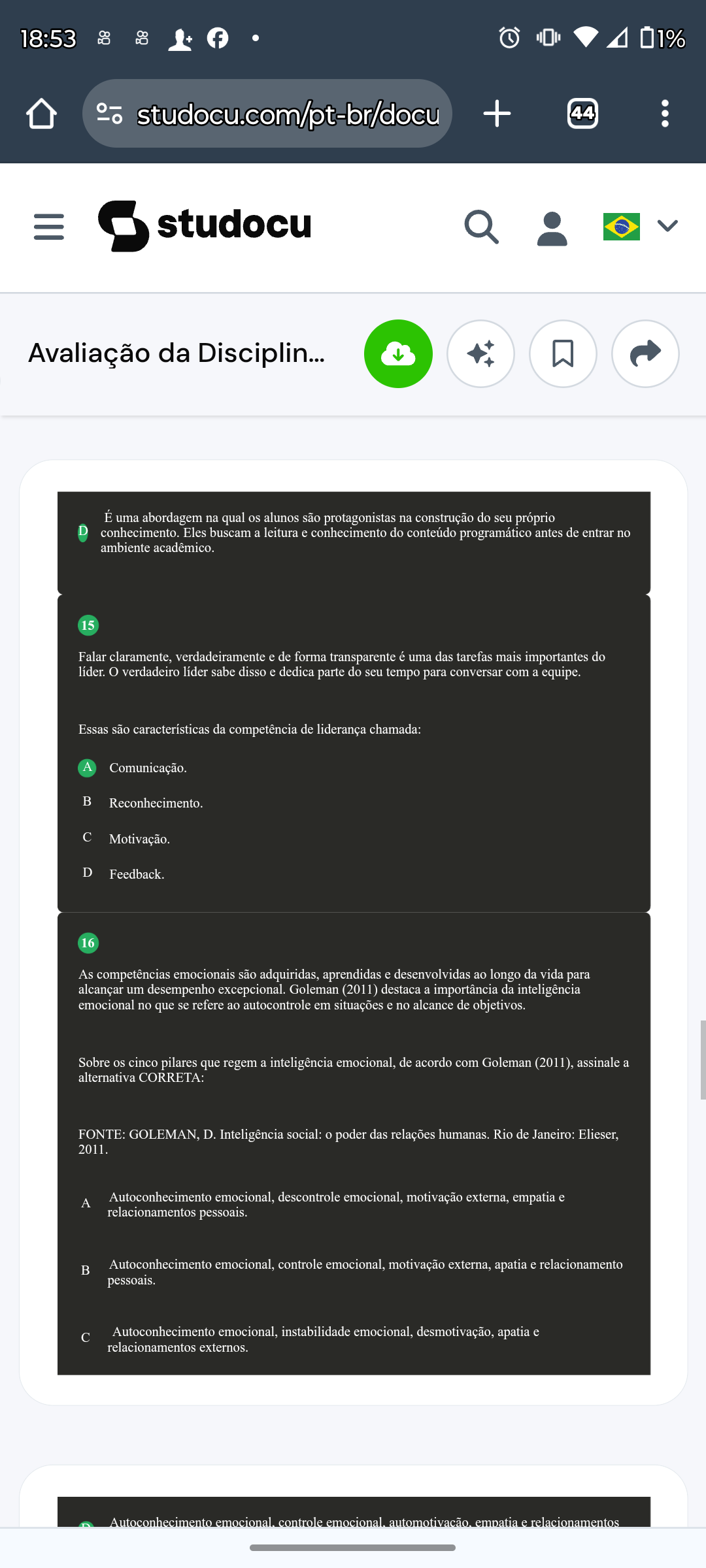 18:53 1% + 44 studocu Avaliação da Disciplin... É uma abordagem na qual os alunos são protagonistas na construção do seu próprio conhecimento. Eles buscam a leitura e conhecimento do conteúdo programático antes de entrar no ambiente acadêmico. 15 Falar claramente, verdadeiramente e de forma transparente é uma das tarefas mais importantes do líder. O verdadeiro líder sabe disso e dedica parte do seu tempo para conversar com a equipe. Essas são características da competência de liderança chamada: A Comunicação. B C Motivação. D 16 As competências emocionais são adquiridas, aprendidas e desenvolvidas ao longo da vida para alcançar um desempenho excepcional. Goleman (2011) destaca a importância da inteligência emocional no que se refere ao autocontrole em situações e no alcance de objetivos. Sobre os cinco pilares que regem a inteligência emocional, de acordo com Goleman (2011), assinale a alternativa CORRETA: FONTE: GOLEMAN, D. Inteligência social: poder das relações humanas. Rio de Janeiro: Elieser, 2011. A Autoconhecimento emocional, descontrole emocional, motivação externa, empatia e relacionamentos pessoais. B Autoconhecimento emocional, controle emocional, motivação apatia e relacionamento pessoais. C Autoconhecimento emocional, instabilidade emocional, desmotivação, apatia e relacionamentos externos. Autoconhecimento emocional. controle emocional automotivação. empatia e relacionamentos