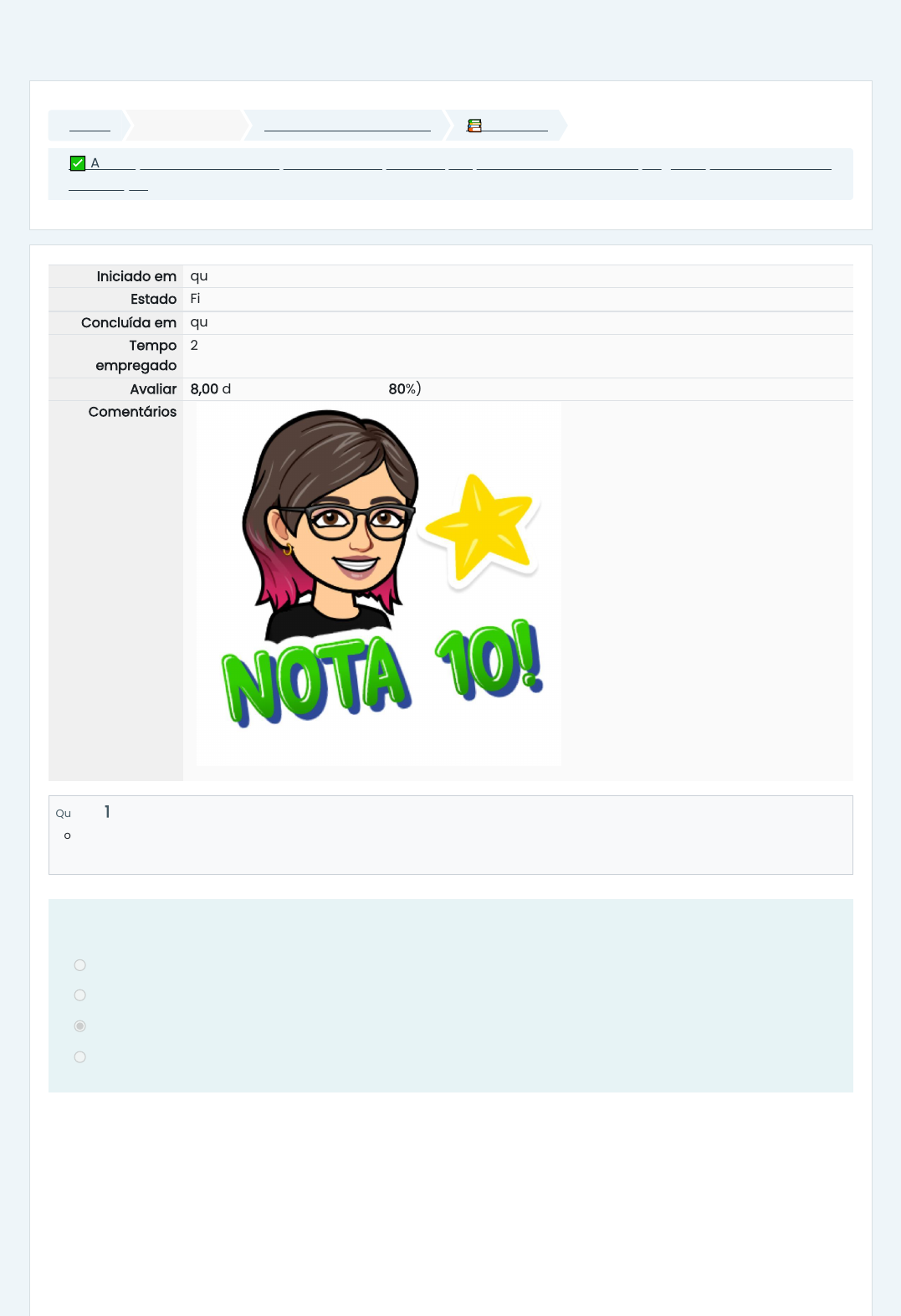 Painel Meus cursos 32010002064-T01-2024-1 📚 Módulo 2 ✅ Avaliação do Módulo 2 - Arquitetura e componentes, arquitetura cliente-servidor, segurança em sistemas de informação Iniciado em quinta, 4 jul 2024, 14:26 Estado Finalizada Concluída em quinta, 4 jul 2024, 14:28 Tempo empregado 2 minutos 34 segundos Avaliar 8,00 de um máximo de 10,00(80%) Comentários Questão 1 Correto Atingiu 1,00 de 1,00 O que caracteriza o princípio de "Abstração" na arquitetura de software? a. Minimizar a reusabilidade. b. Ignorar detalhes de implementação. c. Representar conceitos complexos de maneira simplificada. d. Tornar todos os componentes do sistema intercambiáveis. https://ava.ufms.br/my/ https://ava.ufms.br/course/view.php?id=53728 https://ava.ufms.br/course/view.php?id=53728#section-3 https://ava.ufms.br/mod/quiz/view.php?id=761767 Questão 2 Incorreto Atingiu 0,00 de 1,00 Questão 3 Correto Atingiu 1,00 de 1,00 Questão 4 Correto Atingiu 1,00 de 1,00 Questão 5 Incorreto Atingiu 0,00 de 1,00 Em que consiste o nível de abstração de arquitetura chamado "Nível do Design"? a. Produção do modelo de análise para hardware, software e pessoas. b. Divisão do sistema em módulos independentes. c. Produção do modelo de design para configurações específicas. d. Representação simplificada de conceitos complexos. Indique se a afirmação é Verdadeira ou Falsa: A arquitetura de sistemas de informação organiza processos, dados, tecnologias e interfaces para atender aos objetivos organizacionais. Escolha uma opção: Verdadeiro Falso A arquitetura de sistemas de informação considera a organização dos dados como parte integrante da sua definição . O nível de design de arquitetura chamado "Nível da abstração " foca na produção do modelo de análise para configurações mais abrangentes que permita a discussão com stakeholders. Questão 6 Correto Atingiu 1,00 de 1,00 Questão 7 Correto Atingiu 1,00 de 1,00 Questão 8 Correto Atingiu 1,00 de 1,00 Questão 9 Correto Atingiu 1,00 de 1,00 Em termos de arquitetura de software, o que é "Encapsulamento"? a. Expor todas as implementações internas para facilitar a manutenção. b. Agrupar todos os componentes em um único módulo. c. Proteger a implementação interna dos módulos, expondo apenas interfaces necessárias. d. Centralizar todas as decisões de design em um único ponto. O que é um componente arquitetural no contexto de arquitetura de software? a. Um arquivo de configuração do sistema. b. Um pedaço qualquer de código. c. Uma parte identificável, modular e intercambiável de um sistema maior. d. Uma linguagem de programação específica. Alta coesão dentro dos módulos significa que as funcionalidades relacionadas não estão distribuídas entre diferentes módulos. Indique se a afirmação é Verdadeira ou Falsa: A separação de preocupações (Separation of Concerns) visa dividir o sistema em partes que se concentram em preocupações específicas. Escolha uma opção: Verdadeiro Falso Questão 10 Correto Atingiu 1,00 de 1,00 Indique se a afirmação é Verdadeira ou Falsa: O modelo cliente-servidor promove a clara separação entre as responsabilidades do cliente e do servidor, distribuindo tarefas de forma equitativa. Escolha uma opção: Verdadeiro Falso Atividade anterior ◄ 📍 Checkout de Presença do Módulo 2 - Arquitetura e componentes, arquitetura cliente-servidor, segurança em sistemas de informação Seguir para... Próxima atividade ▶ Videoaula Obrigatória - Módulo 3 - Unidade 1 - Modelos de dados e de informação e armazenagem e processamento em nuvem ► Manter contato Suporte Técnico ao Usuário https://suporteagetic.ufms.br (67) 3345-7613 suporte.agead@ufms.br https://ava.ufms.br/mod/assign/view.php?id=761765&forceview=1 https://ava.ufms.br/mod/url/view.php?id=761769&forceview=1 https://suporteagetic.ufms.br/ tel:(67) 3345-7613 mailto:suporte.agead@ufms.br https://api.whatsapp.com/send?phone=556733457613