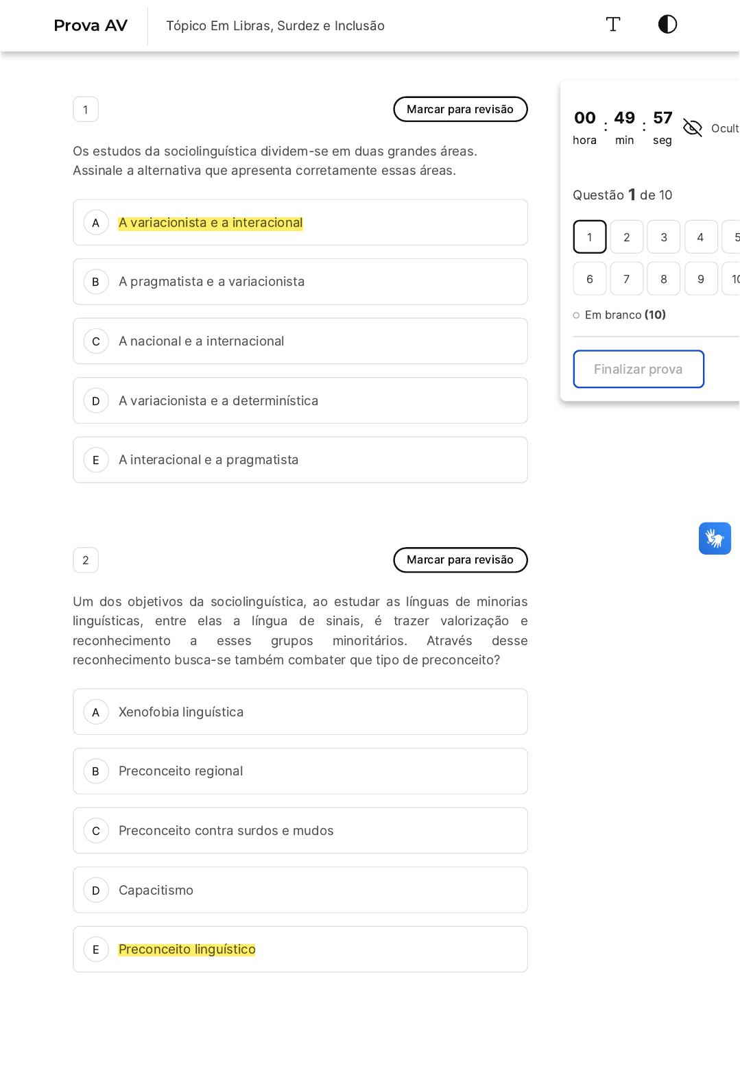 A B C D E A B C D E 1 Marcar para revisão Os estudos da sociolinguística dividem-se em duas grandes áreas. Assinale a alternativa que apresenta corretamente essas áreas. A variacionista e a interacional A pragmatista e a variacionista A nacional e a internacional A variacionista e a determinística A interacional e a pragmatista 2 Marcar para revisão Um dos objetivos da sociolinguística, ao estudar as línguas de minorias linguísticas, entre elas a língua de sinais, é trazer valorização e reconhecimento a esses grupos minoritários. Através desse reconhecimento busca-se também combater que tipo de preconceito? Xenofobia linguística Preconceito regional Preconceito contra surdos e mudos Capacitismo Preconceito linguístico 00 hora : 49 min : 57 seg Ocult Questão 1 de 10 Em branco �10� Finalizar prova 1 2 3 4 5 6 7 8 9 10 Prova AV Tópico Em Libras, Surdez e Inclusão A B C D E A B C 3 Marcar para revisão Apesar da língua oral dominante no Brasil ser o português devido as razões históricas, coloniais e imigratórias, a língua de sinais de Portugal �LGP � Língua Gestual Portuguesa) não exerceu tanta influência na Libras. Qual língua de sinais mais influenciou a estruturação da Libras? Língua de sinais britânica �BSL� Língua de sinais do Brasil �LSB� Língua de sinais americana �ASL� Lingua de sinais espanhola �LSE� Língua de sinais francesa �LSF� 4 Marcar para revisão Como já estudamos, as línguas de sinais são complexas, arbitrárias e recombinativas, no entanto, também apresentam iconicidade. Iconicidade nas línguas se refere a semelhança entre o signo e significado. Sobre iconicidade das línguas de sinais é INCORRETO afirmar que: Iconicidade nas línguas de sinais é um processo sofisticado em que os recursos fonéticos dos sinais permitidos pela língua são construídos em analogia com a imagem associada ao referente. Se fossem apenas icônicas, as línguas sinalizadas não teriam o mesmo status das línguas faladas. Estes estudos revelam que a maioria absoluta dos sinais é, de fato, muito icônica, apesar de ser vista, quase sempre, como bastante opaca. D E A B C D E A B C Se as línguas de sinais fossem constituídas apenas de elementos icônicos, o significado deveria ser imediatamente compreendido por observadores ingênuos. A iconicidade só existe por meio de esforços mentais dos seres humanos; e depende das nossas associações conceituais naturais e culturais. 5 Marcar para revisão Qual a alternativa correta sobre a estrutura de sentença da Libras? Não é possível usar os verbos flexionados e os substantivos. Por ser uma língua "pro-drop", não é necessário usar pronomes pessoais. É semelhante à estrutura de Língua Portuguesa. O modalizar do discursão não interfere na estrutura frasal. Não se usam os conectivos, preposições, conjunções e artigos. 6 Marcar para revisão Abaixo está representada uma sequência de figuras (da esquerda para direita), que seguem um determinado padrão. A próxima figura dessa sequência corresponde ao seguinte número em Libras: 0. 1. 5. D E A B C D E 6. 9. 7 Marcar para revisão A Declaração Universal dos Direitos Linguísticos se caracteriza por conter diretrizes importantes para o bem-estar do indivíduo e da coletividade. Assinale a única resposta certa. A Declaração Universal dos Direitos Linguísticos é um tratado, acordo internacional, com diretrizes opcionais a serem adotadas a favor das comunidades linguísticas A Declaração Universal dos Direitos Linguísticos é uma normativa elaborada pelo Ministério da Educação � MEC , cujo objetivo é a ampliação do uso da Libras. A Declaração Universal dos Direitos Linguísticos é uma portaria que delineia ações e programas de incentivo a aquisição e aprendizagem da Libras. A Declaração Universal dos Direitos Linguísticos é a lei de garantias dos direitos sociais e linguísticos dos surdos. A Declaração Universal dos Direitos Linguísticos é um documento jurídico no ambiento brasileiro, que favoreceu a comunidade surda. 8 Marcar para revisão A afirma de que todas as comunidades linguísticas são iguais em direito visto no artigo 10 da Declaração Universal dos Direitos Linguísticos incide na: A B C D E A B C D E No direito da não discriminação por critérios da soberania política, na situação social e econômica e por outros avanços linguísticos e tecnológicos alcançados pela língua. Na direito de ter um intérprete de Libras, o qual exerce a interpretação exclusivamente para os surdos, por um processo monolinguísticos. Na política de apagamento das línguas de minorias, visto não serem línguas oficiais Cada comunidade linguística é dependente das políticas linguísticas para existir, sem um documento legal elas são inexistentes. No amadurecimento da política de estatuto linguístico para as diferentes línguas, classificando como hegemônicas e subalternas. 9 Marcar para revisão Apesar da tradição e erudição associada à língua escrita, tal modalidade em nada é superior à falada, assim como a modalidade oral não pode ser tida como superior à sinalizada. Sobre esta frase, é correto afirmar que: como não existem culturas melhores que outras, não existem dialetos ou línguas melhores, ou mesmo, modalidades superiores. o relativismo cultural mostra como línguas e culturas possuem diferenças qualitativas que definem caráter de superioridade. a ideia de que há línguas melhores que outras, culturas superiores e povos mais avançados é cientificamente comprovada os pensamentos puristas e conservadores defendem o fato da diversidade linguística. como existem povos mais desenvolvidos tecnologicamente, suas línguas também serão mais desenvolvidas. A B C D E 10 Marcar para revisão As inovações tecnológicas e as redes sociais impulsionam a propagação do conhecimento produzido e das línguas de sinais em si.Os termos utilizados na produções a