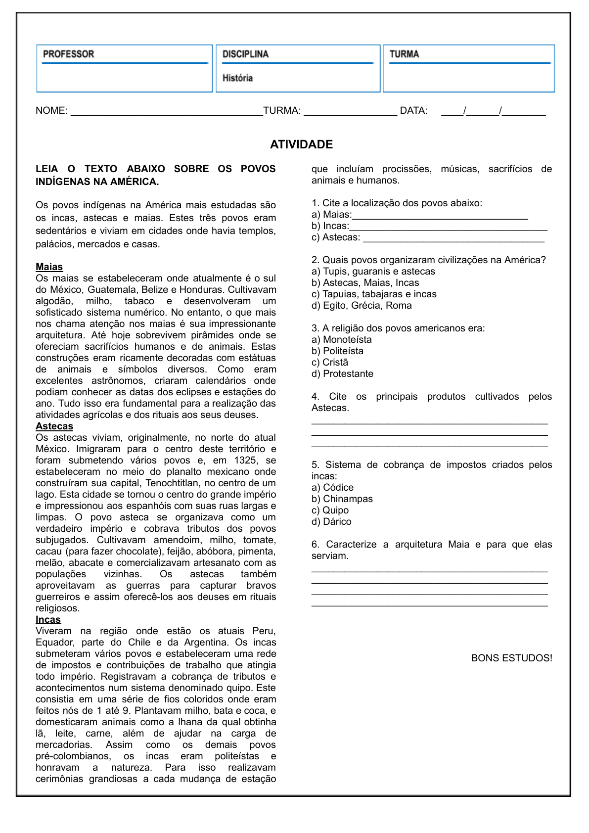 NOME: ___________________________________TURMA: _________________ DATA: ____/______/________ ATIVIDADE LEIA O TEXTO ABAIXO SOBRE OS POVOS INDÍGENAS NA AMÉRICA. Os povos indígenas na América mais estudadas são os incas, astecas e maias. Estes três povos eram sedentários e viviam em cidades onde havia templos, palácios, mercados e casas. Maias Os maias se estabeleceram onde atualmente é o sul do México, Guatemala, Belize e Honduras. Cultivavam algodão, milho, tabaco e desenvolveram um sofisticado sistema numérico. No entanto, o que mais nos chama atenção nos maias é sua impressionante arquitetura. Até hoje sobrevivem pirâmides onde se ofereciam sacrifícios humanos e de animais. Estas construções eram ricamente decoradas com estátuas de animais e símbolos diversos. Como eram excelentes astrônomos, criaram calendários onde podiam conhecer as datas dos eclipses e estações do ano. Tudo isso era fundamental para a realização das atividades agrícolas e dos rituais aos seus deuses. Astecas Os astecas viviam, originalmente, no norte do atual México. Imigraram para o centro deste território e foram submetendo vários povos e, em 1325, se estabeleceram no meio do planalto mexicano onde construíram sua capital, Tenochtitlan, no centro de um lago. Esta cidade se tornou o centro do grande império e impressionou aos espanhóis com suas ruas largas e limpas. O povo asteca se organizava como um verdadeiro império e cobrava tributos dos povos subjugados. Cultivavam amendoim, milho, tomate, cacau (para fazer chocolate), feijão, abóbora, pimenta, melão, abacate e comercializavam artesanato com as populações vizinhas. Os astecas também aproveitavam as guerras para capturar bravos guerreiros e assim oferecê-los aos deuses em rituais religiosos. Incas Viveram na região onde estão os atuais Peru, Equador, parte do Chile e da Argentina. Os incas submeteram vários povos e estabeleceram uma rede de impostos e contribuições de trabalho que atingia todo império. Registravam a cobrança de tributos e acontecimentos num sistema denominado quipo. Este consistia em uma série de fios coloridos onde eram feitos nós de 1 até 9. Plantavam milho, bata e coca, e domesticaram animais como a lhana da qual obtinha lã, leite, carne, além de ajudar na carga de mercadorias. Assim como os demais povos pré-colombianos, os incas eram politeístas e honravam a natureza. Para isso realizavam cerimônias grandiosas a cada mudança de estação que incluíam procissões, músicas, sacrifícios de animais e humanos. 1. Cite a localização dos povos abaixo: a) Maias:________________________________ b) Incas:____________________________________ c) Astecas: _________________________________ 2. Quais povos organizaram civilizações na América? a) Tupis, guaranis e astecas b) Astecas, Maias, Incas c) Tapuias, tabajaras e incas d) Egito, Grécia, Roma 3. A religião dos povos americanos era: a) Monoteísta b) Politeísta c) Cristã d) Protestante 4. Cite os principais produtos cultivados pelos Astecas. ___________________________________________ ___________________________________________ ___________________________________________ 5. Sistema de cobrança de impostos criados pelos incas: a) Códice b) Chinampas c) Quipo d) Dárico 6. Caracterize a arquitetura Maia e para que elas serviam. ___________________________________________ ___________________________________________ ___________________________________________ ___________________________________________ BONS ESTUDOS! GABARITO 1. A) Sul do México, Guatemala, Belize e Honduras. B) Atuais Peru, Equador, parte do Chile e da Argentina. C) Atual México. 2. B 3. B 4. Cultivavam amendoim, milho, tomate, cacau (para fazer chocolate), feijão, abóbora, pimenta, melão e abacate. 5. C 6. A arquitetura Maia era impressionante. Eles construíram diversas pirâmides onde se ofereciam sacrifícios humanos e de animais. Estas construções eram ricamente decoradas com estátuas de animais e símbolos diversos.