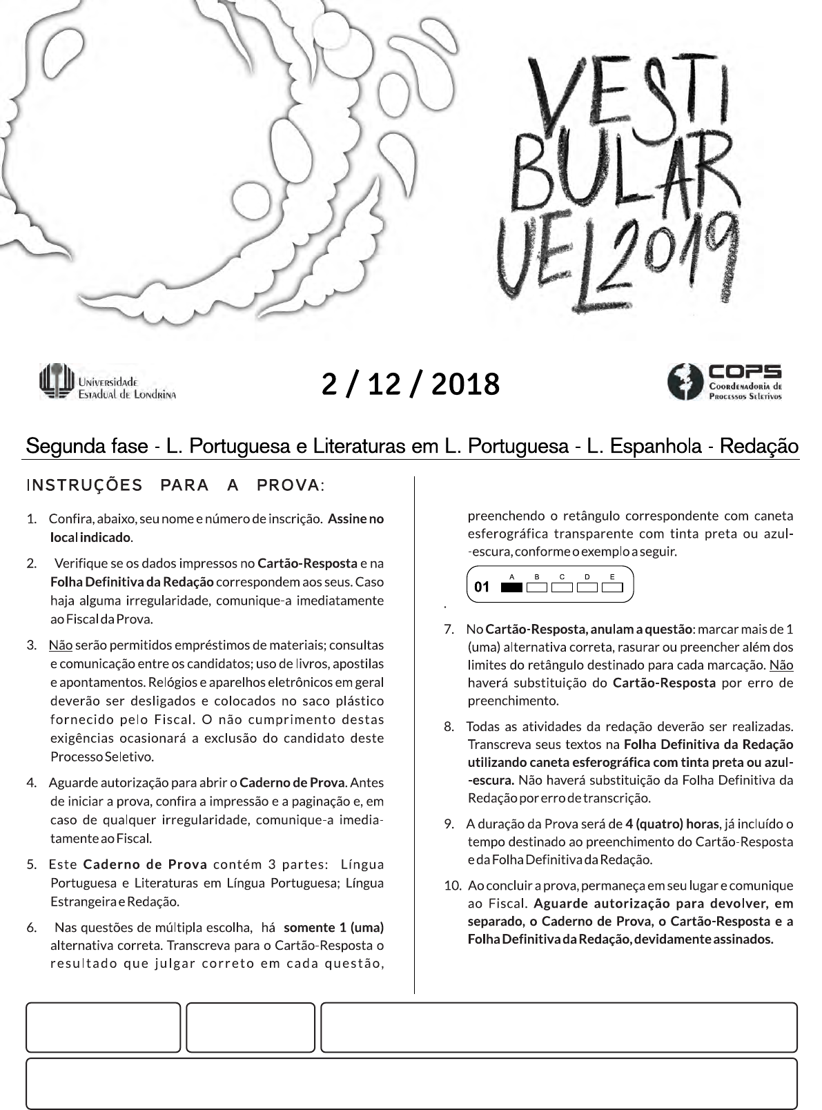 O gabarito oficial provisório estará disponível no endereço eletrônico www.cops.uel.br a partir das 20 horas do dia 2 de dezembro de 2018. LÍNGUA PORTUGUESA E LITERATURAS EM LÍNGUA PORTUGUESA Leia o poema a seguir e responda às questões 1 e 2. Descreve a vida escolástica Mancebo sem dinheiro, bom barrete, Medíocre o vestido, bom sapato, Meias velhas, calção de esfola-gato, Cabelo penteado, bom topete. Presumir de dançar, cantar falsete, Jogo de fidalguia, bom barato, Tirar falsídia ao moço do seu trato, Furtar a carne à ama, que promete; A putinha aldeã achada em feira, Eterno murmurar de alheias famas, Soneto infame, sátira elegante; Cartinhas de trocado para a freira, Comer boi, ser Quixote com as damas, Pouco estudo: isto é ser estudante. WISNIK, J. M. (Org.). Poemas escolhidos de Gregório de Matos. São Paulo: Companhia das Letras, 2010. p. 173. 1 Sobre o poema, considere as afirmativas a seguir. I. O poema estabelece uma diferenciação entre o estudante rico, que tudo tem, e o estudante pobre, que é obrigado a “furtar carne à ama”. II. O poema tem início com uma distinção entre o bom e o mau estudante: “Mancebo sem dinheiro, bom barrete, /Medíocre o vestido, bom sapato [...]”. III. O poema é construído a partir de pequenos quadros que denotam as várias práticas do estudante, sendo que quase nenhuma delas está associada ao estudo. IV. A repetição de formas verbais no infinitivo indica uma permanência das características negativas elencadas a respeito do estudante. Assinale a alternativa correta. a) Somente as afirmativas I e II são corretas. b) Somente as afirmativas I e IV são corretas. c) Somente as afirmativas III e IV são corretas. d) Somente as afirmativas I, II e III são corretas. e) Somente as afirmativas II, III e IV são corretas. 2 Acerca do poema, assinale a alternativa correta. a) Os versos são decassílabos nas duas primeiras estrofes; nas duas últimas, são livres, para ilustrar a inconstância no Barroco. b) O esquema rímico ABBA é utilizado nas duas primeiras estrofes; os tercetos são desprovidos de rimas. c) A modalidade satírica a que pertence o soneto é acompanhada de métrica irregular em sintonia com os desregra- mentos focalizados. d) O sujeito lírico adere à expressão de sentimentos conflituosos manifestos pela figura do estudante. e) O destaque atribuído às mulheres representa o papel significativo das questões amorosas no cotidiano retratado do estudante. 1 / 15 Leia o fragmento, a seguir, retirado do livro Clara dos Anjos, de Lima Barreto, e responda às questões de 3 a 10. Cassi Jones, sem mais percalços, se viu lançado em pleno Campo de Sant’Ana, no meio da multidão que jorrava das portas da Catedral, cheia da honesta pressa de quem vai trabalhar. A sua sensação era que estava numa cidade estranha. No subúrbio tinha os seus ódios e os seus amores; no subúrbio, tinha os seus companheiros, e a sua fama de violeiro percorria todo ele, e, em qualquer parte, era apontado; no subúrbio, enfim, ele tinha personalidade, era bem Cassi Jones de Azevedo; mas, ali, sobretudo do Campo de Sant’Ana para baixo, o que era ele? Não era nada. Onde acabavam os trilhos da Central, acabava a sua fama e o seu valimento; a sua fanfarronice evaporava-se, e representava-se a si mesmo como esmagado por aqueles “caras” todos, que nem o olhavam. [...] Na “cidade”, como se diz, ele percebia toda a sua inferioridade de inteligência, de educação; a sua rusticidade, diante daqueles rapazes a conversar sobre cousas de que ele não entendia e a trocar pilhérias; em face da sofreguidão com que liam os placards dos jornais, tratando de assuntos cuja importância ele não avaliava, Cassi vexava-se de não suportar a leitura; comparando o desembaraço com que os fregueses pediam be- bidas variadas e esquisitas, lembrava-se que nem mesmo o nome delas sabia pronunciar; olhando aquelas senhoras e moças que lhe pareciam rainhas e princesas, tal e qual o bárbaro que viu, no Senado de Roma, só reis, sentia-se humilde; enfim, todo aquele conjunto de coisas finas, de atitudes apuradas, de hábitos de polidez e urbanidade, de franqueza no gastar, reduziam-lhe a personalidade de medíocre suburbano, de va- gabundo doméstico, a quase cousa alguma. BARRETO, Lima. Clara dos Anjos. Rio de Janeiro: Garnier, 1990. p. 130-131. 3 Sobre os recursos linguístico-semânticos empregados no texto, considere as afirmativas a seguir. I. Em “mas, ali, sobretudo do Campo de Sant’Ana para baixo, o que era ele?”, trata-se de pergunta retórica, cuja resposta já se insere na pergunta. II. A repetição do item lexical “subúrbio”, no início do trecho, empobrece a qualidade textual. III. O trecho “tal e qual o bárbaro que viu, no Senado de Roma” contém um paradoxo proporcionado pela incompatibilidade temporal. IV. A palavra “placards” está grifada em itálico no texto por se tratar de estrangeirismo, sendo hoje comum seu correlato em português. Assinale a alternativa correta. a) Somente as afirmativas I e II são corretas. b) Somente as afirmativas I e IV são corretas. c) Somente as afirmativas III e IV são corretas. d) Somente as afirmativas I, II e III são corretas. e) Somente as afirmativas II, III e IV são corretas. 4 Acerca dos recursos linguísticos sublinhados no texto, assinale a alternativa correta. a) Ambos os termos “que” e “sua” fazem referência à personagem Cassi Jones. b) O primeiro termo “ele” refere-se ao subúrbio; o segundo “ele” refere-se a Cassi Jones. c) A palavra “seu” em destaque refere-se ao termo subsequente “valimento”. d) O pronome “o” faz referência ao local Campo de Sant’Ana. e) O termo “lhe” faz referência a “aquelas senhoras e moças”. 5 Em relação aos recursos linguísticos presentes no texto, assinale a alternativa correta. a) Em “ele percebia toda a sua inferioridade de inteligência, de educação; a sua rusticidade”, o pont