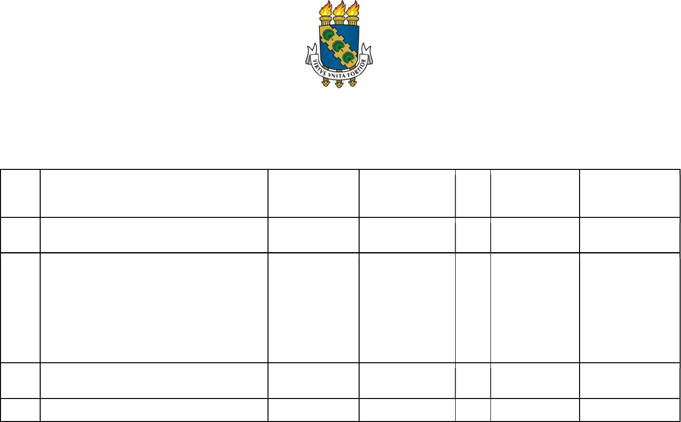 UNIVERSIDADE FEDERAL DO CEARÁ LICENCIATURA INTERCULTURAL INDÍGENA PITAKAJÁ PROCESSO DE SELETIVO SIMPLIFICADO EDITAL Nº17/2024 Nº DA INSC. NOME DOCUMENTO ETNIA PCD STATUS DA INSCRIÇÃO MOTIVO DO INDEFERIMENTO 001 GLAUCIANA ALVES 020.819.513-04 JENIPAPO KANINDÉ NÃO DEFERIDO 002 ROBERIO NEL BRAGA 659.931.103-25 “BRANCO” SIM INDEFERIDO Etnia não contemplada no edital. Falta Autodeclaração e Declaração de Pertencimento Étnico. (anexo III e IV) 003 KARLA NAIARA ALVES 060.310.043-05 JENIPAPO KANINDÉ NÃO DEFERIDO 004 FRANCISCA GEICIANE RODRIGUES 049.406.843-42 KARIRI NÃO DEFERIDO VENANCIO FERREIRA 005 ELIVANIA BARBOSA RODRIGUES 109.516.583.60 KARIRI NÃO DEFERIDO 006 SHEILA DA SILVA BRITO 032.837.233-11 TAPEBA NÃO DEFERIDO 007 TERESA CRISTINA DA CRUZ MOTA 044.110.023-61 TAPEBA NÃO DEFERIDO 008 JAIRO JOSE COSTA DOS SANTOS 610.409.783-98 TAPEBA NÃO DEFERIDO 009 KATIEÊ MATOS DE SOUZA 053.277.663-14 TAPEBA NÃO INDEFERIDO Certificado de alistamento militar fora do prazo de validade 010 KATIENE MATOS DE SOUZA 053.278.133-39 TAPEBA NÃO DEFERIDO 011 RANIELE NEPOMUCENO ALVES 092.131.373-03 JENIPAPO KANINDÉ NÃO DEFERIDO 012 AMANDA DO NASCIMENTO FERREIRA 069.837.573-43 TAPEBA NÃO DEFERIDO 013 JULIANA RIPARDO DE FREITAS 010.172.773-97 TAPEBA NÃO DEFERIDO 014 THAINÁ TEIXEIRA DE MATOS 073.494.343-16 TAPEBA NÃO DEFERIDO 015 NATALIA COSTA DA SILVA 071.525.063-96 JENIPAPO KANINDÉ NÃO DEFERIDO 016 JULIANE CASTRO DO NASCIMENTO 061.893.583-57 TREMEMBÉ NÃO DEFERIDO 017 ELIZABETE CARNEIRO DA SILVA 084.524.253-92 TREMEMBÉ NÃO DEFERIDO 018 JOSIANE DA SILVA MORAIS 044.053.913-78 TAPEBA NÃO DEFERIDO 019 ADELISSANDRA MATOS GUIMARÃES 076.795.463-71 TAPEBA NÃO DEFERIDO 020 RITA DE CASSIA SILVA DO NASCIMENTO 073.678.983-96 TAPEBA NÃO DEFERIDO 021 WANKS CAVALCANTE DA SILVA 025.161.133-74 POTYGUARA NÃO DEFERIDO 022 FRANCISCO LUAN CARLOS RODRIGUES 072.572.473-07 POTYGUARA NÃO DEFERIDO 023 PATRÍCIA DIAS DA COSTA 052.213.653-24 JENIPAPO KANINDÉ NÃO DEFERIDO 024 MARIA EDUARDA DOS SANTOS DA SILVA 085.035.853-16 TAPEBA INDEFERIDO Falta Ficha de Inscrição Preenchida e Histórico do Ensino Médio não consta notas do 3º ano 025 ANA MARCELA DA SILVA DE ARAUJO 123.078.843-35 NÃO DECLARADA INDEFERIDO Falta ficha de inscrição preenchida, verso do certificado de conclusão, autodeclaração, declaração de pertencimento étnico, quitação eleitoral 026 LUANA SAVYA DA ROCHA DE MENEZES 079.872.553-27 ANACÉ NÃO DEFERIDO 027 PEDRO HENRIQUE VENANCIO DIAS 073.209.253.11 KARIRI NÃO INDEFERIDO Falta verso do Certificado de Ensino Médio, Certificado falta assinatura do candidato 028 FRANCISCA DIANA ARAUJO DE SOUZA 073.093.853-06 TABAJARA NÃO DEFERIDO 029 LUAN ARAUJO DE SOUZA 616.482.243-26 TABAJARA NÃO INDEFERIDO Certificado de alistamento militar fora do prazo de validade e Não está quite com a justiça eleitoral 030 GLAUCINETE BERNARDE DA SILVA TUBIBA TAPUIA NÃO INDEFERIDO O Certificado de Ensino apresentado foi de 1º grau e com um sobrenome diferente e o Histórico de Ensino Médio também tem sobrenome diferente.Falta o CPF e o CNPJ da Associação indígena está inválido (situação Inapta) 031 JULIANA BARBOSA DE MELO FARIAS 028.685.533-03 TABAJARA NÃO INDEFERIDO Falta ficha de inscrição preenchida 032 MARIA WANY SOUSA MORAIS 606.009.663-80 TUBIBA TAPUIA NÃO INDEFERIDO CNPJ da Associação indígena está inválido (situação Inapta) 033 ANTONIA JOICIARA RODRIGUES VENANCIO 065.787.733-63 KARIRI NÃO DEFERIDO 034 LEUDIANA DIAS DA COSTA 039.288.093-85 JENIPAPO KANINDÉ NÃO DEFERIDO 035 MARIA LENE GOMES PEREIRA 053.454.543-29 POTYGUARA NÃO INDEFERIDO Certificado falta assinatura do candidato 036 ANITA SOUSA MORAIS 699.255.423-91 TUBIBA TAPUIA NÃO INDEFERIDO CNPJ da Associação indígena está inválido (situação Inapta), Falta verso do Certificado de Ensino Médio e Frente do Histórico Escolar 037 ANTONIA IONILDA MONTEIRO GADELHA 443.003.283-15 ANACÉ NÃO DEFERIDO 038 MICHELE DIAS DO NASCIMENTO 113.670.613-50 POTYGUARA NÃO DEFERIDO 039 MARIA ELISANGELA TEIXEIRA DOS SANTOS 023.387.863-78 TAPEBA NÃO DEFERIDO 040 DIANA MARIA BARBOSA VENANCIO VIEIRA 014.657.003-07 KARIRI NÃO DEFERIDO 041 PAULO RUBENS BARBOSA FRANÇA 166.500.958-69 ANACÉ SIM INDEFERIDO Falta o verso do Certificado de Ensino Médio e a declaração de pertencimento não está de acordo com o modelo anexo IV da inscrição (falta a assinatura com RG e CPF do presidente da Associação e duas lideranças) 042 EMANOELA DO MONTE SILVA 031.679.483-02 ANACÉ NÃO INDEFERIDO Falta Certidão de Quitação Eleitoral, Falta uma assinatura na Declaração de Associação Indígena local 043 ELANE SILVA DE SOUSA 624.753.003-02 KARIRI NÃO INDEFERIDO Falta assinatura do candidato no Certificado do Ensino Médio e Histórico 044 LUCIANO VIEIRA DE SOUSA 788.504.363-00 KARIRI NÃO INDEFERIDO O CANDIDATO assina como presidente da associação (A assinatura tem que ser de outro membro, ex: Vice- presidente) 045 ANTONIA LEILA SOUZA COSTA SANTOS 057.425.163-47 KANINDÉ NÃO DEFERIDO 046 FRANCISCO REGINALDO DA SILVA SANTOS 020.312.743-92 KANINDÉ NÃO DEFERIDO 047 MACIONE FERREIRA DOS SANTOS 083.215.513-60 TREMEMBÉ NÃO DEFERIDO 048 GIZELE RODRIGUES BARRADA 039.072.613-30 POTYGUARA NÃO DEFERIDO 049 ISABELA OLIVEIRA DOS ANJOS PAIVA 610.458.553-16 TAPEBA NÃO DEFERIDO 050 SUELI FERREIRA DE SOUSA 874.462.193-00 POTYGUARA NÃO DEFERIDO 051 THIAGO DE SOUZA BEZERRA 054.337.963-96 TAPEBA NÃO DEFERIDO 052 GUSTAVO MORAES DE SALES 045.252.873-90 ANACÉ NÃO DEFERIDO 053 ALESSANDRA TEIXEIRA DOS SANTOS 084.303.723-77 TAPEBA NÃO INDEFERIDO Falta verso do Certificado do Ensino Médio e Histórico 054 LUIZ ALBERTO SOARES RODRIGUES 603.499.813-10 POTYGUARA NÃO DEFERIDO 055 FRANCISCA DIAS GOMES DE SOUSA 519.327.333-53 POTYGUARA NÃO DEFERIDO 056 BRUNA RACHEL TAVARES DO NASCIMENTO 014.545.653-65 POTYGUARA NÃO DEFERIDO 057 DÉBORA NASCIMENTO RODRIGUES 093.866.933-80 TABAJARA NÃO DEFERIDO 058 FRANCISCO MADOQUEU GOMES BARROZO SOUZA 046.