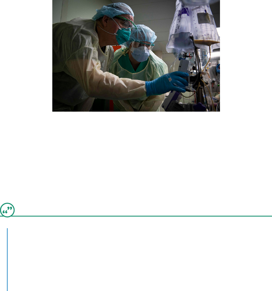 FIGURE 8.3 Doctors, nurses, and corpsmen aboard the Navy hospital ship USNS Comfort provided intensive care for patients in spring 2020 to relieve the New York City medical system, which was overwhelmed by cases of COVID-19. (credit: “U.S. Navy Doctors, Nurses and Corpsmen Treat COVID Patients in the ICU Aboard USNS Comfort” by Navy Medicine from Washington, DC, USA/Wikimedia Commons, Public Domain) Introduction The analytical report that follows was written by a student, Trevor Garcia, for a first-year composition course. Trevor’s assignment was to research and analyze a contemporary issue in terms of its causes or effects. He chose to analyze the causes behind the large numbers of COVID-19 infections and deaths in the United States in 2020. The report is structured as an essay, and its format is informal. Successes and Failures With more than 83 million cases and 1.8 million deaths at the end of 2020, COVID-19 has turned the world upside down. By the end of 2020, the United States led the world in the number of cases, at more than 20 million infections and nearly 350,000 deaths. In comparison, the second-highest number of cases was in India, which at the end of 2020 had less than half the number of COVID-19 cases despite having a population four times greater than the U.S. (“COVID-19 Coronavirus Pandemic,” 2021). How did the United States come to have the world’s worst record in this pandemic? An examination of the U.S. response shows that a reduction of experts in key positions and programs, inaction that led to equipment shortages, and inconsistent policies were three major causes of the spread of the virus and the resulting deaths. Introduction. Informal reports follow essay structure and open with an overview. Statistics as Evidence. The writer gives statistics about infection rates and numbers of deaths; a comparison provides context. Source Citation in APA Style: No Author. A web page without a named author is cited by the title and the year. Thesis Statement. The rhetorical question leads to the thesis statement in the last sentence of the introduction. The thesis statement previews the organization and indicates the purpose—to analyze the causes of the U.S. response to the virus. Reductions in Expert Personnel and Preparedness Programs Headings. This heading and those that follow mark sections of the report. LIVING BY THEIR OWN WORDS s end s annotat end annotat annotat end annotat annotat end annotat annotat end annotat annotat end annotat 242 8 • Analytical Report: Writing from Facts Access for free at openstax.org. Body. The three paragraphs under this heading support the first main point in the thesis statement. Epidemiologists and public health officials in the United States had long known that a global pandemic was possible. Topic Sentence. The paragraph opens with a sentence stating the topic. The rest of this paragraph and the two that follow develop the topic chronologically. In 2016, the National Security Council (NSC) published Playbook for Early Response to High-Consequence Emerging Infectious Disease Threats and Biological Incidents, a 69-page document on responding to diseases spreading within and outside of the United States. On January 13, 2017, the joint transition teams of outgoing president Barack Obama and then president-elect Donald Trump performed a pandemic preparedness exercise based on the playbook; however, it was never adopted by the incoming administration (Goodman & Schulkin, 2020). A year later, in February 2018, the Trump administration began to cut funding for the Prevention and Public Health Fund at the Centers for Disease Control and Prevention, leaving key positions unfilled. Other individuals who were fired or resigned in 2018 were the homeland security adviser, whose portfolio included global pandemics; the director for medical and biodefense preparedness; and the top official in charge of a pandemic response. None of them were replaced, thus leaving the White House with no senior person who had experience in public health (Goodman & Schulkin, 2020). Experts voiced concerns, among them Luciana Borio, director of medical and biodefense preparedness at the NSC, who spoke at a symposium marking the centennial of the 1918 influenza pandemic in May 2018: “The threat of pandemic flu is the number one health security concern,” she said. “Are we ready to respond? I fear the answer is no” (Sun, 2018, final para.). Audience. The writer assumes that his readers have a strong grasp of government and agencies within the government. Synthesis. The paragraph synthesizes factual evidence from two sources and cites them in APA style. Expert Quotation as Supporting Evidence. The expert’s credentials are given, her exact words are placed in quotation marks, and the source is cited in parentheses. Source Citation in APA Style: No Page Numbers. Because the source of the quotation has no page numbers, the specific paragraph within the source (“final para.”; alternatively, “para. 18”) is provided in the parenthetical citation. Cuts continued in 2019, among them a maintenance contract for ventilators in the federal emergency supply and PREDICT, a U.S. agency for international development designed to identify and prevent pandemics (Goodman & Schulkin, 2020). In July 2019, the White House eliminated the position of an American public health official in Beijing, China, who was working with China’s disease control agency to help detect and contain infectious diseases. The first case of COVID-19 emerged in China four months later, on November 17, 2019. Development of First Main Point. This paragraph continues the chronological development of the first point, using a transitional sentence and evidence to discuss the year 2019. After the first U.S. coronavirus case was confirmed in 2020, the secretary of the Department of Health and Human Services (HHS) was named to lead a task force on a response, but after several months, he was replac