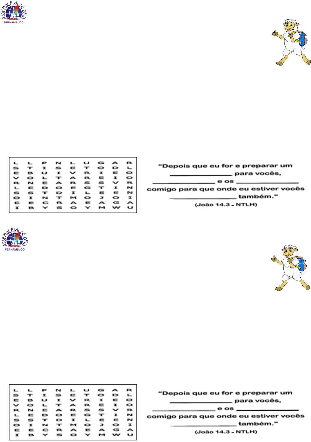 ESCOLA DOMINICAL EM ________________________________________________________. Aluno(a): _________________________________________________ Data: _____ /_____ /_____. ATIVIDADE DE PRIMÁRIOS – ALUNO 2 – 2º Trimestre de 2024 LIÇÃO BÍBLICA 13 – JESUS ME ENSINA A ME PREPARAR PARA A SUA VOLTA TEXTO BÍBLICO: MATEUS 7.21; 24.42-44; GÁLATAS 5.22,23 Paz do Senhor Primários! Aprendemos na Lição Bíblica de hoje, que Jesus antes de voltar para o céu, nos fez a promessa de que um dia voltará para nos buscar (Mateus 24.30,31; João 14.2,3). Mas, Ele não falou o dia nem a hora que voltaria, e disse, para estarmos alertas, vigilantes (Mateus 24.42-44, Marcos13.32,33). Temos que estar preparados espiritualmente, com o nosso coração limpo de todo pecado (Mateus 5.8; 1João 3.2,3). A volta de Jesus está próxima (Lucas 21.25-31), precisamos praticar a Palavra de Deus, para uma vida de obediencia e santidade (2Coríntios 7.1). Devemos orar, ler a Bíblia, etc., nos preparar para subirmos com Jesus para o céu. Pois, só subirá com Ele quem for fiel, aquele que fizer a vontade de Deus (Mateus 7.21). Para isto, o Fruto do Espírito deve estar presente na vida do cristão, para um viver irrepreensível. E, as suas ações e atitudes devem expressar as características do Fruto do Espírito, produzidas pelo Espírito Santo de Deus: amor, alegria, paz, paciência, delicadeza, bondade, fidelidade, humildade e domínio próprio (Gálatas 5.22-25). 1. Encontre no quadro abaixo, as palavras que completam o versículo. --------------------------------------------------------------------------------------------------------------------------------- ESCOLA DOMINICAL EM _______________________________________________________. Aluno(a): ________________________________________________ Data: _____ /_____ /_____. ATIVIDADE DE PRIMÁRIOS – ALUNO 2 – 2º Trimestre de 2024 LIÇÃO BÍBLICA 13 – JESUS ME ENSINA A ME PREPARAR PARA A SUA VOLTA TEXTO BÍBLICO: MATEUS 7.21; 24.42-44; GÁLATAS 5.22,23 Paz do Senhor Primários! Aprendemos na Lição Bíblica de hoje, que Jesus antes de voltar para o céu, nos fez a promessa de que um dia voltará para nos buscar (Mateus 24.30,31; João 14.2,3). Mas, Ele não falou o dia nem a hora que voltaria, e disse, para estarmos alertas, vigilantes (Mateus 24.42-44, Marcos13.32,33). Temos que estar preparados espiritualmente, com o nosso coração limpo de todo pecado (Mateus 5.8; 1João 3.2,3). A volta de Jesus está próxima (Lucas 21.25-31), precisamos praticar a Palavra de Deus, para uma vida de obediencia e santidade (2Coríntios 7.1). Devemos orar, ler a Bíblia, etc., nos preparar para subirmos com Jesus para o céu. Pois, só subirá com Ele quem for fiel, aquele que fizer a vontade de Deus (Mateus 7.21). Para isto, o Fruto do Espírito deve estar presente na vida do cristão, para um viver irrepreensível. E, as suas ações e atitudes devem expressar as características do Fruto do Espírito, produzidas pelo Espírito Santo de Deus: amor, alegria, paz, paciência, delicadeza, bondade, fidelidade, humildade e domínio próprio (Gálatas 5.22-25). 1. Encontre no quadro abaixo, as palavras que completam o versículo. 2. Complete as características do Fruto do Espírito utilizando as vogais corretas (A – E – I – O – U). 3. Agora, de acordo com a Lição Bíblica estudada, faça um lido desenho e pinte. “Quem ama Jesus pratica os seus ensinamentos e sabe que em breve Ele voltará!” ----------------------------------------------------------------------------------------------------------------------------------------------- 2. Complete as características do Fruto do Espírito utilizando as vogais corretas (A – E – I – O – U). 3. Agora, de acordo com a Lição Bíblica estudada, faça um lido desenho e pinte. “Quem ama Jesus pratica os seus ensinamentos e sabe que em breve Ele voltará!”
