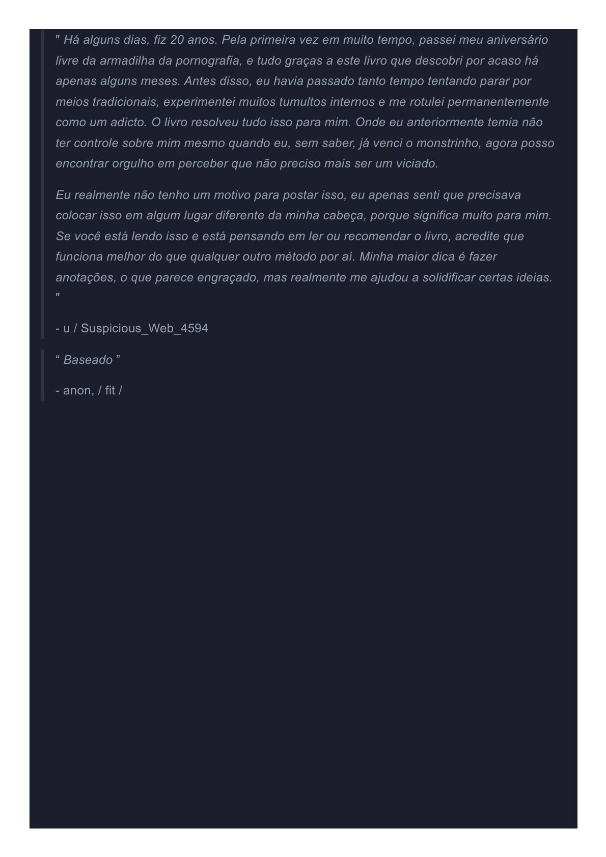 22/09/2021 14:12 Mole-mole https://easypeasymethod.org 5/10 1.1 Advertência Se você está esperando que este livro 'assuste' você a parar de fumar, usando os vários riscos de problemas de saúde dos usuários, como disfunção sexual (incluindo disfunção erétil induzida por pornografia), excitação não confiável, perda de interesse em parceiros sexuais reais, hipofrontalidade cerebral e a acusação cegante de que é um hábito imundo e nojento e que você é uma água-viva estúpida, covarde e fraca de vontade, você ficará profundamente desapontado. Essas táticas nunca me ajudaram a desistir e se fossem ajudar você, você já teria desistido. Os métodos convencionais de parar defendem o uso da força de vontade ou métodos de substituição por 'dieta pornográfica', como 'usar uma vez a cada n dias' e reduzir o consumo. Alguns sites listam pesquisas revisadas por pares sobre neurotransmissores e neuroplasticidade e, embora esses sites sejam informativos, muitos estão cientes dos riscos à saúde e optam por não fazer nada, embora esse material seja normalmente evitado. No final das contas, são igualmente ineficazes, pois não eliminam os motivos do uso de pornografia. Em última análise, transformar algo em um fruto proibido não é como você trata o vício. " Há alguns dias, fiz 20 anos. Pela primeira vez em muito tempo, passei meu aniversário livre da armadilha da pornografia, e tudo graças a este livro que descobri por acaso há apenas alguns meses. Antes disso, eu havia passado tanto tempo tentando parar por meios tradicionais, experimentei muitos tumultos internos e me rotulei permanentemente como um adicto. O livro resolveu tudo isso para mim. Onde eu anteriormente temia não ter controle sobre mim mesmo quando eu, sem saber, já venci o monstrinho, agora posso encontrar orgulho em perceber que não preciso mais ser um viciado. Eu realmente não tenho um motivo para postar isso, eu apenas senti que precisava colocar isso em algum lugar diferente da minha cabeça, porque significa muito para mim. Se você está lendo isso e está pensando em ler ou recomendar o livro, acredite que funciona melhor do que qualquer outro método por aí. Minha maior dica é fazer anotações, o que parece engraçado, mas realmente me ajudou a solidificar certas ideias. " - u / Suspicious_Web_4594 “ Baseado ” - anon, / fit / 22/09/2021 14:12 Mole-mole https://easypeasymethod.org 6/10 Esse método, conhecido como EasyPeasy, funciona de maneira diferente. Algumas das coisas que estão para ser ditas podem ser difíceis de acreditar, mas quando terminar este livro, você não apenas acreditará nelas, como se perguntará como poderia ter sofrido uma lavagem cerebral para acreditar de outra forma. Existe um equívoco comum de que optamos por assistir pornografia. Os viciados em pornografia (sim, viciados) não escolhem assistir pornografia mais do que os alcoólatras optam por se tornar alcoólatras, do que os viciados em heroína optam por se tornar viciados em heroína. É verdade que optamos por inicializar o laptop ou smartphone, abrir o navegador e visitar nosso 'harém online' favorito. De vez em quando escolho ir ao cinema, mas certamente não escolhi passar minha vida inteira no teatro de cinema. Originalmente, a curiosidade e a natureza humana me levaram até lá, mas eu não teria começado se soubesse que ficara viciado, causando o declínio da minha saúde, felicidade e relacionamentos. “Se eu tivesse ouvido falar sobre disfunção sexual na minha primeira visita àquele site pornô!” Pare um momento para refletir: você já tomou a decisão "positiva" de que precisa / precisa de pornografia para se masturbar? Ou que você deve / deve / precisa de fantasias induzidas por pornografia para apimentar o sexo com seu parceiro? Ou que, em certos momentos da sua vida, você não conseguiu desfrutar de uma boa noite de sono ou talvez até mesmo passar uma noite depois de um dia duro de trabalho sem navegar por pornografia? Ou que você não conseguia se concentrar ou lidar com o estresse sem ele? Em que estágio você decidiu que precisava de pornografia, que precisava permanentemente em sua vida, sentindo-se inseguro, até mesmo em pânico sem pornografia, sem seu harém online? Como qualquer outro usuário de pornografia, você foi atraído para a armadilha mais sinistra e sutil que o homem e a natureza já se uniram para inventar. Não existe uma pessoa viva, seja um usuário ou não, que goste da ideia de seus filhos usarem pornografia para enfrentar ou por prazer. Isso significa que todos os adictos gostariam de nunca ter começado. Isso não é surpreendente: ninguém precisa de pornografia para aproveitar a vida ou lidar com o estresse antes de ser fisgado. Ao mesmo tempo, todos os usuários desejam continuar a usar. Afinal, ninguém nos obriga a iniciar o modo de navegação anônima. Quer eles entendam o motivo ou não, são apenas os usuários que decidem bater às portas de seus haréns online. Se houvesse um botão mágico que o usuário pudesse apertar para acordar na manhã seguinte como se nunca tivesse acessado seu primeiro site de tubo, os únicos viciados amanhã seriam os jovens ainda 'experimentando'.