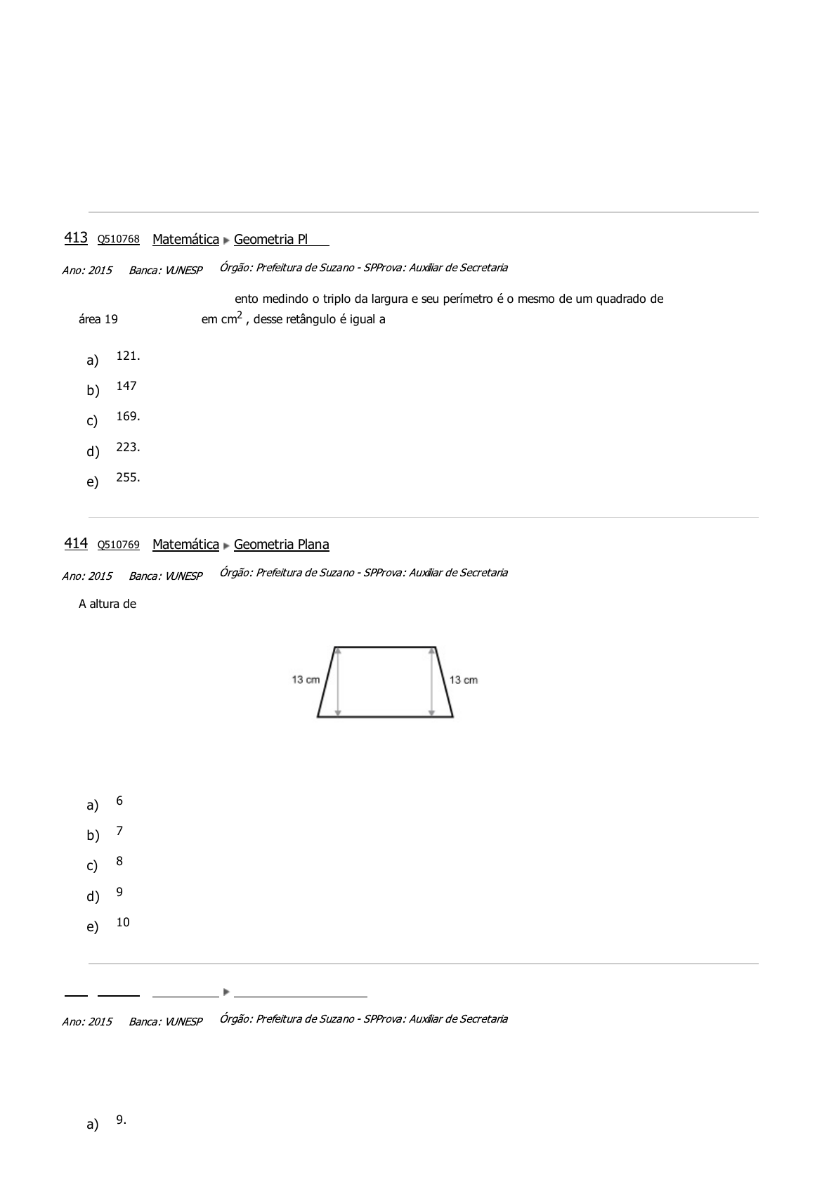 14/04/2017 https://www.qconcursos.com/questoes/imprimir?ano_publicacao=2017++2016++2015++2014+2013&area=&assunto=&caderno_id=&cargo=&cod… https://www.qconcursos.com/questoes/imprimir?ano_publicacao=2017++2016++2015++2014+2013&area=&assunto=&caderno_id=&cargo=&codigo=&di… 5/8 a) 56. b) 60. c) 64. d) 68. e) 72. Ano: 2015 Banca: VUNESP Órgão: Prefeitura de Suzano SPProva: Auxiliar de Secretaria a) 121. b) 147 c) 169. d) 223. e) 255. Ano: 2015 Banca: VUNESP Órgão: Prefeitura de Suzano SPProva: Auxiliar de Secretaria a) 6 b) 7 c) 8 d) 9 e) 10 Ano: 2015 Banca: VUNESP Órgão: Prefeitura de Suzano SPProva: Auxiliar de Secretaria a) 9. 413 Q510768 Matemática Geometria Plana Um retângulo tem o comprimento medindo o triplo da largura e seu perímetro é o mesmo de um quadrado de área 196 cm2 . A área, em cm2 , desse retângulo é igual a 414 Q510769 Matemática Geometria Plana A altura de um trapézio isósceles é 12 cm e a medida de cada um dos lados não paralelos é 13 cm, conforme mostra a figura, que está fora de escala. A diferença, em cm, da base maior para a base menor é igual a 415 Q510770 Matemática Aritmética e Problemas Um total de 30 alunos estão reunidos no pátio da escola e a soma das idades de todos esses alunos é igual a 283 anos. Sabendose que nesse grupo os alunos têm 9 ou 10 anos de idade, o número de alunos que tem 10 anos de idade é igual a 14/04/2017 https://www.qconcursos.com/questoes/imprimir?ano_publicacao=2017++2016++2015++2014+2013&area=&assunto=&caderno_id=&cargo=&cod… https://www.qconcursos.com/questoes/imprimir?ano_publicacao=2017++2016++2015++2014+2013&area=&assunto=&caderno_id=&cargo=&codigo=&di… 6/8 b) 10 c) 11. d) 12. e) 13. Ano: 2015 Banca: VUNESP Órgão: Prefeitura de Suzano SPProva: Secretário Escolar a) 45. b) 68. c) 73 d) 78. e) 93. Ano: 2015 Banca: VUNESP Órgão: Prefeitura de Suzano SPProva: Secretário Escolar a) 1 e 1. b) 1 e 2. c) 1 e 3. 416 Q511043 Matemática O gráfico de setores representa, em %, o comportamento de algumas empresas brasileiras que foram analisadas em relação ao uso da água, das quais algumas consideram a água essencial e importante para garantir a produtividade. Se, do total das empresas analisadas, apenas 6 fizeram mudanças radicais, o número de empresas que estão representadas no setor III é 417 Q511044 Matemática O código de trânsito de um certo país adota o sistema de pontuação na carteira de habilitação de motoristas que infringem as leis de trânsito. São atribuídos 7 pontos por infração julgada como gravíssima, 5 pontos para a grave e 4 pontos para a infração média. Roseli tem 34 pontos registrados na sua carteira e teve os 3 tipos de infração. Em infrações gravíssimas, teve o maior percentual de pontos possível do total. Assim, o número de vezes que ela foi autuada em infrações graves e médias foram, respectivamente, 14/04/2017 https://www.qconcursos.com/questoes/imprimir?ano_publicacao=2017++2016++2015++2014+2013&area=&assunto=&caderno_id=&cargo=&cod… https://www.qconcursos.com/questoes/imprimir?ano_publicacao=2017++2016++2015++2014+2013&area=&assunto=&caderno_id=&cargo=&codigo=&di… 7/8 d) 2 e 2. e) 2 e 3. Ano: 2015 Banca: VUNESP Órgão: Prefeitura de Suzano SPProva: Secretário Escolar a) 384. b) 360. c) 320. d) 300. e) 240. Ano: 2015 Banca: VUNESP Órgão: Prefeitura de Suzano SPProva: Secretário Escolar a) 39 640. b) 38 920. c) 38 400. d) 36 400. e) 36 000. Ano: 2015 Banca: VUNESP Órgão: Prefeitura de Suzano SPProva: Secretário Escolar a) 52. b) 48. c) 42. 418 Q511045 Matemática Para cobrir todo o piso de uma sala retangular, foram utilizadas placas inteiras quadradas de 1/2 metro de lado. Essa sala tem 40 metros de perímetro, e a medida de sua largura é igual a 2/3 do seu comprimento. O total de placas usadas foi 419 Q511046 Matemática Em uma prova de ciclismo de 40 km, Felipe, correndo a uma velocidade média de 0,018 km por segundo, chegou 20 segundos depois de Lucas. No momento em que Lucas, o primeiro colocado, atravessou a linha de chegada, Felipe já havia percorrido, em metros, 420 Q511047 Matemática As dimensões da caixa sob a forma de bloco retoretângulo da figura estão expressas em metros e seu volume interno é 9 m3 . A soma das medidas de todas as dimensões internas da caixa, em metros, é 14/04/2017 https://www.qconcursos.com/questoes/imprimir?ano_publicacao=2017++2016++2015++2014+2013&area=&assunto=&caderno_id=&cargo=&cod… https://www.qconcursos.com/questoes/imprimir?ano_publicacao=2017++2016++2015++2014+2013&area=&assunto=&caderno_id=&cargo=&codigo=&di… 8/8 c) d) 36. e) 28. Respostas 401: 402: 403: 404: 405: 406: 407: 408: 409: 410: 411: 412: 413: 414: 415: 416: 417: 418: 419: 420: ← 1 2 … 17 18 19 20 21 22 23 24 25 … 56 57 → https://www.qconcursos.com/questoes/imprimir?ano_publicacao=2017++2016++2015++2014+2013&area=&assunto=&caderno_id=&cargo=&codigo=&disciplina=13&escolaridade=&esfera=&instituto=&minissimulado_id=&modalidade=&nao_resolvidas=&nivel_dificuldade=&order=questao_aplicada_em+desc&organizadora=152&page=20&palavra_chave=&per_page=20&possui_anotacoes=&possui_comentarios=&possui_comentarios_gerais=&possui_gabarito_comentado_texto_e_video=&possui_material_apoio=undefined&product_id=1&prova=&q=&resolvidas=&resolvidas_certas=&resolvidas_erradas=&sem_anuladas=&sem_desatualizadas=&sem_dos_meus_cadernos=&user_id=751001 https://www.qconcursos.com/questoes/imprimir?ano_publicacao=2017++2016++2015++2014+2013&area=&assunto=&caderno_id=&cargo=&codigo=&disciplina=13&escolaridade=&esfera=&instituto=&minissimulado_id=&modalidade=&nao_resolvidas=&nivel_dificuldade=&order=questao_aplicada_em+desc&organizadora=152&page=1&palavra_chave=&per_page=20&possui_anotacoes=&possui_comentarios=&possui_comentarios_gerais=&possui_gabarito_comentado_texto_e_video=&possui_material_apoio=undefined&product_id=1&prova=&q=&resolvidas=&resolvidas_certas=&resolvidas_erradas=&sem_anuladas=&sem_desatualizadas=&sem_dos_meus_cadernos=&user_id