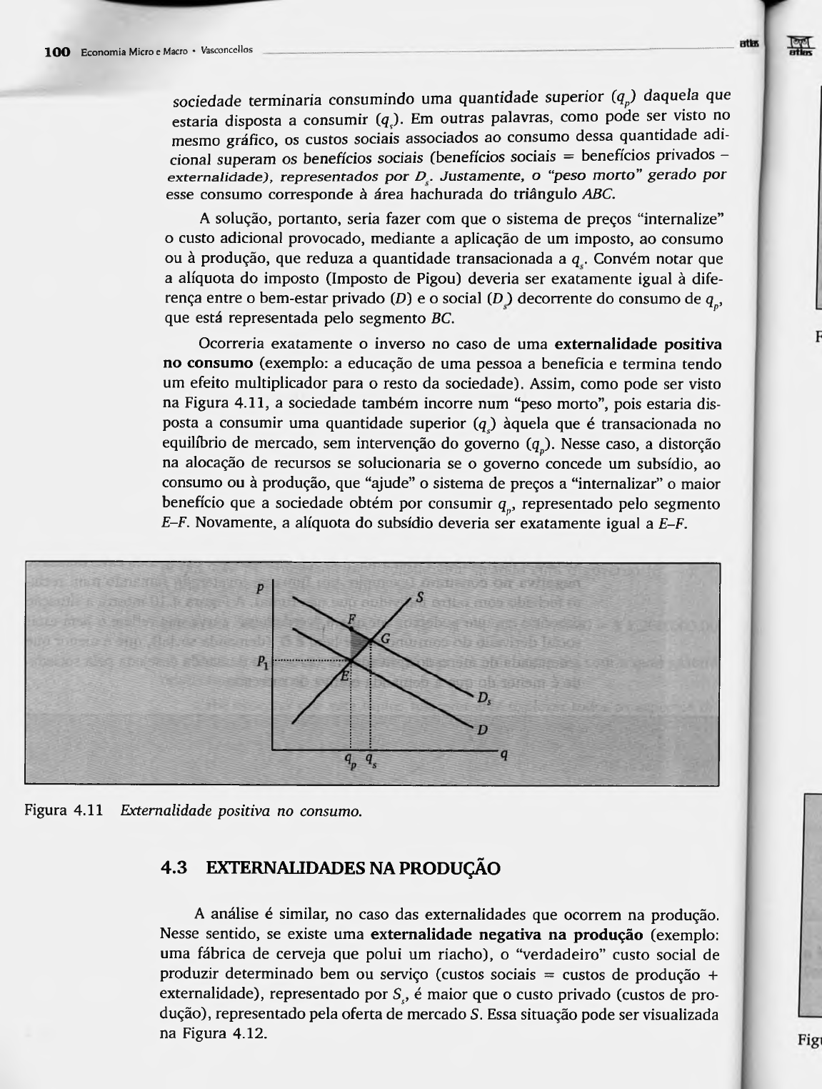 100 Econom ia Micro e Macro • Vasconccllos sociedade terminaria consumindo uma quantidade superior (qp) daquela que estaria disposta a consumir (<?,). Em outras palavras, como pode ser visto no mesmo gráfico, os custos sociais associados ao consumo dessa quantidade adi cional superam os benefícios sociais (benefícios sociais = benefícios privados — externalidade), representados por Z?. Justamente, o “peso morto” gerado por esse consumo corresponde à área hachurada do triângulo ABC. A solução, portanto, seria fazer com que o sistema de preços “intemalize” o custo adicional provocado, mediante a aplicação de um imposto, ao consumo ou à produção, que reduza a quantidade transacionada a q . Convém notar que a alíquota do imposto (Imposto de Pigou) deveria ser exatamente igual à dife rença entre o bem-estar privado (D) e o social (D ) decorrente do consumo de qp, que está representada pelo segmento BC. Ocorreria exatamente o inverso no caso de uma externalidade positiva no consumo (exemplo: a educação de uma pessoa a beneficia e termina tendo um efeito multiplicador para o resto da sociedade). Assim, como pode ser visto na Figura 4.11, a sociedade também incorre num “peso morto”, pois estaria dis posta a consumir uma quantidade superior (q ) àquela que é transacionada no equilíbrio de mercado, sem intervenção do governo (qp). Nesse caso, a distorção na alocação de recursos se solucionaria se o governo concede um subsídio, ao consumo ou à produção, que “ajude” o sistema de preços a “internalizar” o maior benefício que a sociedade obtém por consumir qp, representado pelo segmento E-F. Novamente, a alíquota do subsídio deveria ser exatamente igual a E-F. Figura 4.11 Externalidade positiva no consumo. 4.3 EXTERNALIDADES NA PRODUÇÃO A análise é similar, no caso das externalidades que ocorrem na produção. Nesse sentido, se existe uma externalidade negativa na produção (exemplo: uma fábrica de cerveja que polui um riacho), o “verdadeiro” custo social de produzir determinado bem ou serviço (custos sociais = custos de produção + externalidade), representado por Ss, é maior que o custo privado (custos de pro dução), representado pela oferta de mercado S. Essa situação pode ser visualizada na Figura 4.12. Aplicações da Análise M icroeconôm ica em Políticas Públicas 101 Figura 4.12 Externalidade negativa na produção. Dessa forma, em ausência de intervenção do governo, como o sistema de preços não leva em consideração esse maior custo social provocado pela externalidade, no equilíbrio de mercado haverá uma perda social ao produzir-se uma quantidade (qp) superior à quantidade socialmente ótima (q ) . Ou seja, no vamente os custos sociais de produzir a quantidade de equilíbrio do mercado su peram os benefícios sociais derivados do seu consumo. Assim, tal como ocorre no caso da externalidade negativa no consumo, a solu ção seria aplicar um imposto, ao consumo ou à produção com o intuito de fazer com que os produtores privados “intemalizem” o “verdadeiro” custo de produzir o referido bem ou serviço. Dessa forma, a quantidade transacionada se reduziria ao nível compatível com o máximo bem-estar social, qs, ao aplicar-se um imposto de alíquota equivalente à diferença entre o custo social e o custo privado (segmento H-T) (o chamado Imposto de Pigou). Finalmente, no caso de uma externalidade positiva na produção de algum bem ou serviço (exemplo: uma criação de abelhas próxima a uma plantação de laranjas), a análise é o inverso do caso anterior, devendo-se aplicar um subsídio à sua produção ou consumo, eliminando o “peso morto” representado pela área hachurada do triângulo JKL, tal como pode ser visto na Figura 4.13. Novamente, a alíquota do subsídio deveria ser exatamente igual à discrepância entre o custo pri vado (custo de produção) e o custo social (custo de produção + ganho por externalidade) de produzir tal bem ou serviço (segmento KL). p* k / s / y S s \ L / p p s i \ / K f D qn is ....~ " * *p ---------------- ---------- .. ■ / ------ : -■ ■ ■ ■ ■ '.a -----------------. --------------------------------- Figura 4.13 Externalidade positiva na produção. 1 1 N I I - ' A C S Ce n tro Cuilurai-Sisi B R E G I S T R O ______ (p 4.4 TEOREMA DE COASE A solução tradicional (“pigouviana”) anterior é relativamente simples, embora apresente dois inconvenientes. O primeiro deles é de natureza prática, pois exige conhecer ampla extensão das curvas de demanda e oferta, o que nem sempre é possível. O segundo foi observado por um advogado, Ronald Coase, Prêmio Nobel de Economia em 1991. A observação de Coase baseia-se na idéia de que, em presença de externalidades negativas, os impostos “pigouvianos” podem não ser a melhor solução, do ponto de vista social. Isso ocorreria pois a solução “pigouviana” estaria impossibilitando que as partes envolvidas possam negociar, minimizando as possí veis perdas para ambas decorrentes da aplicação de um imposto pelo Governo. Podemos pensar no seguinte exemplo: imaginemos uma fábrica que polui um rio próximo a um pequeno povoado. A solução tradicional consistiria em aplicar um imposto, por exemplo, à produção da fábrica. Com isso, a fábrica reduziria a poluição do rio, o que tornaria o povoado mais habitável. Desse modo, a tendência seria que a população desse povoado aumentasse, o que faria com que, mesmo com a redução da produção da fábrica, mais pessoas fossem afeta das pela externalidade negativa. Assim, poderia ser justificável aumentar a alíquota do imposto à produção, o que reduziria ainda mais a produção e o consumo do bem ou serviço em questão. Como se vê, a aplicação do imposto “pigouviano” pode terminar reduzindo fortemente a produção e o consumo de um bem valorizado pela sociedade. Nesse sentido, poderia ser mais eficiente permitir que as par