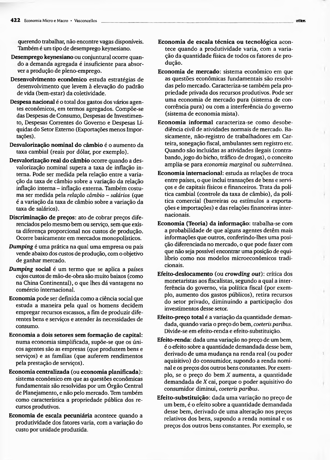 4 2 2 Economia M icro e Macro • Vasconcellos rTtlHÍ querendo trabalhar, não encontre vagas disponíveis. Também é um tipo de desemprego keynesiano. Desemprego keynesiano ou conjuntural ocorre quan do a demanda agregada é insuficiente para absor ver a produção de pleno-emprego. Desenvolvimento econômico estuda estratégias de desenvolvimento que levem à elevação do padrão de vida (bem-estar) da coletividade. Despesa nacional é o total dos gastos dos vários agen tes econômicos, em termos agregados. Compõe-se das Despesas de Consumo, Despesas de Investimen to, Despesas Correntes do Governo e Despesas Lí quidas do Setor Externo (Exportações menos Impor tações). Desvalorização nominal do câmbio é o aumento da taxa cambial (reais por dólar, por exemplo). Desvalorização real do câmbio ocorre quando a des valorização nominal supera a taxa de inflação in terna. Pode ser medida pela relação entre a varia ção da taxa de câmbio sobre a variação da relação inflação interna - inflação externa. Também costu ma ser medida pela relação câmbio - salários (que é a variação da taxa de câmbio sobre a variação da taxa de salários). Discriminação de preços: ato de cobrar preços dife renciados pelo mesmo bem ou serviço, sem que exis ta diferença proporcional nos custos de produção. Ocorre basicamente em mercados monopolísticos. Dumping é uma prática na qual uma empresa ou país vende abaixo dos custos de produção, com o objetivo de ganhar mercado. Dumping social é um termo que se aplica a países cujos custos de mão-de-obra são muito baixos (como na China Continental), o que lhes dá vantagens no comércio internacional. Economia pode ser definida como a ciência social que estuda a maneira pela qual os homens decidem empregar recursos escassos, a fim de produzir dife rentes bens e serviços e atender às necessidades de consumo. Economia a dois setores sem formação de capital: numa economia simplificada, supõe-se que os úni cos agentes são as empresas (que produzem bens e serviços) e as famílias (que auferem rendimentos pela prestação de serviços). Economia centralizada (ou economia planificada): sistema econômico em que as questões econômicas fundamentais são resolvidas por um Órgão Central de Planejamento, e não pelo mercado. Tem também como característica a propriedade pública dos re cursos produtivos. Economia de escala pecuniária acontece quando a produtividade dos fatores varia, com a variação do custo por unidade produzida. Economia de escala técnica ou tecnológica acon tece quando a produtividade varia, com a varia ção da quantidade física de todos os fatores de pro dução. Economia de mercado: sistema econômico em que as questões econômicas fundamentais são resolvi das pelo mercado. Caracteriza-se também pela pro priedade privada dos recursos produtivos. Pode ser uma economia de mercado pura (sistema de con corrência pura) ou com a interferência do governo (sistema de economia mista). Economia informal caracteriza-se como desobe diência civil de atividades normais de mercado. Ba sicamente, não-registro de trabalhadores em Car teira, sonegação fiscal, ambulantes sem registro etc. Quando são incluídas as atividades ilegais (contra bando, jogo do bicho, tráfico de drogas), o conceito amplia-se para economia marginal ou subterrânea. Economia internacional: estuda as relações de troca entre países, o que inclui transações de bens e servi ços e de capitais físicos e financeiros. Trata da polí tica cambial (controle da taxa de câmbio), da polí tica comercial (barreiras ou estímulos a exporta ções e importações) e das relações financeiras inter nacionais. Economia (Teoria) da informação: trabalha-se com a probabilidade de que alguns agentes detêm mais informações que outros, conferindo-lhes uma posi ção diferenciada no mercado, o que pode fazer com que não seja possível encontrar uma posição de equi líbrio como nos modelos microeconômicos tradi cionais. Efeito-deslocamento (ou crowding out) : crítica dos monetaristas aos fiscalistas, segundo a qual a inter ferência do governo, via política fiscal (por exem plo, aumento dos gastos públicos), retira recursos do setor privado, diminuindo a participação dos investimentos desse setor. Efeito-preço total é a variação da quantidade deman dada, quando varia o preço do bem, coeteris paribus. Divide-se em efeito-renda e efeito-substituição. Efeito-renda: dada uma variação no preço de um bem, é o efeito sobre a quantidade demandada desse bem, derivado de uma mudança na renda real (ou poder aquisitivo) do consumidor, supondo a renda nomi nal e os preços dos outros bens constantes. Por exem plo, se o preço do bem X aumenta, a quantidade demandada de X cai, porque o poder aquisitivo do consumidor diminui, coeteris paribus. Efeito-substituição: dada uma variação no preço de um bem, é o efeito sobre a quantidade demandada desse bem, derivado de uma alteração nos preços relativos dos bens, supondo a renda nominal e os preços dos outros bens constantes. Por exemplo, se Glossário 4 2 3 o preço do bem X aum enta, a quantidade dem an dada d e X cai, porque o bem X fica relativam ente mais caro que os outros bens, coeteris paribus. Efeito Olivera-Tanzi: aum ento do déficit fiscal p rodu zido pela desvalorização real da arrecadação. G e ralmente, ocorre em sittuações de inflação alta, d e teriorando a situação fiscal, e levando o governo a aumentar suas necessidades de financiamento. Nom e devido ao econom ista inglês Alfred C. Pigou. Eficiência alocativa refere-se à escolha do conjunto de bens, de form a a em pregar, da m elhor m aneira, os recursos produtivos juntam ente com aqueles pro cessos técnicos de produção que utilizem mais ade quadam ente os recursos que a sociedade tem em m aior abundância. Eficiência econômica, entre dois ou mais processos de produção, é aquela que pe