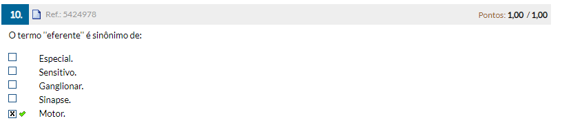 10. 5424978 Pontos: 1,00 / 1,00 termo "eferente" é sinônimo de: Especial. Sensitivo. Ganglionar. Sinapse. Motor.