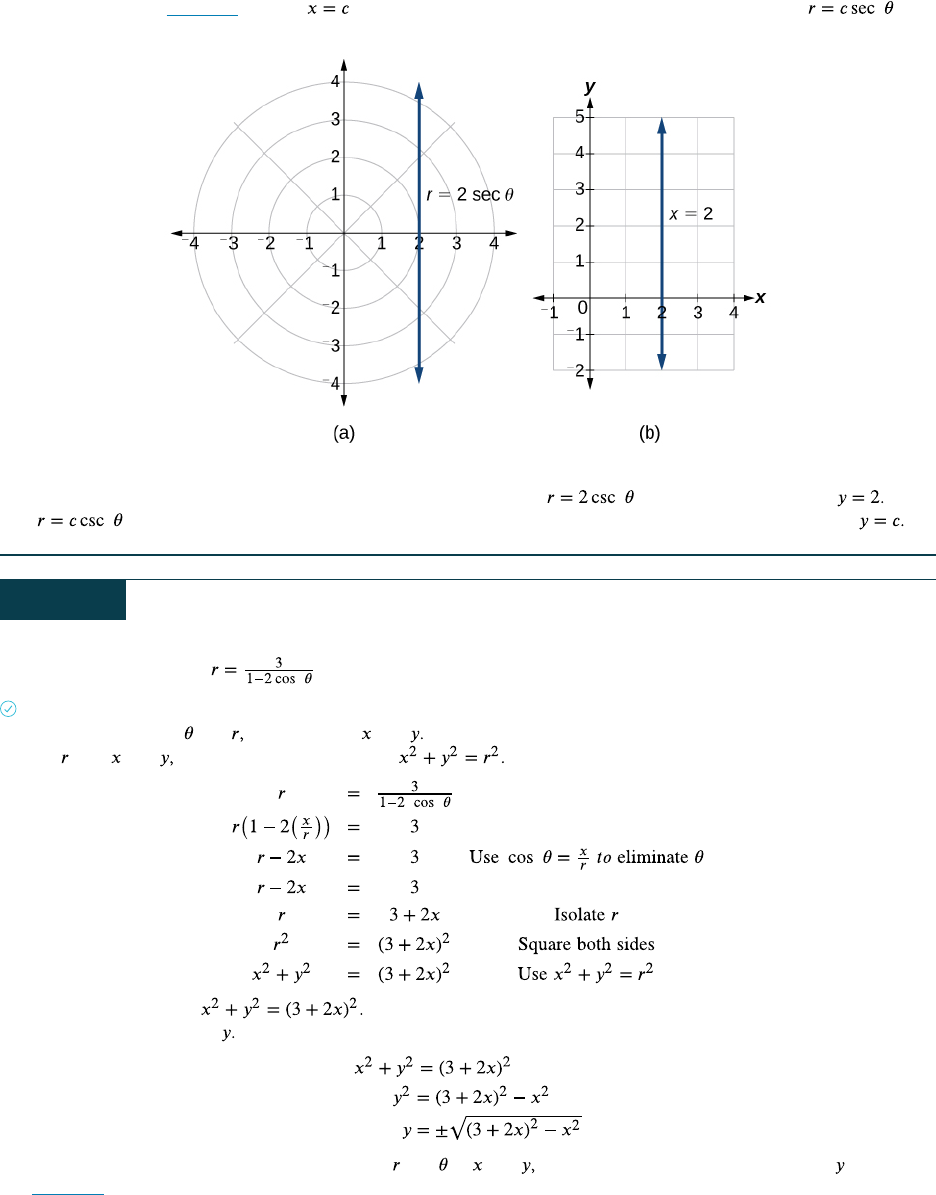rectangular grid (see Figure 12). Just as is the standard form for a vertical line in rectangular form, is the standard form for a vertical line in polar form. Figure 12 (a) Polar grid (b) Rectangular coordinate system A similar discussion would demonstrate that the graph of the function will be the horizontal line In fact, is the standard form for a horizontal line in polar form, corresponding to the rectangular form EXAMPLE 10 Rewriting a Polar Equation in Cartesian Form Rewrite the polar equation as a Cartesian equation. Solution The goal is to eliminate and and introduce and We clear the fraction, and then use substitution. In order to replace with and we must use the expression The Cartesian equation is However, to graph it, especially using a graphing calculator or computer program, we want to isolate When our entire equation has been changed from and to and we can stop, unless asked to solve for or simplify. See Figure 13. 934 10 • Further Applications of Trigonometry Access for free at openstax.org Figure 13 The “hour-glass” shape of the graph is called a hyperbola. Hyperbolas have many interesting geometric features and applications, which we will investigate further in Analytic Geometry. Analysis In this example, the right side of the equation can be expanded and the equation simplified further, as shown above. However, the equation cannot be written as a single function in Cartesian form. We may wish to write the rectangular equation in the hyperbola’s standard form. To do this, we can start with the initial equation. TRY IT #5 Rewrite the polar equation in Cartesian form. EXAMPLE 11 Rewriting a Polar Equation in Cartesian Form Rewrite the polar equation in Cartesian form. Solution This equation can also be written as 10.3 • Polar Coordinates 935 MEDIA Access these online resources for additional instruction and practice with polar coordinates. Introduction to Polar Coordinates (http://openstax.org/l/intropolar) Comparing Polar and Rectangular Coordinates (http://openstax.org/l/polarrect) 10.3 SECTION EXERCISES Verbal 1. How are polar coordinates different from rectangular coordinates? 2. How are the polar axes different from the x- and y-axes of the Cartesian plane? 3. Explain how polar coordinates are graphed. 4. How are the points and related? 5. Explain why the points and are the same. Algebraic For the following exercises, convert the given polar coordinates to Cartesian coordinates. Remember to consider the quadrant in which the given point is located when determining for the point. 6. 7. 8. 9. 10. For the following exercises, convert the given Cartesian coordinates to polar coordinates with Remember to consider the quadrant in which the given point is located. 11. 12. 13. 14. 15. For the following exercises, convert the given Cartesian equation to a polar equation. 16. 17. 18. 19. 20. 21. 22. 23. 24. 25. 26. 27. 936 10 • Further Applications of Trigonometry Access for free at openstax.org For the following exercises, convert the given polar equation to a Cartesian equation. Write in the standard form of a conic if possible, and identify the conic section represented. 28. 29. 30. 31. 32. 33. 34. 35. 36. 37. 38. 39. Graphical For the following exercises, find the polar coordinates of the point. 40. 41. 42. 43. 44. For the following exercises, plot the points. 45. 46. 47. 48. 49. 50. 10.3 • Polar Coordinates 937 51. 52. 53. 54. For the following exercises, convert the equation from rectangular to polar form and graph on the polar axis. 55. 56. 57. 58. 59. 60. 61. For the following exercises, convert the equation from polar to rectangular form and graph on the rectangular plane. 62. 63. 64. 65. 66. 67. 68. Technology 69. Use a graphing calculator to find the rectangular coordinates of Round to the nearest thousandth. 70. Use a graphing calculator to find the rectangular coordinates of Round to the nearest thousandth. 71. Use a graphing calculator to find the polar coordinates of in degrees. Round to the nearest thousandth. 72. Use a graphing calculator to find the polar coordinates of in degrees. Round to the nearest hundredth. 73. Use a graphing calculator to find the polar coordinates of in radians. Round to the nearest hundredth. Extensions 74. Describe the graph of 75. Describe the graph of 76. Describe the graph of 77. Describe the graph of 78. What polar equations will give an oblique line? For the following exercise, graph the polar inequality. 79. 80. 81. 938 10 • Further Applications of Trigonometry Access for free at openstax.org