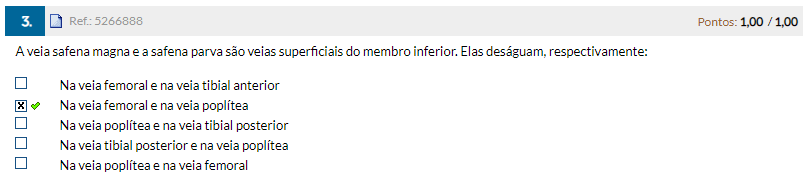 3. Ref.: 5266888 Pontos: 1,00 / 1,00 A veia safena magna e a safena parva são veias superficiais do membro inferior. Elas respectivamente: Na veia femoral e na veia tibial anterior Na femoral e na veia Na poplítea e na tibial posterior Na tibial posterior e na veia poplítea Na poplítea e na femoral