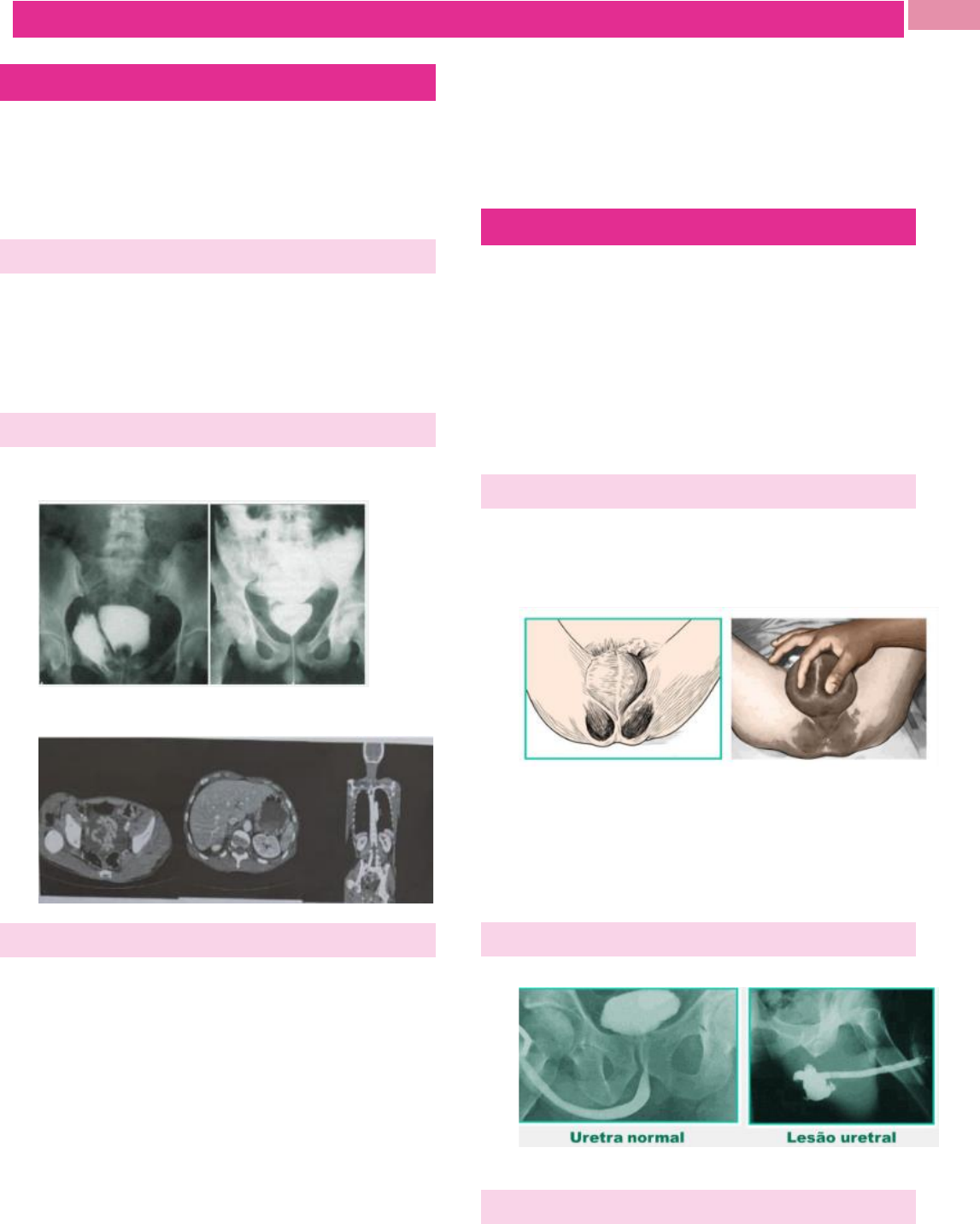 1 TRAUMA PÉLVICO TRAUMA DE BEXIGA: ➔ 10% dos traumas urológicos, segundo mais frequente ➔ Trauma contuso: 85% ➔ Fratura pélvica concomitante (83-95%): ramos púbicos/anel obturador CLÍNICA: ➔ Hematúria macroscópica ➔ Dor suprapúbica ➔ Incapacidade ou dificuldade em urinar ➔ Peritonite pode estar presente nos casos de lesão intraperitoneal. DIAGNÓSTICO: ➔ Laparotomia ➔ Cistografia retrógrada: ➔ TC com líquido livre sem lesão de víscera maciça + hematúria, deve pensar em lesão intraperitoneal TRATAMENTO: ➔ Lesão intraperitoneal: reparo cirúrgico imediato (fios absorvíveis) ➢ Laparotomia e rafia primária da lesão ➢ Cateter vesical por 2 a 3 semanas ➢ Cistografia antes de retirar cateter ➔ Lesão extraperitoneal: Cateter vesical por 2 a 3 semanas + Cistografia antes de retirar cateter ➔ Lesões extraperitoneais por trauma penetrante e lesões complexas: Reparo cirúrgico precoce ➢ Corpo estranho ou fragmento ósseo na bexiga; ➢ Hematúria persistente com formação de coágulos que impedem a drenagem adequada da bexiga (não usar irrigação vesical). ➢ Lesão concomitante de órgãos pélvicos (por exemplo: lesões retais e vaginais). ➢ Lesão no colo da bexiga (onde se abre a uretra); TRAUMA DE URETRA: ➔ 4% dos traumas urológicos ➔ Trauma contuso: 90% ➔ Uretra anterior: fossa navicular, uretra peniana e uretra bulbar (85% dos traumas uretrais são na uretra bulbar). O tipo mais comum de trauma é a "queda a cavaleiro“. ➔ Uretra posterior: uretra membranosa e uretra prostática. As lesões geralmente ocorrem na uretra membranosa e estão associadas à fratura pélvica. MANIFESTAÇÕES CLÍNICAS: ➔ Tríade clássica: uretrorragia (sangue no meato uretral), incapacidade de urinar e globo vesical palpável (”bexigoma”). ➔ Hematoma perineal ou “em forma de borboleta” ➔ Próstata flutuante ao toque retal (deslocamento cranial) – na lesão de uretra posterior ➔ Trauma direto ou queda a cavaleiro: uretra anterior (bulbar é mais comum) ➔ Fratura pélvica instável – uretra posterior ➔ Diagnóstico: uretrocistografia retógrada DIAGNÓSTICO: ➔ Uretrocistografia retrógrada: ➔ Não deve sondar esse paciente TRATAMENTO: ➔ Imediato: cistostomia por punção ou aberta 2 TRAUMA PÉLVICO ➔ Definitivo: após 3 a 6 meses (pela Urologia) ➔ Somente as lesões penetrantes na uretra anterior têm indicação de exploração e reparo primário, exceto se o paciente estiver instável. TRAUMA TESTICULAR: ➔ Equimose escrotal e edema ou dificuldade em identificar os contornos do testículo ➔ USG: perda de continuidade da túnica albugínea, ruptura testicular, heterogenecidade do parênquima testicular, hematocele ou hematoma testicular = ➔ Tratamento: ➢ Lacerações superficiais do escroto: fechamento com suturas absorvíveis. ➢ Traumatismo escrotal penetrante, que atravesse a fáscia de Dartos: desbridamento, limpeza e fechamento da túnica albugínea. ➔ Lesões testiculares complexas, sem parênquima viável: orquiectomia TRAUMA PENIANO: ➔ Diagnóstico clínico/USG: fratura dos corpos cavernosos ➔ Lesões penetrantes: 40-50% tem lesão uretral associada. Reparo imediato da túnica albugínea e da uretra. ➔ Lesões contusas: ➢ Degloving: perda parcial, circunferencial ou completa da pele peniana. Tratamento com enxerto/retalho. ➢ Amputação peniana: lesão rara. Tratamento: reimplante (imediatamente após a lesão). Se não for possível o replantio, uma uretrostomia perineal ou cistostomia são opções para o desvio urinário. ➢ Fratura peniana: lesão incomum que pode ocorrer quando a há ruptura da túnica albugínea que reveste o corpo cavernoso. Ocorre durante o ato sexual. Pode resultar em lesão da uretra anterior concomitante (20% dos pacientes) FRATURAS PÉLVICAS: ➔ Traumas de alta energia ➔ Lesão do trato urinário interior (bexiga, uretra posterior) ➔ Lesão do plexo venoso e vasos ilíacos ➔ Lesão retal e vaginal ➔ Lesão perineal e nervosa. ➔ Instabilidade hemodinâmica no cenário de fratura pélvica: devido a hemorragia do plexo venoso pélvico pré-sacral e das superfícies abertas do osso – 85%. ➔ A estabilidade da pelve é avaliada pelo exame físico MECANISMO DE TRAUMA: ➔ Fechada: ocorre compressão lateral ➢ Frequência de 60 a 70% dos casos ➔ Livro Aberto/ Open the book: compressão anteroposterior ➢ Frequência de 15 a 20% ➔ Cisalhamento Vertical: ➢ Frequência de 5 a 15% MANEJO: ➔ Comprimir a pelve com amarração com lençol LESÕES PERINEAIS: ➔ Limpeza da lesão e desbridamento de todos os tecidos ➔ desvitalizados. Deixar a ferida aberta para fechamento por segunda intenção, programação de curativos seriados,. ➔ Antibioticoterapia de amplo espectro. ➔ Derivação do trânsito intestinal e cateterismo vesical (ou cistostomia) ➔ Tratamento adequado das fraturas. ➔ Revisão programada em 48 a 72h. ➔ Reconstrução: apenas quando os tecidos estiverem todos viáveis, na ausência de infecção e 3 TRAUMA PÉLVICO as condições clínicas do paciente permitam. Portanto, o fechamento da ferida com rotação de retalho miocutâneo nos traumas pelve-perineais complexos está contraindicado nesse primeiro momento do tratamento devido ao alto risco de infecção.