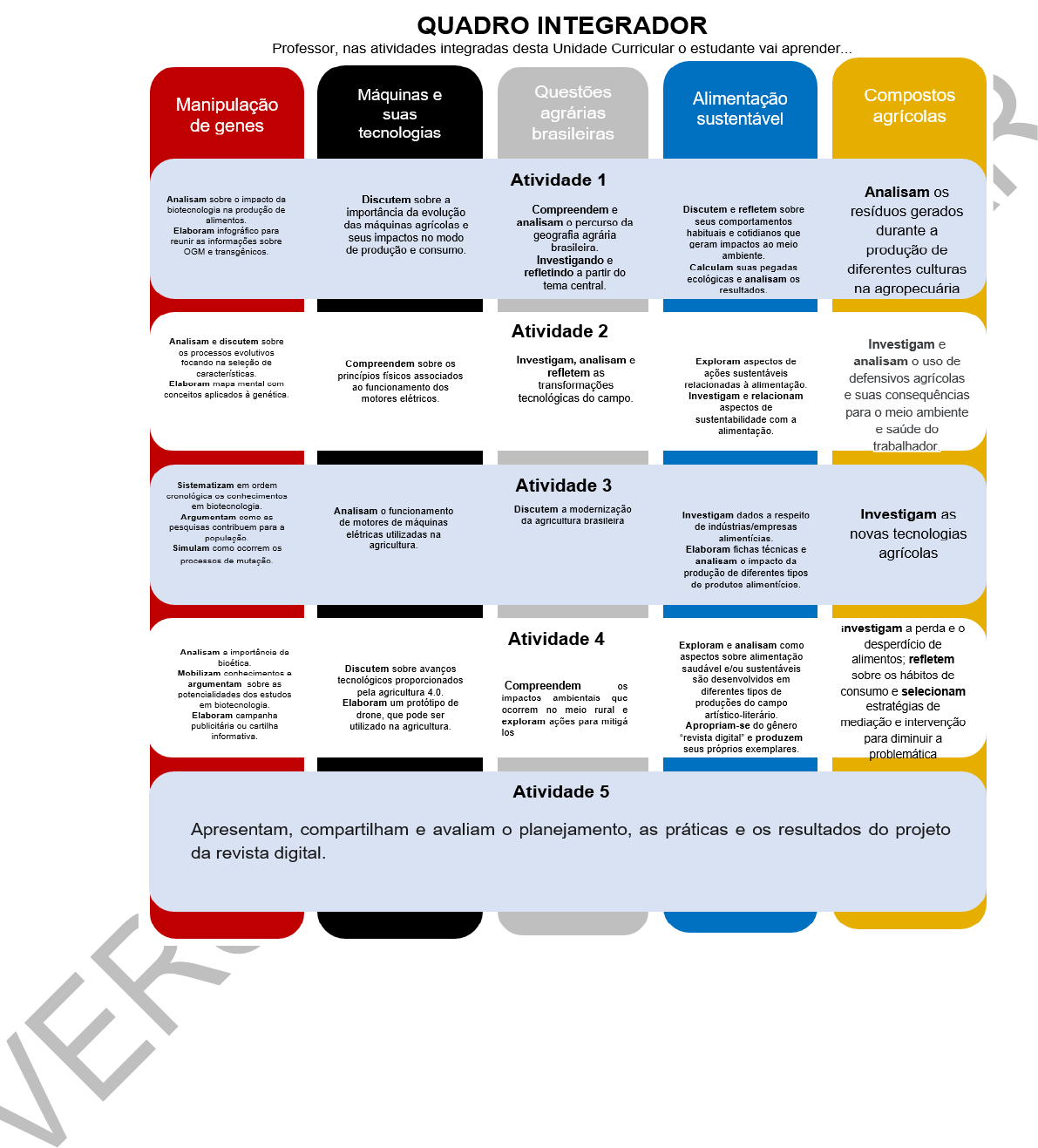 Componente 1 Manipulação de genes Introdução Duração: 30h Aulas semanais: 2 Quais professores podem ministrar este componente: Biologia ou Química Informações gerais: A Tecnologia dos Organismos Geneticamente Modificados (OGM) consiste em empregar distintas ferramentas para manipular o DNA de um organismo, removendo e/ou introduzindo genes de um organismo da mesma espécie ou de espécies diferentes. A Atividade 1 propõe uma retomada dos conhecimentos que já foram estudados sobre Biotecnologia na Formação Geral Básica (FGB) para ampliar e aprofundar as habilidades previstas para essa Unidade Curricular (UC). Após uma retomada e aprofundamento dos conhecimentos de genética, a partir de uma análise histórica sobre Ciência e Tecnologia, na Atividade 2 os estudantes construirão uma linha do tempo sobre a Biotecnologia, que auxiliará na compreensão de que o conhecimento é construído com o tempo. A partir de um levantamento histórico sobre a construção do conhecimento da biotecnologia, na Atividade 3 os estudantes organizarão informações, a fim de argumentar como as pesquisas na área contribuem de alguma forma com a população brasileira. Na Atividade 4, após produzirem artigos de opinião sobre o desenvolvimento de tecnologias, associados ao estudo da Biotecnologia, que tenham o potencial de auxiliar na promoção da qualidade de vida das pessoas, os estudantes sistematizarão os conhecimentos desenvolvidos ao longo do componente em uma campanha publicitária ou cartilha informativa. A Atividade 5, comum a todos os componentes desta Unidade Curricular, é uma proposta de produção de uma revista digital, portanto é fundamental que seja realizado um trabalho integrado entre os componentes, tendo em conta quais são as informações e produções que poderão compor a produção prevista. Sendo assim, é preciso que seja feito um planejamento conjunto à vista das possibilidades de práticas e conteúdos a serem desenvolvidos ao longo do semestre. Objetos de conhecimento: Biotecnologia na produção de Organismos Geneticamente Modificados (OGM) e transgênicos; bioética aplicada à biotecnologia agropecuária. Competências e Habilidades da Formação Geral Básica a serem aprofundadas: Competências 2 e 3.