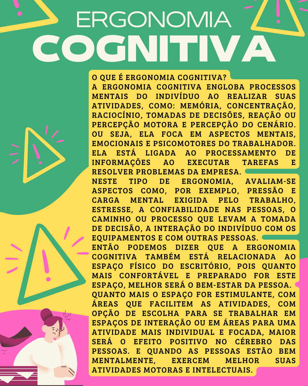 ERGONOMIA COGNITIVA o QUE É ERGONOMIA COGNITIVA? A ERGONOMIA COGNITIVA ENGLOBA PROCESSOS MENTAIS DO INDIVÍDUO AO REALIZAR SUAS ATIVIDADES, COMO: MEMÓRIA, CONCENTRAÇÃO, RACIOCÍNIO, TOMADAS DE DECISÕES, REAÇÃO OU PERCEPÇÃO MOTORA E PERCEPÇÃO DO CENÁRIO. OU SEJA, ELA FOCA EM ASPECTOS MENTAIS, EMOCIONAIS E PSICOMOTORES DO TRABALHADOR. ELA ESTÁ LIGADA AO PROCESSAMENTO DE INFORMAÇÕES AO EXECUTAR TAREFAS E RESOLVER PROBLEMAS DA EMPRESA. NESTE TIPO DE ERGONOMIA, AVALIAM-SE ASPECTOS COMO, POR EXEMPLO, PRESSÃO E CARGA MENTAL EXIGIDA PELO TRABALHO, ESTRESSE, A CONFIABILIDADE NAS PESSOAS, o CAMINHO OU PROCESSO QUE LEVAM A TOMADA DE DECISÃO, A INTERAÇÃO DO INDIVÍDUO COM os EQUIPAMENTOS E COM OUTRAS PESSOAS. ENTÃO PODEMOS DIZER QUE A ERGONOMIA COGNITIVA TAMBÉM ESTÁ RELACIONADA AO ESPAÇO FÍSICO DO ESCRITÓRIO, POIS QUANTO MAIS CONFORTÁVEL E PREPARADO FOR ESTE ESPAÇO, MELHOR SERÁ o BEM-ESTAR DA PESSOA. QUANTO MAIS o ESPAÇO FOR ESTIMULANTE, COM ÁREAS QUE FACILITEM AS ATIVIDADES, COM OPÇÃO DE ESCOLHA PARA SE TRABALHAR EM ESPAÇOS DE INTERAÇÃO OU EM ÁREAS PARA UMA ATIVIDADE MAIS INDIVIDUAL E FOCADA, MAIOR SERÁ o EFEITO POSITIVO NO CÉREBRO DAS PESSOAS. E QUANDO AS PESSOAS ESTÃO BEM MENTALMENTE, EXERCEM MELHOR SUAS ATIVIDADES MOTORAS E INTELECTUAIS.