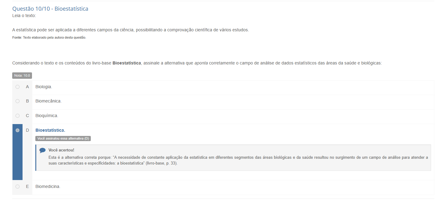 Questão 10/10 - Bioestatística A estatística pode ser aplicada a diferentes campos da ciência, possibilitando a comprovação de vários estudos. Fonte: Texto elaborado pela autora desta questão. Considerando texto e os conteúdos do livro-base assinale a alternativa que aponta corretamente campo de análise de dados estatísticos das áreas da saúde e biológicas: Nota: 10.0 A B C D Você assinalou essa alternativa (D) Você acertou! Esta é a alternativa correta porque: "A necessidade de constante aplicação da estatística em diferentes segmentos das áreas biológicas e da saúde resultou no surgimento de um campo de análise para atender a suas características e especificidades: a bioestatística" (livro-base, p. 33). E