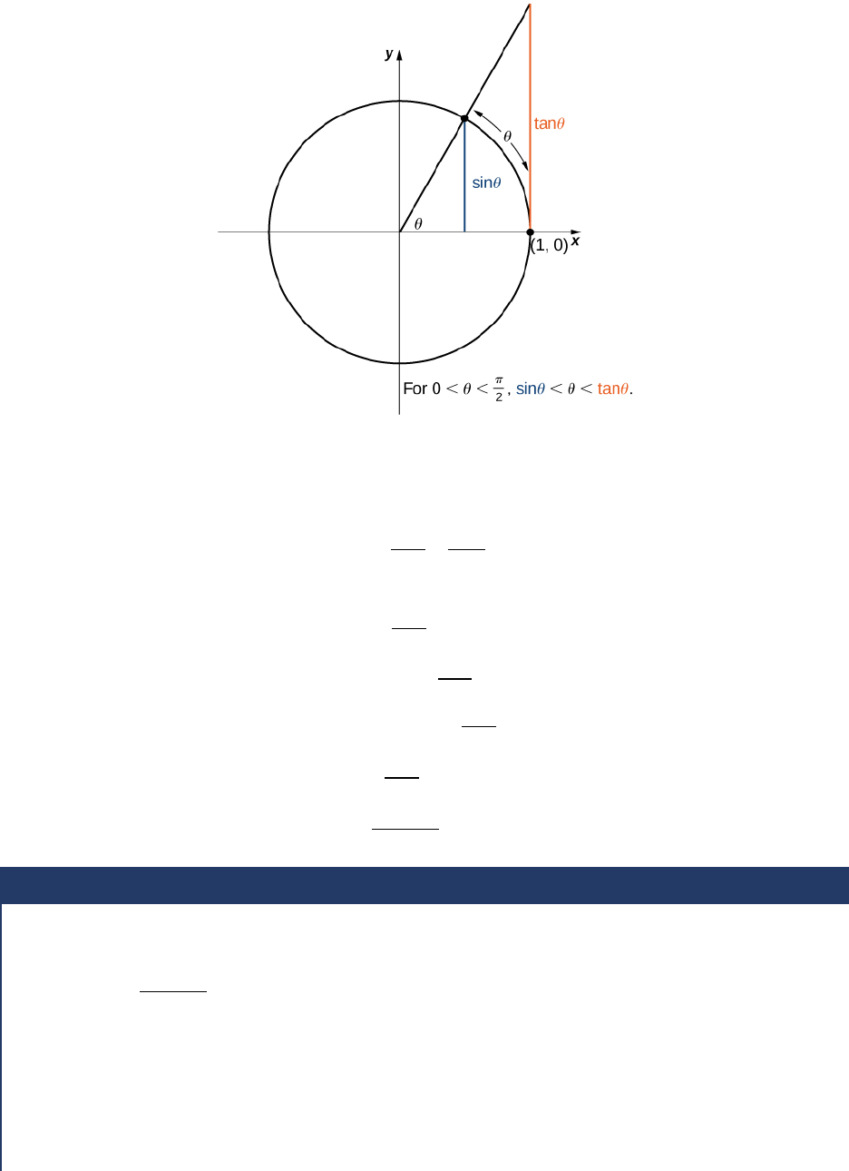 Figure 2.30 The sine and tangent functions are shown as lines on the unit circle. By dividing by sinθ in all parts of the inequality, we obtain 1 < θ sinθ < 1 cosθ . Equivalently, we have 1 > sinθ θ > cosθ. Since lim θ → 0+ 1 = 1 = lim θ → 0+ cosθ, we conclude that lim θ → 0+ sinθ θ = 1. By applying a manipulation similar to that used in demonstrating that lim θ → 0− sinθ = 0, we can show that lim θ → 0− sinθ θ = 1. Thus, (2.18)lim θ → 0 sinθ θ = 1. In Example 2.25 we use this limit to establish lim θ → 0 1 − cosθ θ = 0. This limit also proves useful in later chapters. Example 2.25 Evaluating an Important Trigonometric Limit Evaluate lim θ → 0 1 − cosθ θ . Solution In the first step, we multiply by the conjugate so that we can use a trigonometric identity to convert the cosine in the numerator to a sine: Chapter 2 | Limits 173 (2.19) 2.20 lim θ → 0 1 − cosθ θ = lim θ → 0 1 − cosθ θ · 1 + cosθ 1 + cosθ = lim θ → 0 1 − cos2 θ θ(1 + cosθ) = lim θ → 0 sin2 θ θ(1 + cosθ) = lim θ → 0 sinθ θ · sinθ 1 + cosθ = 1 · 0 2 = 0. Therefore, lim θ → 0 1 − cosθ θ = 0. Evaluate lim θ → 0 1 − cosθ sinθ . 174 Chapter 2 | Limits This OpenStax book is available for free at http://cnx.org/content/col11964/1.12 Deriving the Formula for the Area of a Circle Some of the geometric formulas we take for granted today were first derived by methods that anticipate some of the methods of calculus. The Greek mathematician Archimedes (ca. 287−212; BCE) was particularly inventive, using polygons inscribed within circles to approximate the area of the circle as the number of sides of the polygon increased. He never came up with the idea of a limit, but we can use this idea to see what his geometric constructions could have predicted about the limit. We can estimate the area of a circle by computing the area of an inscribed regular polygon. Think of the regular polygon as being made up of n triangles. By taking the limit as the vertex angle of these triangles goes to zero, you can obtain the area of the circle. To see this, carry out the following steps: 1. Express the height h and the base b of the isosceles triangle in Figure 2.31 in terms of θ and r. Figure 2.31 2. Using the expressions that you obtained in step 1, express the area of the isosceles triangle in terms of θ and r. (Substitute (1 /2)sinθ for sin(θ /2)cos(θ /2) in your expression.) 3. If an n-sided regular polygon is inscribed in a circle of radius r, find a relationship between θ and n. Solve this for n. Keep in mind there are 2π radians in a circle. (Use radians, not degrees.) 4. Find an expression for the area of the n-sided polygon in terms of r and θ. 5. To find a formula for the area of the circle, find the limit of the expression in step 4 as θ goes to zero. (Hint: lim θ → 0 (sinθ) θ = 1). The technique of estimating areas of regions by using polygons is revisited in Introduction to Integration. Chapter 2 | Limits 175 2.3 EXERCISES In the following exercises, use the limit laws to evaluate each limit. Justify each step by indicating the appropriate limit law(s). 83. lim x → 0 ⎛ ⎝4x2 − 2x + 3⎞⎠ 84. lim x → 1 x3 + 3x2 + 5 4 − 7x 85. lim x → −2 x2 − 6x + 3 86. lim x → −1 (9x + 1)2 In the following exercises, use direct substitution to evaluate each limit. 87. lim x → 7 x2 88. lim x → −2 ⎛ ⎝4x2 − 1⎞⎠ 89. lim x → 0 1 1 + sinx 90. lim x → 2 e2x − x2 91. lim x → 1 2 − 7x x + 6 92. lim x → 3 lne3x In the following exercises, use direct substitution to show that each limit leads to the indeterminate form 0/0. Then, evaluate the limit. 93. lim x → 4 x2 − 16 x − 4 94. lim x → 2 x − 2 x2 − 2x 95. lim x → 6 3x − 18 2x − 12 96. lim h → 0 (1 + h)2 − 1 h 97. lim t → 9 t − 9 t − 3 98. lim h → 0 1 a + h − 1 a h , where a is a non-zero real-valued constant 99. lim θ → π sinθ tanθ 100. lim x → 1 x3 − 1 x2 − 1 101. lim x → 1/2 2x2 + 3x − 2 2x − 1 102. lim x → −3 x + 4 − 1 x + 3 In the following exercises, use direct substitution to obtain an undefined expression. Then, use the method of Example 2.23 to simplify the function to help determine the limit. 103. lim x → −2− 2x2 + 7x − 4 x2 + x − 2 104. lim x → −2+ 2x2 + 7x − 4 x2 + x − 2 105. lim x → 1− 2x2 + 7x − 4 x2 + x − 2 106. lim x → 1+ 2x2 + 7x − 4 x2 + x − 2 In the following exercises, assume that lim x → 6 f (x) = 4, lim x → 6 g(x) = 9, and lim x → 6 h(x) = 6. Use these three facts and the limit laws to evaluate each limit. 107. lim x → 6 2 f (x)g(x) 108. lim x → 6 g(x) − 1 f (x) 109. lim x → 6 ⎛ ⎝ f (x) + 1 3g(x)⎞⎠ 110. lim x → 6 ⎛ ⎝h(x)⎞⎠3 2 111. lim x → 6 g(x) − f (x) 112. lim x → 6 x · h(x) 176 Chapter 2 | Limits This OpenStax book is available for free at http://cnx.org/content/col11964/1.12 113. lim x → 6 ⎡ ⎣(x + 1) · f (x)⎤⎦ 114. lim x → 6 ⎛ ⎝ f (x) · g(x) − h(x)⎞⎠ [T] In the following exercises, use a calculator to draw the graph of each piecewise-defined function and study the graph to evaluate the given limits. 115. f (x) = ⎧ ⎩ ⎨x 2, x ≤ 3 x + 4, x > 3 a. lim x → 3− f (x) b. lim x → 3+ f (x) 116. g(x) = ⎧ ⎩ ⎨x 3 − 1, x ≤ 0 1, x > 0 a. lim x → 0− g(x) b. lim x → 0+ g(x) 117. h(x) = ⎧ ⎩ ⎨x 2 − 2x + 1, x < 2 3 − x, x ≥ 2 a. lim x → 2− h(x) b. lim x → 2+ h(x) In the following exercises, use the following graphs and the limit laws to evaluate each limit. 118. lim x → −3+ ⎛ ⎝ f (x) + g(x)⎞⎠ 119. lim x → −3− ⎛ ⎝ f (x) − 3g(x)⎞⎠ 120. lim x → 0 f (x)g(x) 3 121. lim x → −5 2 + g(x) f (x) 122. lim x → 1 ⎛ ⎝ f (x)⎞⎠2 123. lim x → 1 f (x) − g(x)3 Chapter 2 | Limits 177