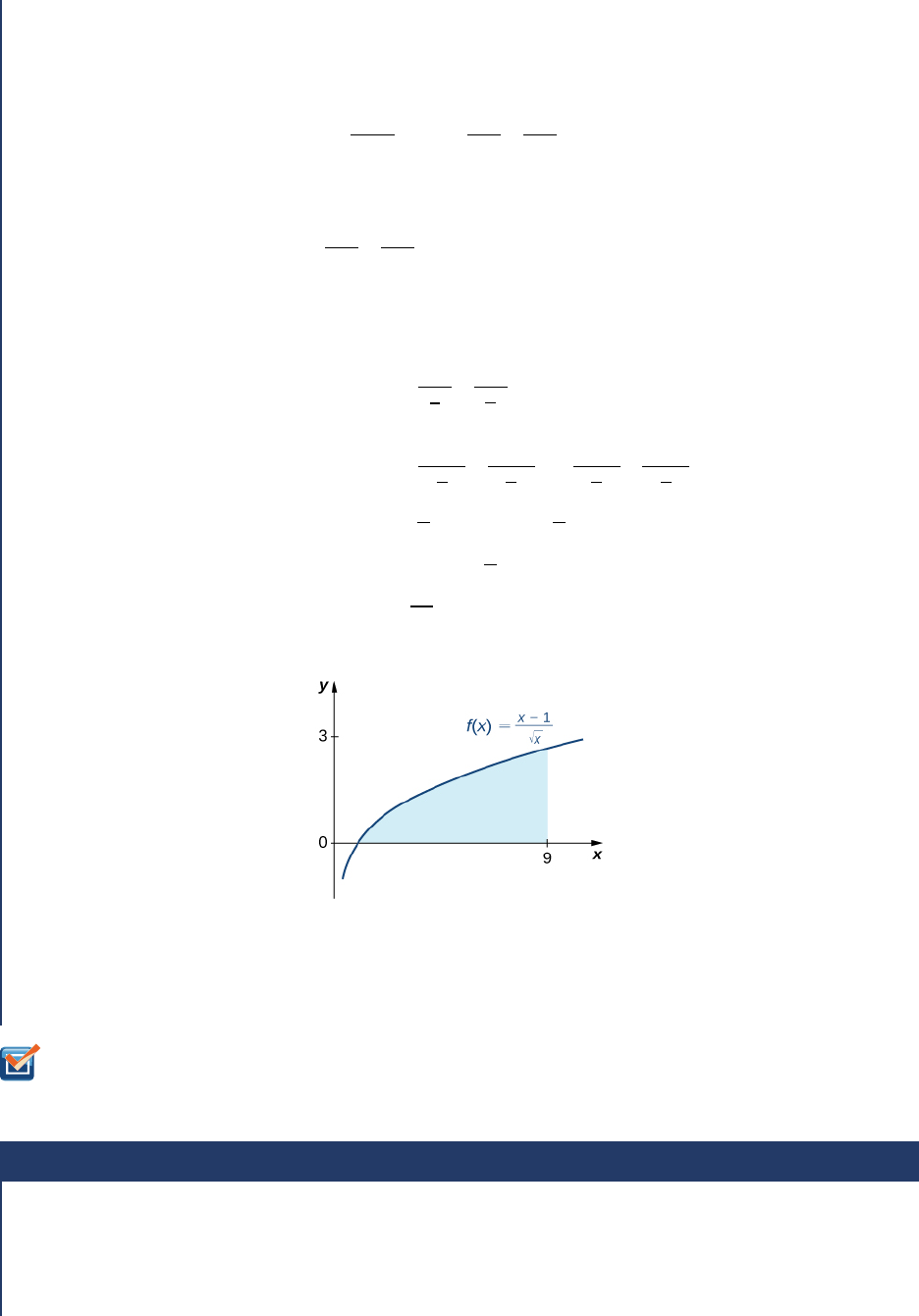 5.19 First, eliminate the radical by rewriting the integral using rational exponents. Then, separate the numerator terms by writing each one over the denominator: ⌠ ⌡1 9 x − 1 x1/2 dx = ⌠⌡1 9⎛ ⎝ x x1/2 − 1 x1/2 ⎞ ⎠dx. Use the properties of exponents to simplify: ⌠ ⌡1 9⎛ ⎝ x x1/2 − 1 x1/2 ⎞ ⎠dx = ∫ 1 9⎛ ⎝x1/2 − x−1/2⎞⎠dx. Now, integrate using the power rule: ∫ 1 9⎛ ⎝x1/2 − x−1/2⎞⎠dx = ⎛ ⎝ ⎜x3/2 3 2 − x1/2 1 2 ⎞ ⎠ ⎟|19 = ⎡ ⎣ ⎢(9)3/2 3 2 − (9)1/2 1 2 ⎤ ⎦ ⎥− ⎡ ⎣ ⎢(1)3/2 3 2 − (1)1/2 1 2 ⎤ ⎦ ⎥ = ⎡⎣23(27) − 2(3)⎤⎦− ⎡ ⎣23(1) − 2(1)⎤⎦ = 18 − 6 − 2 3 + 2 = 40 3 . See Figure 5.29. Figure 5.29 The area under the curve from x = 1 to x = 9 can be calculated by evaluating a definite integral. Use The Fundamental Theorem of Calculus, Part 2 to evaluate ∫ 1 2 x−4dx. Example 5.22 A Roller-Skating Race James and Kathy are racing on roller skates. They race along a long, straight track, and whoever has gone the 558 Chapter 5 | Integration This OpenStax book is available for free at http://cnx.org/content/col11964/1.12 5.20 farthest after 5 sec wins a prize. If James can skate at a velocity of f (t) = 5 + 2t ft/sec and Kathy can skate at a velocity of g(t) = 10 + cos⎛⎝π2 t ⎞ ⎠ ft/sec, who is going to win the race? Solution We need to integrate both functions over the interval ⎡⎣0, 5⎤⎦ and see which value is bigger. For James, we want to calculate ∫ 0 5 (5 + 2t)dt. Using the power rule, we have ∫ 0 5 (5 + 2t)dt = ⎛⎝5t + t2⎞⎠|05 = (25 + 25) = 50. Thus, James has skated 50 ft after 5 sec. Turning now to Kathy, we want to calculate ∫ 0 5 10 + cos⎛⎝π2 t ⎞ ⎠dt. We know sin t is an antiderivative of cos t, so it is reasonable to expect that an antiderivative of cos⎛⎝π2 t ⎞ ⎠ would involve sin⎛⎝π2 t ⎞ ⎠. However, when we differentiate sin⎛⎝π2 t ⎞ ⎠, we get π 2cos⎛⎝π2 t ⎞ ⎠ as a result of the chain rule, so we have to account for this additional coefficient when we integrate. We obtain ∫ 0 5 10 + cos⎛⎝π2 t ⎞ ⎠dt = ⎛⎝10t + 2 πsin⎛⎝π2 t ⎞ ⎠ ⎞ ⎠|05 = ⎛⎝50 + 2 π ⎞ ⎠− ⎛ ⎝0 − 2 πsin0⎞⎠ ≈ 50.6. Kathy has skated approximately 50.6 ft after 5 sec. Kathy wins, but not by much! Suppose James and Kathy have a rematch, but this time the official stops the contest after only 3 sec. Does this change the outcome? Chapter 5 | Integration 559 A Parachutist in Free Fall Figure 5.30 Skydivers can adjust the velocity of their dive by changing the position of their body during the free fall. (credit: Jeremy T. Lock) Julie is an avid skydiver. She has more than 300 jumps under her belt and has mastered the art of making adjustments to her body position in the air to control how fast she falls. If she arches her back and points her belly toward the ground, she reaches a terminal velocity of approximately 120 mph (176 ft/sec). If, instead, she orients her body with her head straight down, she falls faster, reaching a terminal velocity of 150 mph (220 ft/sec). Since Julie will be moving (falling) in a downward direction, we assume the downward direction is positive to simplify our calculations. Julie executes her jumps from an altitude of 12,500 ft. After she exits the aircraft, she immediately starts falling at a velocity given by v(t) = 32t. She continues to accelerate according to this velocity function until she reaches terminal velocity. After she reaches terminal velocity, her speed remains constant until she pulls her ripcord and slows down to land. On her first jump of the day, Julie orients herself in the slower “belly down” position (terminal velocity is 176 ft/sec). Using this information, answer the following questions. 1. How long after she exits the aircraft does Julie reach terminal velocity? 2. Based on your answer to question 1, set up an expression involving one or more integrals that represents the distance Julie falls after 30 sec. 3. If Julie pulls her ripcord at an altitude of 3000 ft, how long does she spend in a free fall? 4. Julie pulls her ripcord at 3000 ft. It takes 5 sec for her parachute to open completely and for her to slow down, during which time she falls another 400 ft. After her canopy is fully open, her speed is reduced to 16 ft/sec. Find the total time Julie spends in the air, from the time she leaves the airplane until the time her feet touch the ground. 560 Chapter 5 | Integration This OpenStax book is available for free at http://cnx.org/content/col11964/1.12 On Julie’s second jump of the day, she decides she wants to fall a little faster and orients herself in the “head down” position. Her terminal velocity in this position is 220 ft/sec. Answer these questions based on this velocity: 5. How long does it take Julie to reach terminal velocity in this case? 6. Before pulling her ripcord, Julie reorients her body in the “belly down” position so she is not moving quite as fast when her parachute opens. If she begins this maneuver at an altitude of 4000 ft, how long does she spend in a free fall before beginning the reorientation? Some jumpers wear “ wingsuits” (see Figure 5.31). These suits have fabric panels between the arms and legs and allow the wearer to glide around in a free fall, much like a flying squirrel. (Indeed, the suits are sometimes called “flying squirrel suits.”) When wearing these suits, terminal velocity can be reduced to about 30 mph (44 ft/sec), allowing the wearers a much longer time in the air. Wingsuit flyers still use parachutes to land; although the vertical velocities are within the margin of safety, horizontal velocities can exceed 70 mph, much too fast to land safely. Figure 5.31 The fabric panels on the arms and legs of a wingsuit work to reduce the vertical velocity of a skydiver’s fall. (credit: Richard Schneider) Answer the following question based on the velocity in a wingsuit. 7. If Ju