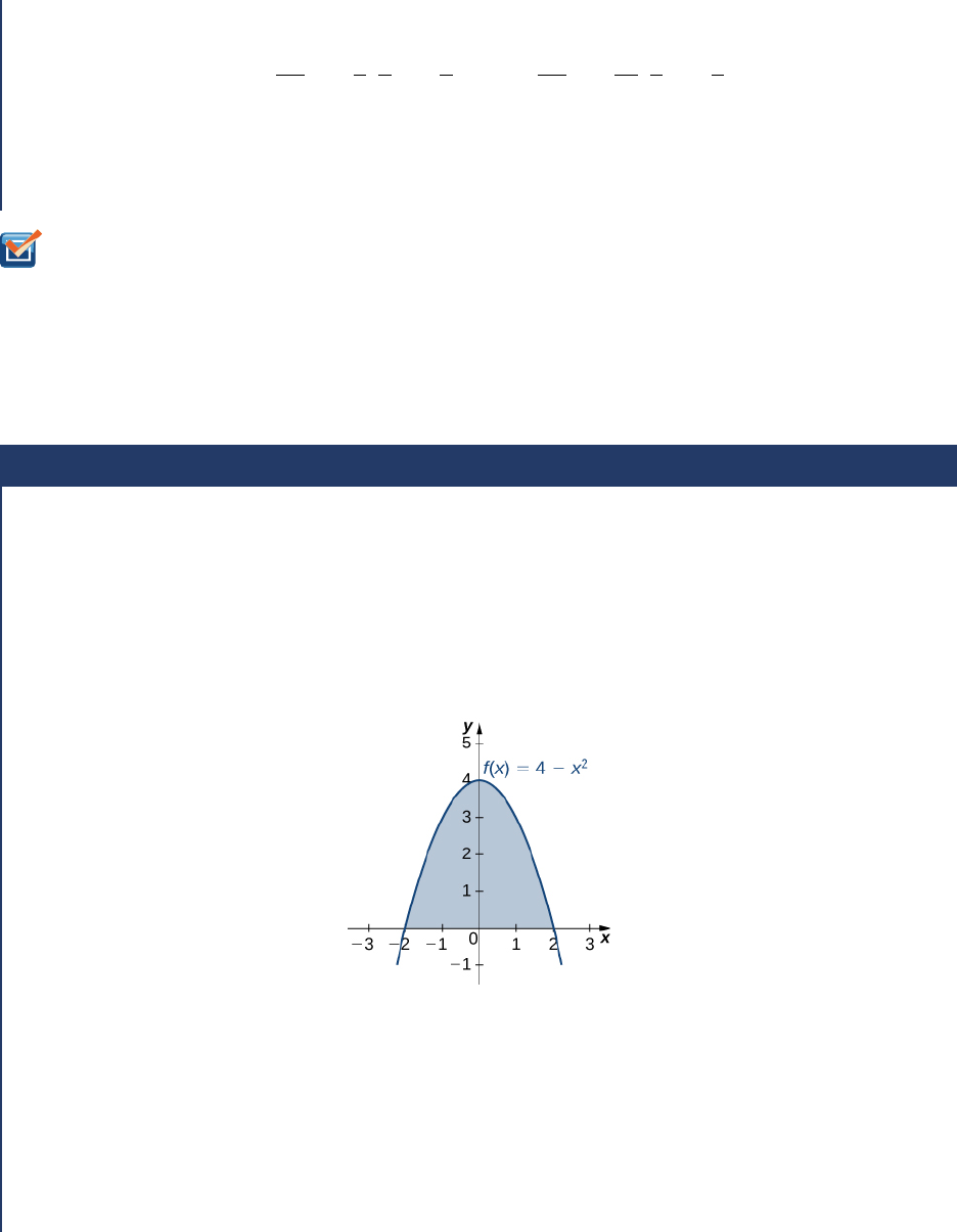 6.32 x– = My m = − 9 4 · 2 9 = − 1 2 and y– = Mx m = − 27 10 · 2 9 = − 3 5. The centroid of the region is ⎛ ⎝−(1/2), −(3/5)⎞⎠. Let R be the region bounded above by the graph of the function f (x) = 6 − x2 and below by the graph of the function g(x) = 3 − 2x. Find the centroid of the region. The Symmetry Principle We stated the symmetry principle earlier, when we were looking at the centroid of a rectangle. The symmetry principle can be a great help when finding centroids of regions that are symmetric. Consider the following example. Example 6.33 Finding the Centroid of a Symmetric Region Let R be the region bounded above by the graph of the function f (x) = 4 − x2 and below by the x-axis. Find the centroid of the region. Solution The region is depicted in the following figure. Figure 6.71 We can use the symmetry principle to help find the centroid of a symmetric region. The region is symmetric with respect to the y-axis. Therefore, the x-coordinate of the centroid is zero. We need only calculate y– . Once again, for the sake of convenience, assume ρ = 1. First, we calculate the total mass: Chapter 6 | Applications of Integration 713 6.33 m = ρ∫ a b f (x)dx = ∫ −2 2 ⎛ ⎝4 − x2⎞⎠dx = ⎡⎣4x − x3 3 ⎤ ⎦ |−2 2 = 32 3 . Next, we calculate the moments. We only need Mx : Mx = ρ∫ a b ⎡ ⎣ f (x)⎤⎦2 2 dx = 1 2∫ −2 2 ⎡ ⎣4 − x2⎤⎦ 2 dx = 1 2∫ −2 2 ⎛ ⎝16 − 8x2 + x4⎞⎠dx = 1 2 ⎡ ⎣x 5 5 − 8x3 3 + 16x⎤⎦ |−2 2 = 256 15 . Then we have y– = Mx m = 256 15 · 3 32 = 8 5. The centroid of the region is (0, 8/5). Let R be the region bounded above by the graph of the function f (x) = 1 − x2 and below by x-axis. Find the centroid of the region. 714 Chapter 6 | Applications of Integration This OpenStax book is available for free at http://cnx.org/content/col11964/1.12 The Grand Canyon Skywalk The Grand Canyon Skywalk opened to the public on March 28, 2007. This engineering marvel is a horseshoe-shaped observation platform suspended 4000 ft above the Colorado River on the West Rim of the Grand Canyon. Its crystal- clear glass floor allows stunning views of the canyon below (see the following figure). Figure 6.72 The Grand Canyon Skywalk offers magnificent views of the canyon. (credit: 10da_ralta, Wikimedia Commons) The Skywalk is a cantilever design, meaning that the observation platform extends over the rim of the canyon, with no visible means of support below it. Despite the lack of visible support posts or struts, cantilever structures are engineered to be very stable and the Skywalk is no exception. The observation platform is attached firmly to support posts that extend 46 ft down into bedrock. The structure was built to withstand 100-mph winds and an 8.0-magnitude earthquake within 50 mi, and is capable of supporting more than 70,000,000 lb. One factor affecting the stability of the Skywalk is the center of gravity of the structure. We are going to calculate the center of gravity of the Skywalk, and examine how the center of gravity changes when tourists walk out onto the observation platform. The observation platform is U-shaped. The legs of the U are 10 ft wide and begin on land, under the visitors’ center, 48 ft from the edge of the canyon. The platform extends 70 ft over the edge of the canyon. To calculate the center of mass of the structure, we treat it as a lamina and use a two-dimensional region in the xy-plane to represent the platform. We begin by dividing the region into three subregions so we can consider each subregion Chapter 6 | Applications of Integration 715 separately. The first region, denoted R1, consists of the curved part of the U. We model R1 as a semicircular annulus, with inner radius 25 ft and outer radius 35 ft, centered at the origin (see the following figure). Figure 6.73 We model the Skywalk with three sub-regions. The legs of the platform, extending 35 ft between R1 and the canyon wall, comprise the second sub-region, R2. Last, the ends of the legs, which extend 48 ft under the visitor center, comprise the third sub-region, R3. Assume the density of the lamina is constant and assume the total weight of the platform is 1,200,000 lb (not including the weight of the visitor center; we will consider that later). Use g = 32 ft/sec2. 1. Compute the area of each of the three sub-regions. Note that the areas of regions R2 and R3 should include the areas of the legs only, not the open space between them. Round answers to the nearest square foot. 2. Determine the mass associated with each of the three sub-regions. 3. Calculate the center of mass of each of the three sub-regions. 4. Now, treat each of the three sub-regions as a point mass located at the center of mass of the corresponding sub-region. Using this representation, calculate the center of mass of the entire platform. 5. Assume the visitor center weighs 2,200,000 lb, with a center of mass corresponding to the center of mass of R3. Treating the visitor center as a point mass, recalculate the center of mass of the system. How does the center of mass change? 6. Although the Skywalk was built to limit the number of people on the observation platform to 120, the platform is capable of supporting up to 800 people weighing 200 lb each. If all 800 people were allowed on the platform, and all of them went to the farthest end of the platform, how would the center of gravity of the system be affected? (Include the visitor center in the calculations and represent the people by a point mass located at the farthest edge of the platform, 70 ft from the canyon wall.) Theorem of Pappus This section ends with a discussion of the theorem of Pappus for volume, which allows us to find the volume of particular 716 Chapter 6 | Applications of Integration This OpenStax book is available for free at http://cnx.org/content/col11964/1.12 kinds of solids by using the centroid. (There is also a theorem of Pappus for surface area, but it is much 