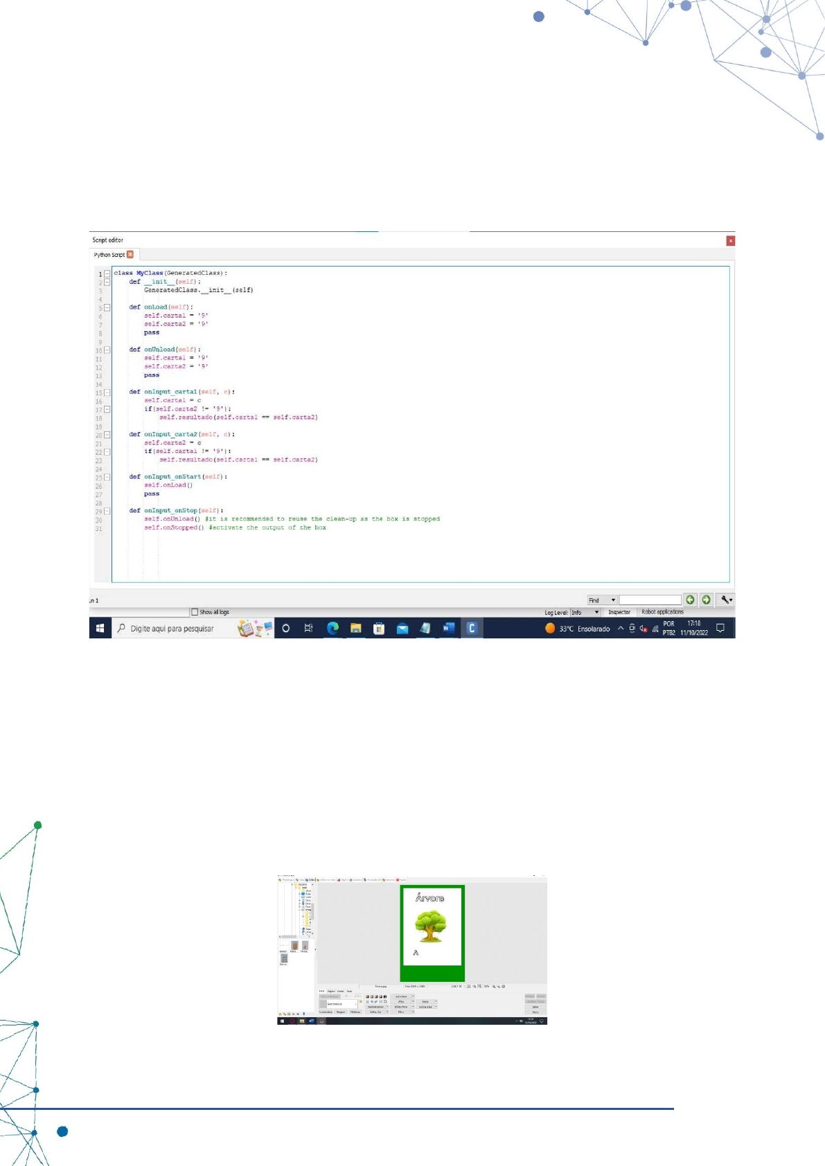 49 2nd AMAZON STEM ACADEMY CONFERENCE Aplicações de programas com inteligência artificial e tecnologia robô humanoide NAO com estudantes da Escola Municipal de Manaus para o desenvolvimento de programas mais complexos, como foi preciso para a comparação e identificação das cartas e, consequentemente, chegar nos resultados, conforme figura 1 a seguir. Figura 1. Código bloco em Python Para a criação do jogo de memória foram utilizadas figuras ilustrativas, letras do alfabeto, sílabas e vogais, formando palavras e desenhos de fácil interpretação, conforme a figura 2. Para a confecção das cartas, foi utilizado o Photoscape, um programa de edição de fotografias. Figura 2. Confecção de uma das cartas para o jogo da memória novo.