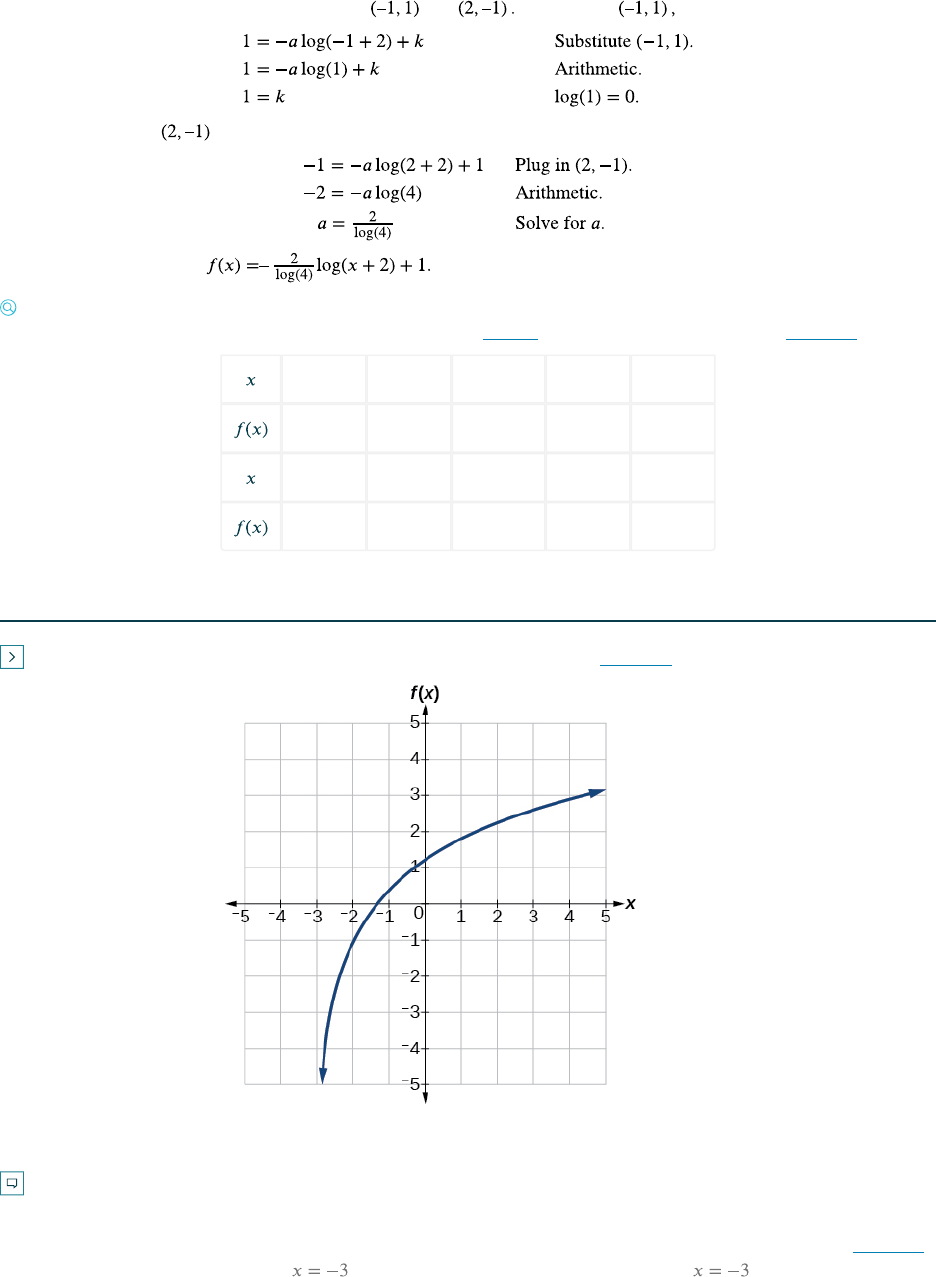 It appears the graph passes through the points and Substituting Next, substituting in , This gives us the equation Analysis We can verify this answer by comparing the function values in Table 5 with the points on the graph in Figure 15. −1 0 1 2 3 1 0 −0.58496 −1 −1.3219 4 5 6 7 8 −1.5850 −1.8074 −2 −2.1699 −2.3219 Table 5 TRY IT #11 Give the equation of the natural logarithm graphed in Figure 16. Figure 16 Q&A Is it possible to tell the domain and range and describe the end behavior of a function just by looking at the graph? Yes, if we know the function is a general logarithmic function. For example, look at the graph in Figure 16. The graph approaches (or thereabouts) more and more closely, so is, or is very close to, the vertical asymptote. It approaches from the right, so the domain is all points to the right, 6.4 • Graphs of Logarithmic Functions 601 The range, as with all general logarithmic functions, is all real numbers. And we can see the end behavior because the graph goes down as it goes left and up as it goes right. The end behavior is that as ∞ and as ∞ ∞ MEDIA Access these online resources for additional instruction and practice with graphing logarithms. Graph an Exponential Function and Logarithmic Function (http://openstax.org/l/graphexplog) Match Graphs with Exponential and Logarithmic Functions (http://openstax.org/l/matchexplog) Find the Domain of Logarithmic Functions (http://openstax.org/l/domainlog) 6.4 SECTION EXERCISES Verbal 1. The inverse of every logarithmic function is an exponential function and vice-versa. What does this tell us about the relationship between the coordinates of the points on the graphs of each? 2. What type(s) of translation(s), if any, affect the range of a logarithmic function? 3. What type(s) of translation(s), if any, affect the domain of a logarithmic function? 4. Consider the general logarithmic function Why can’t be zero? 5. Does the graph of a general logarithmic function have a horizontal asymptote? Explain. Algebraic For the following exercises, state the domain and range of the function. 6. 7. 8. 9. 10. For the following exercises, state the domain and the vertical asymptote of the function. 11. 12. 13. 14. 15. For the following exercises, state the domain, vertical asymptote, and end behavior of the function. 16. 17. 18. 19. 20. 602 6 • Exponential and Logarithmic Functions Access for free at openstax.org For the following exercises, state the domain, range, and x- and y-intercepts, if they exist. If they do not exist, write DNE. 21. 22. 23. 24. 25. Graphical For the following exercises, match each function in Figure 17 with the letter corresponding to its graph. Figure 17 26. 27. 28. 29. 30. For the following exercises, match each function in Figure 18 with the letter corresponding to its graph. Figure 18 6.4 • Graphs of Logarithmic Functions 603 31. 32. 33. For the following exercises, sketch the graphs of each pair of functions on the same axis. 34. and 35. and 36. and 37. and For the following exercises, match each function in Figure 19 with the letter corresponding to its graph. Figure 19 38. 39. 40. For the following exercises, sketch the graph of the indicated function. 41. 42. 43. 44. 45. 46. 604 6 • Exponential and Logarithmic Functions Access for free at openstax.org For the following exercises, write a logarithmic equation corresponding to the graph shown. 47. Use as the parent function. 48. Use as the parent function. 49. Use as the parent function. 50. Use as the parent function. Technology For the following exercises, use a graphing calculator to find approximate solutions to each equation. 51. 52. 53. 54. 55. Extensions 56. Let be any positive real number such that What must be equal to? Verify the result. 57. Explore and discuss the graphs of and Make a conjecture based on the result. 58. Prove the conjecture made in the previous exercise. 6.4 • Graphs of Logarithmic Functions 605