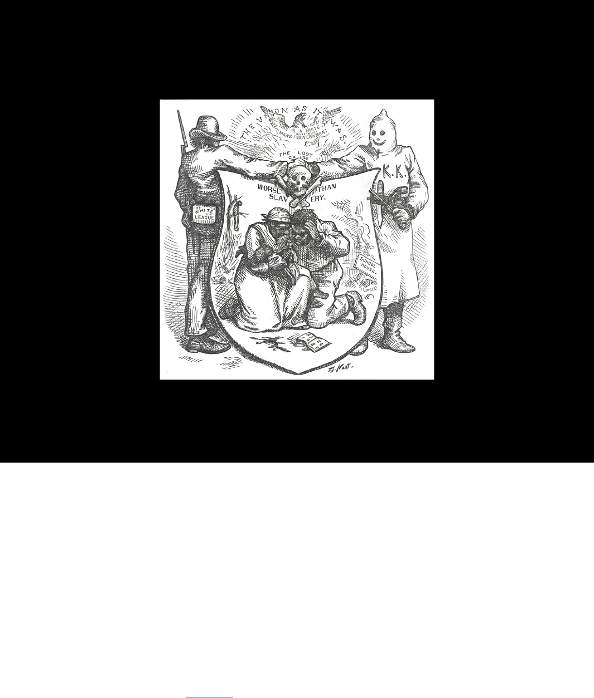 FIGURE 16.1 In this political cartoon by Thomas Nast, which appeared in Harper’s Weekly in October 1874, the “White League” shakes hands with the Ku Klux Klan over a shield that shows a couple weeping over a baby. In the background, a schoolhouse burns, and a lynched freedman is shown hanging from a tree. Above the shield, which is labeled “Worse than Slavery,” the text reads, “The Union as It Was: This Is a White Man’s Government.” INTRODUCTION CHAPTER OUTLINE 16.1 Restoring the Union 16.2 Congress and the Remaking of the South, 1865–1866 16.3 Radical Reconstruction, 1867–1872 16.4 The Collapse of Reconstruction Few times in U.S. history have been as turbulent and transformative as the Civil War and the twelve years that followed. Between 1865 and 1877, one president was murdered and another impeached. The Constitution underwent major revision with the addition of three amendments. The effort to impose Union control and create equality in the defeated South ignited a fierce backlash as various terrorist and vigilante organizations, most notably the Ku Klux Klan, battled to maintain a pre–Civil War society in which White people held complete power. These groups unleashed a wave of violence, including lynching and arson, aimed at freed Black people and their White supporters. Historians refer to this era as Reconstruction, when an effort to remake the South faltered and ultimately failed. The above political cartoon (Figure 16.1) expresses the anguish many Americans felt in the decade after the 16The Era of Reconstruction, 1865–1877 Civil War. The South, which had experienced catastrophic losses during the conflict, was reduced to political dependence and economic destitution. This humiliating condition led many southern White people to vigorously contest Union efforts to transform the South’s racial, economic, and social landscape. Supporters of equality grew increasingly dismayed at Reconstruction’s failure to undo the old system, which further compounded the staggering regional and racial inequalities in the United States. 16.1 Restoring the Union LEARNING OBJECTIVES By the end of this section, you will be able to: • Describe Lincoln’s plan to restore the Union at the end of the Civil War • Discuss the tenets of Radical Republicanism • Analyze the success or failure of the Thirteenth Amendment FIGURE 16.2 The end of the Civil War saw the beginning of the Reconstruction era, when former rebel Southern states were integrated back into the Union. President Lincoln moved quickly to achieve the war’s ultimate goal: reunification of the country. He proposed a generous and non-punitive plan to return the former Confederate states speedily to the United States, but some Republicans in Congress protested, considering the president’s plan too lenient to the rebel states that had torn the country apart. The greatest flaw of Lincoln’s plan, according to this view, was that it appeared to forgive traitors instead of guaranteeing civil rights to formerly enslaved people. President Lincoln oversaw the passage of the Thirteenth Amendment abolishing slavery, but he did not live to see its ratification. THE PRESIDENT’S PLAN From the outset of the rebellion in 1861, Lincoln’s overriding goal had been to bring the Southern states quickly back into the fold in order to restore the Union (Figure 16.3). In early December 1863, the president began the process of reunification by unveiling a three-part proposal known as the ten percent plan that outlined how the states would return. The ten percent plan gave a general pardon to all Southerners except high-ranking Confederate government and military leaders; required 10 percent of the 1860 voting population in the former rebel states to take a binding oath of future allegiance to the United States and the emancipation of the enslaved; and declared that once those voters took those oaths, the restored Confederate states would draft new state constitutions. 408 16 • The Era of Reconstruction, 1865–1877 Access for free at openstax.org. FIGURE 16.3 Thomas Le Mere took this albumen silver print (a) of Abraham Lincoln in April 1863. Le Mere thought a standing pose of Lincoln would be popular. In this political cartoon from 1865 (b), Lincoln and his vice president, Andrew Johnson, endeavor to sew together the torn pieces of the Union. Lincoln hoped that the leniency of the plan—90 percent of the 1860 voters did not have to swear allegiance to the Union or to emancipation—would bring about a quick and long-anticipated resolution and make emancipation more acceptable everywhere. This approach appealed to some in the moderate wing of the Republican Party, which wanted to put the nation on a speedy course toward reconciliation. However, the proposal instantly drew fire from a larger faction of Republicans in Congress who did not want to deal moderately with the South. These members of Congress, known as Radical Republicans, wanted to remake the South and punish the rebels. Radical Republicans insisted on harsh terms for the defeated Confederacy and protection for formerly enslaved people, going far beyond what the president proposed. In February 1864, two of the Radical Republicans, Ohio senator Benjamin Wade and Maryland representative Henry Winter Davis, answered Lincoln with a proposal of their own. Among other stipulations, the Wade-Davis Bill called for a majority of voters and government officials in Confederate states to take an oath, called the Ironclad Oath, swearing that they had never supported the Confederacy or made war against the United States. Those who could not or would not take the oath would be unable to take part in the future political life of the South. Congress assented to the Wade-Davis Bill, and it went to Lincoln for his signature. The president refused to sign, using the pocket veto (that is, taking no action) to kill the bill. Lincoln understood that no Southern state would have met the cri