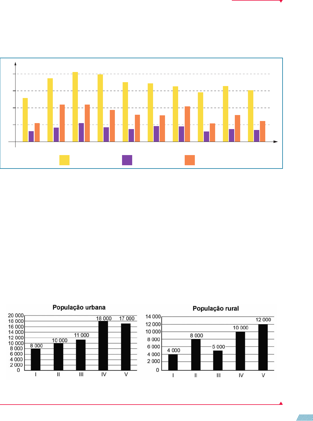 W Y M D e s ig n /A rq u iv o d a e d it o ra Não escreva no livro. 23. O ano de 2019 registrou queda no número de acidentes envolvendo helicópteros no Brasil. A redução chegou a qua- se metade dos casos, em comparação com o ano anterior. As principais causas apontadas como responsáveis pelos acidentes ocorridos em 2019 foram perda de controle em voo, colisão com obstáculo e pouso brusco. O gráfico a seguir apresenta um levantamento estatístico sobre acidentes aéreos no Brasil de 2010 a 2019. Ele mostra o número de acidentes, o número de acidentes fatais, isto é, acidentes em que houve mortos e o número de fatalidades, ou seja, de mortes ocasionadas por acidentes aéreos. Panorama dos acidentes aéreos no Brasil (2010-2019) 200 0 Ano Quantidade de ocorr•ncias FatalidadesAcidentes fataisAcidentes 50 129 187 206 199 175 172 163 146 166 152 61 35 80 54 30 104 45 78 46 80 94 110110 55 31 42 55 43 37 38 100 150 2010 2011 2012 2013 2014 2015 2016 2017 2018 2019 Fonte de consulta: Centro de Investigações e Prevenção de Acidentes Aeronáuticos. PAINEL SIPAER. Disponível em: http://painelsipaer.cenipa. aer.mil.br/QvAJAXZfc/opendoc.htm?document=SIGAER%2Fgia%2Fqvw%2Fpainel_sipaer.qvw&host=QVS%40cirros31-37&anonymous=true. Acesso em: 19 jun. 2020. Observando o gráfico, responda às seguintes questões: a) Quantos acidentes ocorreram no período? 1 695 b) Analisando o total de acidentes ocorridos em 2012 em relação ao total de acidentes ocorridos em 2019, qual foi o decréscimo percentual? Aproximadamente 26%. c) Em quais anos o número de fatalidades foi superior a 90? 2011, 2012, 2013 e 2016. d) Em qual ano ocorreu o menor número de acidentes fatais? 2017 e) Em qual ano foi registrada a maior diferença entre o total de acidentes e o número de acidentes fatais? f) Em comparação com a média de 2010 a 2018, em quantos por cento o número de acidentes fatais diminuiu em 2019? E o número de fatalidades? 2013 Aproximadamente 15%. Aproximadamente 28%. 24. (Enem) A taxa de urbanização de um município é dada pela razão entre a população urbana e a população total do município (isto é, a soma das populações rural e urbana). Os gráficos apresentam, respectivamente, a população ur- bana e a população rural de cinco municípios (I, II, III, IV, V) de uma mesma região estadual. Em reunião entre o go- verno do estado e os prefeitos desses municípios, ficou acordado que o município com maior taxa de urbanização receberá um investimento extra em infraestrutura. Segundo o acordo, qual município receberá o investimento extra? a) I b) II c) III d) IV e) V Alternativa c. R e p ro d u ç ã o /E n e m , 2 0 1 9 . 31 008a031_V6_MATEMATICA_Dante_g21At_Cap1_LA.indd 31008a031_V6_MATEMATICA_Dante_g21At_Cap1_LA.indd 31 18/09/2020 10:3718/09/2020 10:37 Gráfico de setores Em uma exposição, o número de visitantes foi de 3 500 no primeiro dia, 1 400 no segundo dia e 2 100 no terceiro dia. Veja como podemos representar esses dados em uma tabela de frequências e em um gráfico de setores. Número de visitantes nos primeiros três dias de exposição Dia FA FR 1 o dia 3 500 50% 2 o dia 1 400 20% 3 o dia 2 100 30% Total 7 000 100% Tabela elaborada para fins didáticos. No gráfico de setores, o círculo todo representa o total (100%), e os setores indicam a frequência corres- pondente aos valores da variável. Na construção do gráfico de setores, determina-se o ângulo correspondente a cada setor proporcional- mente à frequência do valor da variável. Veja a seguir como podemos determinar a medida de abertura do ângulo do setor correspondente à frequência do 2o dia. • Usando a frequência absoluta e aplicando a regra de três simples, temos: 5 ° x1400 7 000 360 ~ 7 000x 5 504 000° ~ x 5 72° • Usando a frequência relativa, em porcentagem, temos: x é 20% de 360°, assim, x 5 0,20 ? 360° 5 72° Observe a seguir outro exemplo de gráfico de setores, que mostra a porcentagem de internações de crianças de 0 a 14 anos por tipo de acidente. 50% 30% 20% 1o dia 2o dia 3o dia Gráfico elaborado para fins didáticos. Número de visitantes nos primeiros três dias de exposição W Y M D e s ig n /A rq u iv o d a e d it o ra 0,40% 18,50% 46,10% 3,10% 21,70% 9,90% Trânsito Queda Sufocação Queimadura Intoxicação Outros Fonte de consulta: CRIANÇA SEGURA BRASIL. Acidentes em números. Disponível em: https://criancasegura.org.br/dados-de-acidentes/. Acesso em: 19 jun. 2020. Internações de crianças de 0 a 14 anos por acidentes (2018) W Y M D e s ig n /A rq u iv o d a e d it o ra 32 032a058_V6_MATEMATICA_Dante_g21At_Cap1_LA.indd 32032a058_V6_MATEMATICA_Dante_g21At_Cap1_LA.indd 32 18/09/2020 10:3818/09/2020 10:38