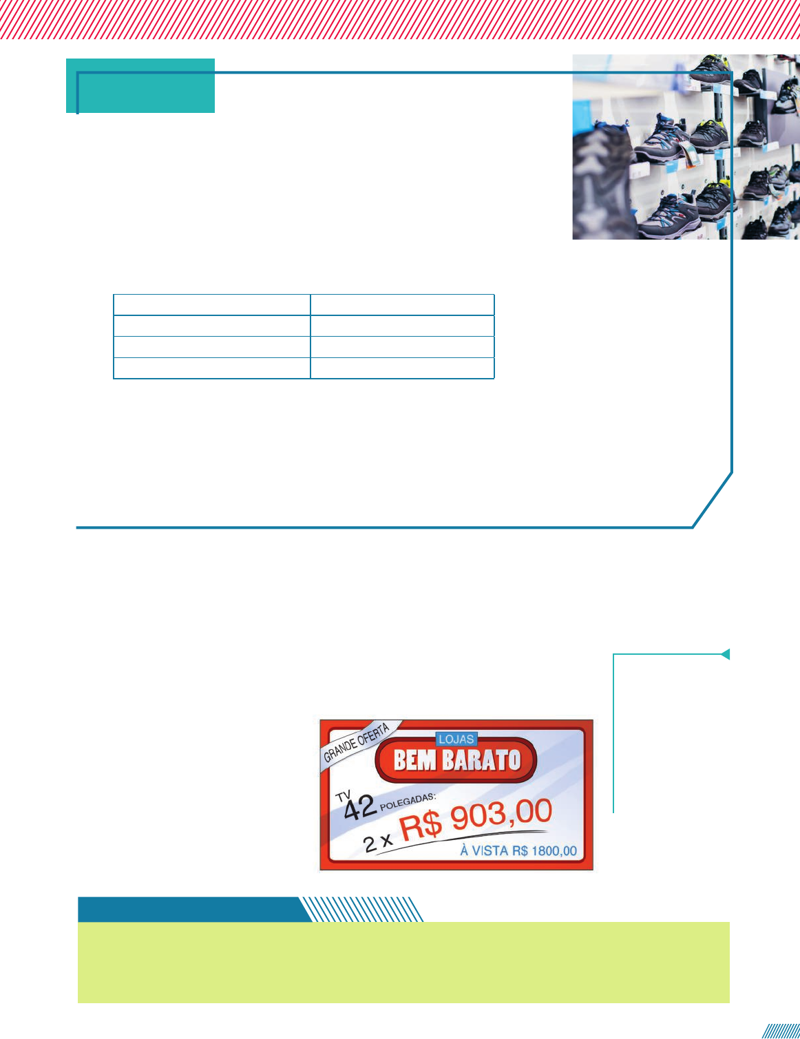 Compra à vista ou a prazo? Certamente você já ouviu falar em compras com pagamento à vista ou a prazo, sem juros ou com juros. Essas são formas de pagamento oferecidas em muitos estabelecimentos, entre as quais o cliente pode escolher a que atende melhor às suas necessidades. E o que diferencia essas formas de pagamento? O valor final que será pago pelo cliente. Imagine que você está comprando um tênis que custa R$ 120,00 e precisa escolher uma das formas de pagamento indicadas no quadro abaixo. À vista (desconto de 5%) R$ 114,00 em 2 vezes 2 3 de R$ 60,00 em 3 vezes 3 3 de R$ 42,00 em 4 vezes 4 3 de R$ 33,00 a) Considerando que você tem o dinheiro para comprar à vista, qual dessas formas de pagamento você escolheria? Por quê? b) Agora, compare os valores finais da compra nas opções a prazo com o valor à vista. O que você percebeu? Você mudaria a forma de pagamento escolhida? c) Na opção de parcelamento em 4 3 de R$ 33,00, quantos reais são cobrados de acréscimo? Qual o nome desse acréscimo? Resposta pessoal. São cobrados R$ 12,00. São chamados de juros. Situação 3 Segundo o Serviço de Proteção ao Crédito (SPC), 79% dos consumidores brasileiros costumam parcelar as compras. b) Espera-se que os estudantes percebam que, nas opções parceladas em 3 ou 4 vezes, o valor final pago será maior que o valor inicial do produto. Resposta pessoal. Explorando a porcentagem A porcentagem é utilizada em diversos contextos, principalmente de ordem finan- ceira, como no cálculo do valor de prestações, no pagamento de impostos, no rendi- mento de poupança, etc. Considere, por exemplo, uma pessoa pretende fazer uma compra no valor de R$ 1.800,00 usando o dinheiro que está aplicado em um fundo de investimento que rende 1% líquido ao mês. Ela quer saber, do ponto de vista financeiro, qual destas opções de pagamento é a mais vantajosa: • pagar à vista; ou • pagar em duas prestações iguais de R$ 903,00, uma delas como entrada e a segunda depois de um mês. O rendimento de 1% líquido significa que, depois de descontar impostos, taxas e encargos, o valor disponível ao investidor para resgate será o valor investido mais 1% deste valor. Fique atento Il u s tr a C a rt o o n /A rq u iv o d a e d it o ra 1. Considere a situação apresentada e calcule quantos reais o dinheiro dessa pessoa vai render, caso ela escolha pagar em duas prestações e só retire o valor da segunda prestação do fundo de investimento quando for realizar o pagamento. 2. Qual dessas opções de pagamento, do ponto de vista financeiro, é a mais vantajosa para essa pessoa? Justifique. Pagamento em duas prestações, pois pagando à vista a pessoa economizará apenas R$ 6,00 e pagando em duas prestações vai obter R$ 9,03 de juros com a aplicação no fundo de investimento. Explore para descobrir Não escreva no livro. R$ 9,03 siamionau pavel/Shutterstock 91 086a108_V6_MATEMATICA_Dante_g21At_Cap2_LA.indd 91086a108_V6_MATEMATICA_Dante_g21At_Cap2_LA.indd 91 18/09/2020 10:4518/09/2020 10:45 No Ensino Fundamental estudamos que a porcentagem é uma forma usada para indicar uma fração de denominador 100 ou qualquer representação equivalente a ela. Veja os exemplos: a) 50% é o mesmo que 50 100 ou 1 2 ou 0,5. b) 75% é o mesmo que 75 100 ou 3 4 ou 0,75. c) 25% é o mesmo que 25 100 ou 1 4 ou 0,25. d) 5% é o mesmo que 5 100 ou 1 20 ou 0,05. Para as atividades deste capítulo, caso você e o professor julguem necessário, faça o uso de tecnologias digitais, como planilhas eletrônicas e calculadoras. Fique atento Quais números inteiros são equivalentes a, respectivamente, 100%, 200% e 300%? Reflita Respectivamente 1; 2 e 3. 1. (Uncisal) Ao publicar um artigo científico, um pesquisador recebeu um bônus de 15% sobre o seu salário. Se sobre o seu salário não incide nenhum desconto, não houve nenhuma outra bonificação e o bônus foi de R$ 975,00, qual a remuneração do pesquisador no mês em que recebeu o prêmio? a) R$ 1.121,25 b) R$ 2.096,25 c) R$ 2.122,05 d) R$ 6.500,00 e) R$ 7.475,00 Resolução Vamos indicar por x o salário, em real, do pesquisador. Assim: 678 x0,15 bonificação 5 975 ~ x salário 5 6 500 Então, a remuneração do pesquisador no mês em que recebeu o prêmio será o salário (R$ 6.500,00) somado à bonificação (R$ 975,00), totalizando um valor de R$ 7.475,00. Logo, a resposta é a alternativa e. Atividades resolvidas Atividades Não escreva no livro. 1. Calcule e responda: a) Qual é o valor de 60% de 95? b) Quantos por cento de 70 é igual a 56? c) Qual é o número em que 15% dele corresponde a 6? d) Quanto é 3,5% de R$ 650,00? e) De qual quantia R$ 75,20 correspondem a 20%? f) Em relação a um total de R$ 300,00, a quantia de R$ 171,00 corresponde a quantos por cento? g) O valor correspondente a 0,5% de R$ 85,00 é maior ou menor do que 1% de R$ 170,00? 2. O salário de Roberto, em 2020, era de R$ 1.200,00 mensais. Em 2021, ele passou a ganhar R$ 1.400,00 mensais. De quantos por cento, aproximadamente, foi o aumento? 3. A medida de volume total de água que entra e sai por dia no nosso organismo varia de 1 500 mL a 3 000 mL. Aproxi- madamente 47% dessa medida origina-se das bebidas ingeridas, como água, sucos, chás, etc. De acordo com esses dados, determine a medida de volume mínima e máxima, em mililitros, de água que entra e sai do nosso organismo proveniente das bebidas que ingerimos. 57 80% 40 R$ 22,75 R$ 376,00 57% Menor. De aproximadamente 16,7%. De 705 mL a 1 410 mL. Se x indica uma quantia, podemos representar 60% de x por x x60 100 ou 3 5 ou 0,6x. Seguindo esse raciocínio, represente, no caderno, 75% de (x 1 9). 0,75x 1 6,75 Reflita 92 086a108_V6_MATEMATICA_Dante_g21At_Cap2_LA.indd 92086a108_V6_MATEMATICA_Dante_g21At_Cap2_LA.indd 92 18/09/2020 10:4518/09/2020 10:45